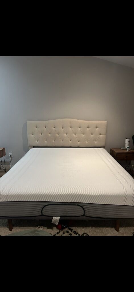 This bed is practically brand new! It’s always had a mattress protector on it so you don’t have to worry about our human selves all over it! We have to get a split king because me and my wife need different mattress types. If it wasn’t for that, we wouldn’t want to get rid of this at all!