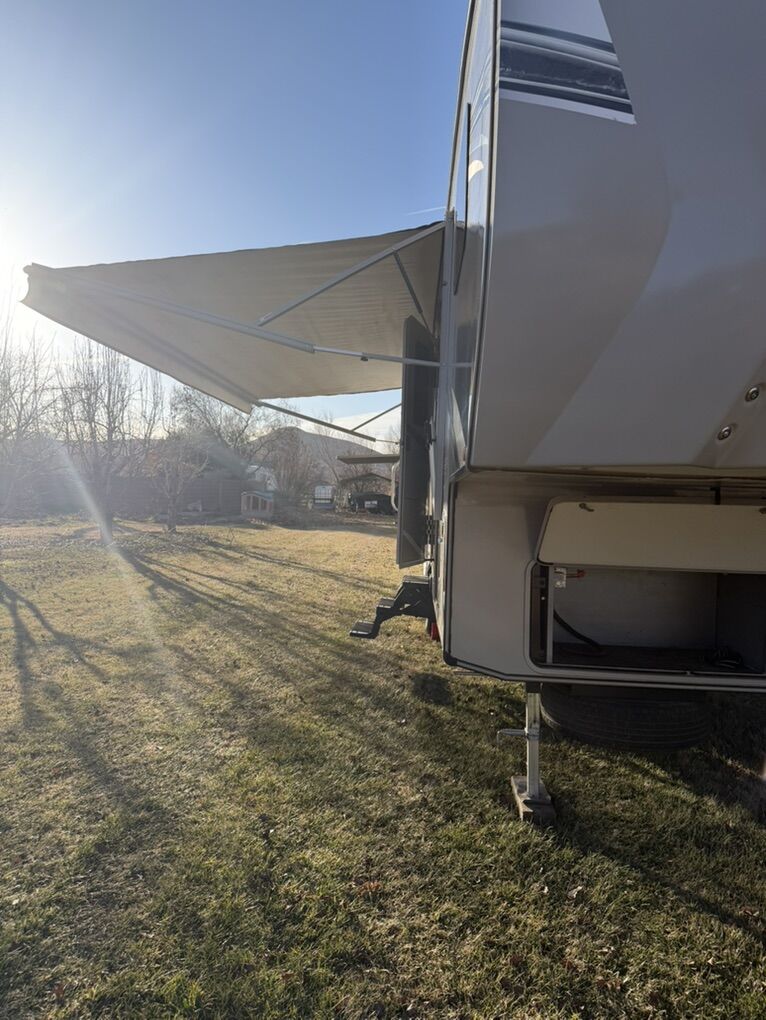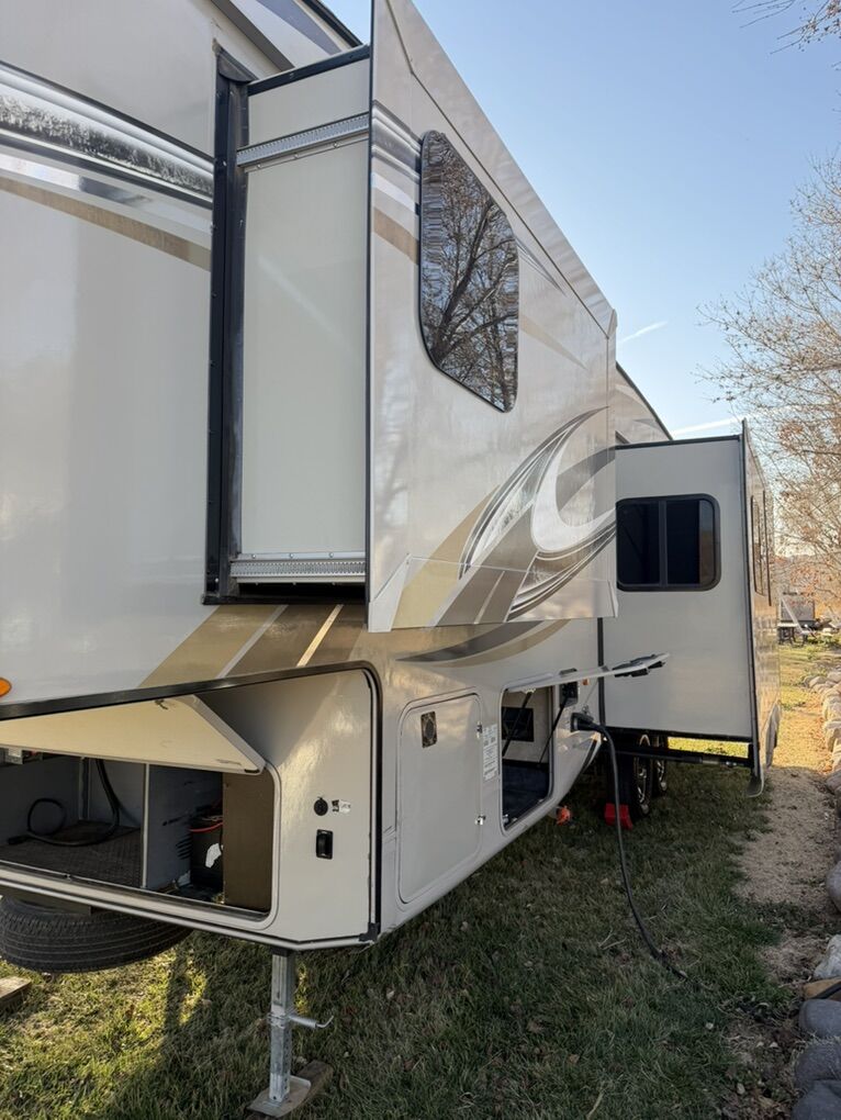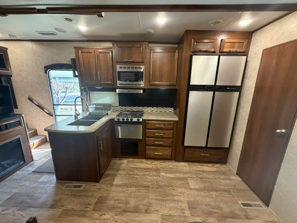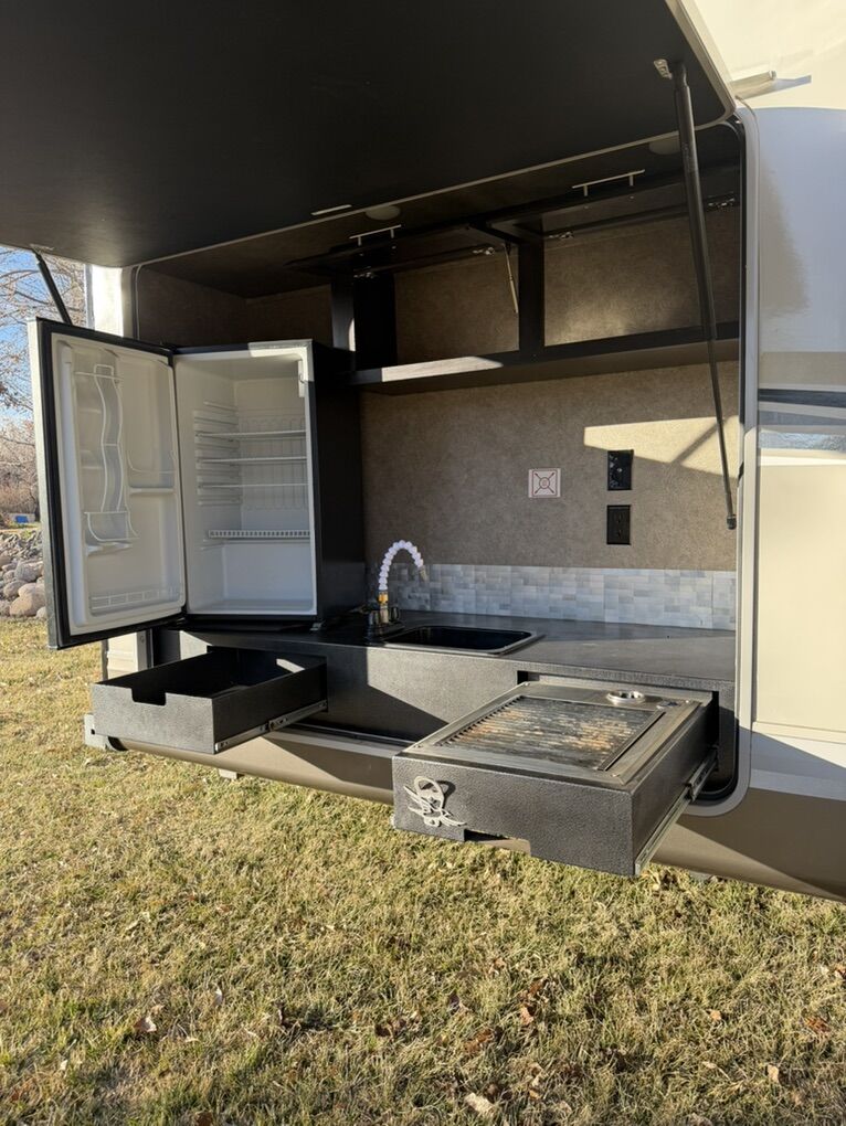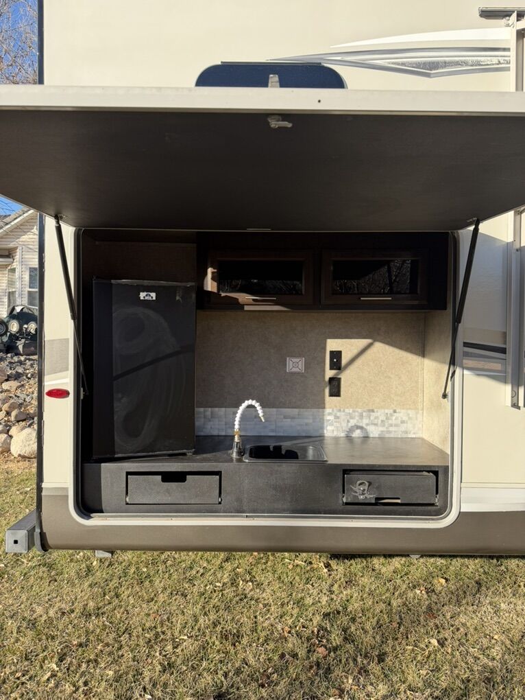 Specifications Floor Plan - See in pic. Large factory 4 door fridge. Back bunk house with door. Big under storage. Outside kitchen and shower. Sleeper sofa in living room area. Electric fireplace with remote. 2 TV’s and a Blu-ray Disc player. Set-up for solar plug-in. Roof does not leak.