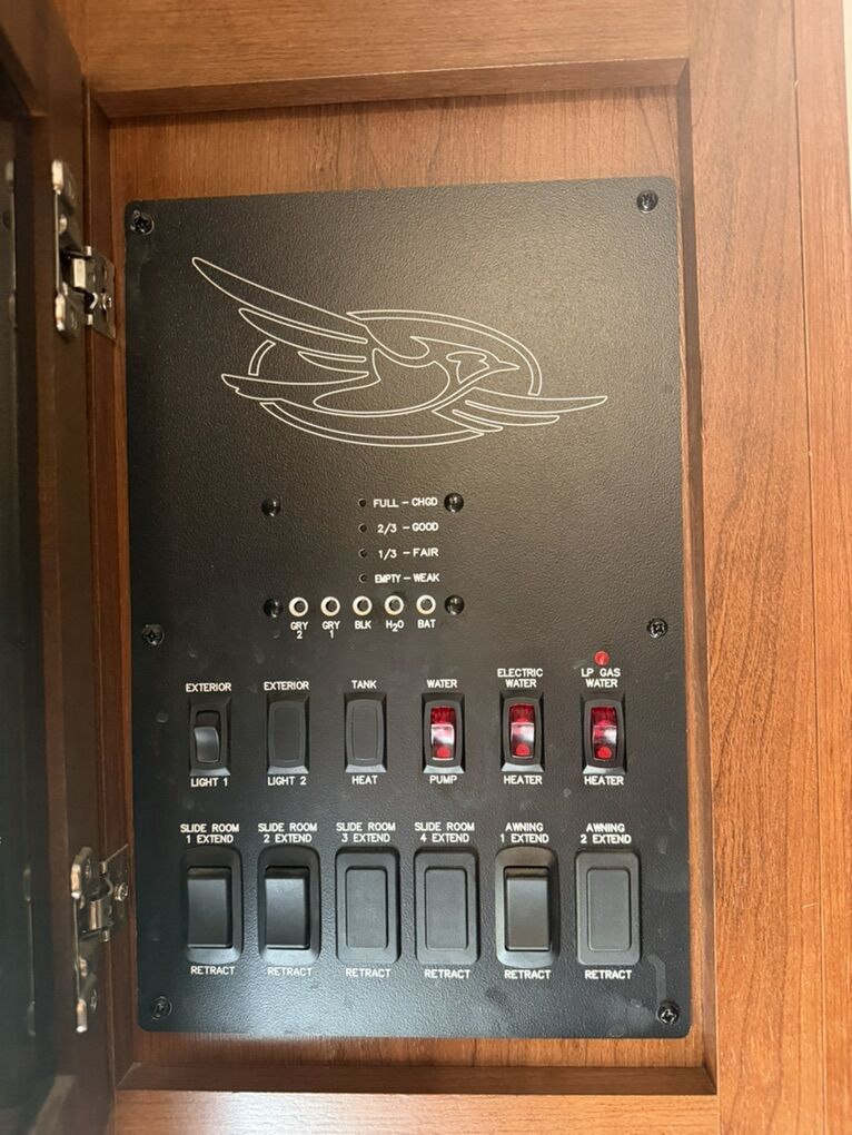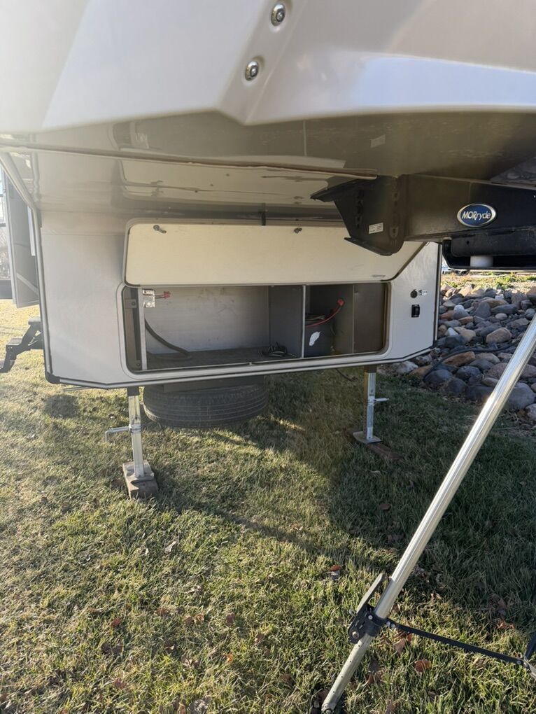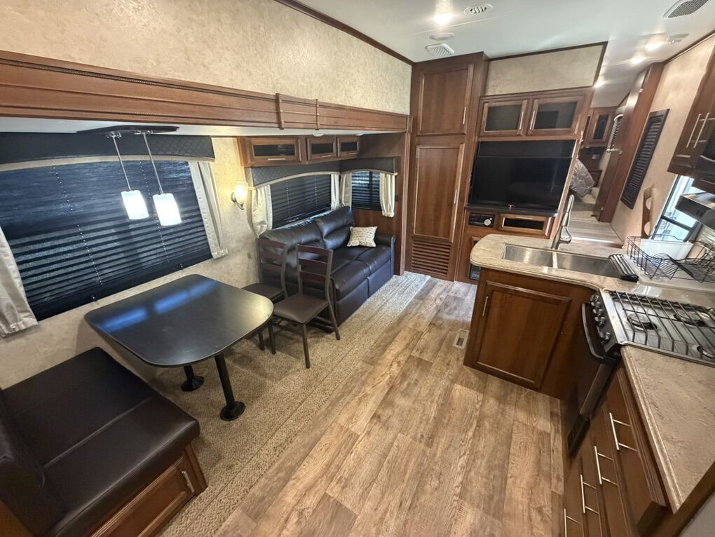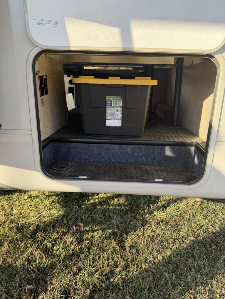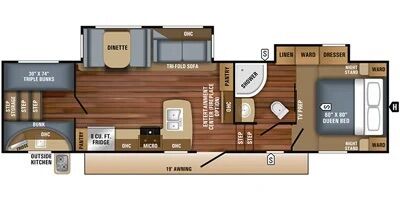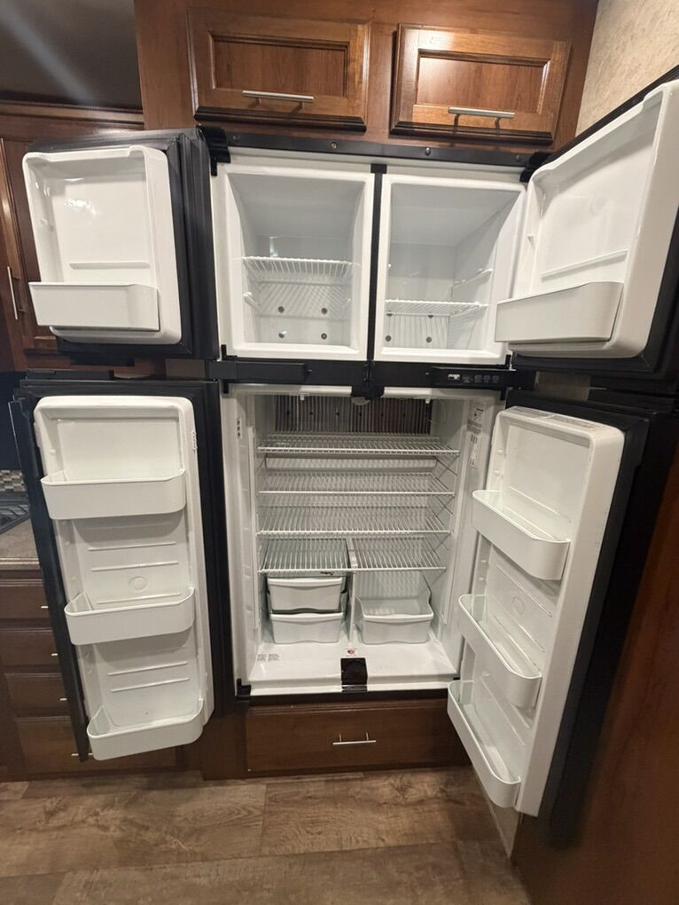 Specifications Floor Plan - See in pic. Large factory 4 door fridge. Back bunk house with door. Big under storage. Outside kitchen and shower. Sleeper sofa in living room area. Electric fireplace with remote. 2 TV’s and a Blu-ray Disc player. Set-up for solar plug-in. Roof does not leak.