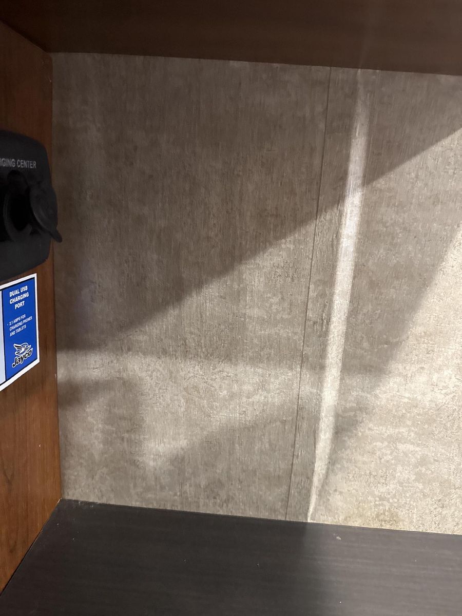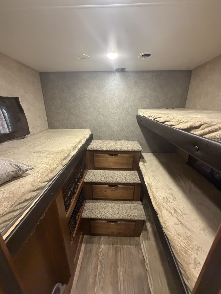 Specifications Floor Plan - See in pic. Large factory 4 door fridge. Back bunk house with door. Big under storage. Outside kitchen and shower. Sleeper sofa in living room area. Electric fireplace with remote. 2 TV’s and a Blu-ray Disc player. Set-up for solar plug-in. Roof has leaked.