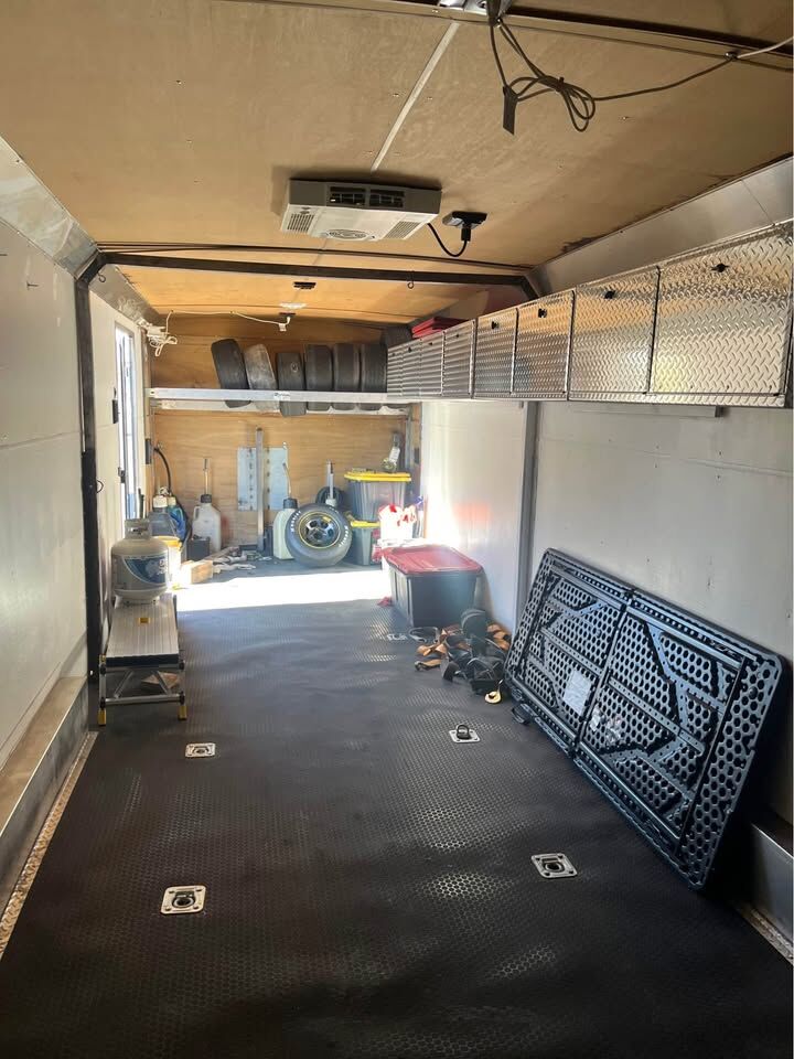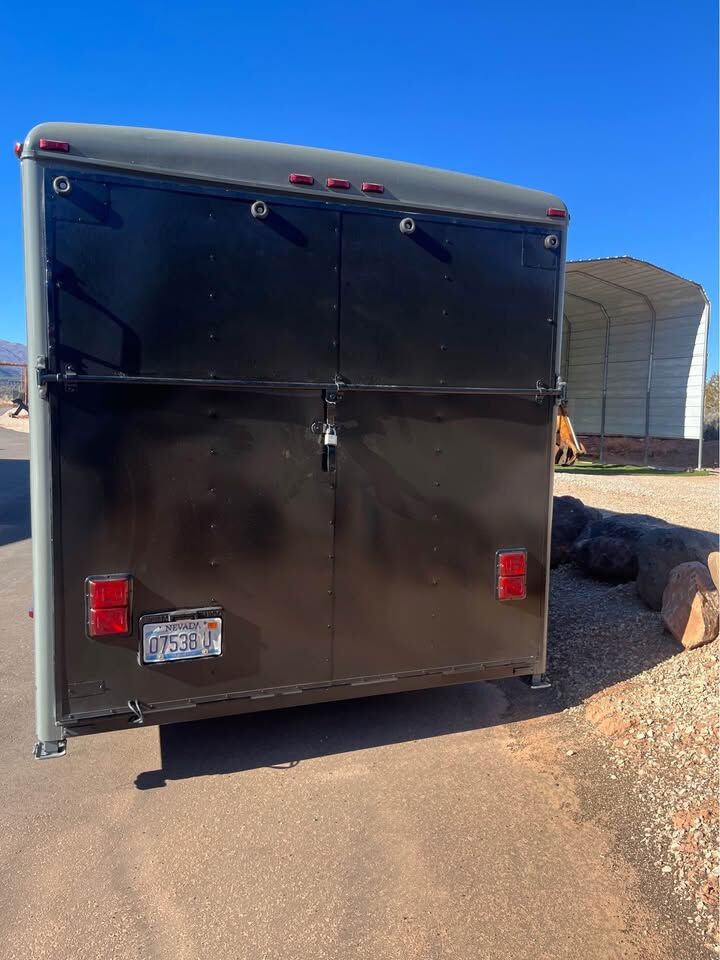 5 foot extended tongue, new 16”wheels and 14 ply tires, 6 lug, eight aluminum cabinets on the wall, winch, 12 V lights and outlets throughout, shore power cord, AC unit on roof, new LED clearance lights, new coin, rubber floor, 7 foot interior height and 27’10” on the floor. Electric tongue jack, Semi flat black in great condition. May consider trades. I’m looking for a Jeep or hot Rod. located just North of St. George Utah
