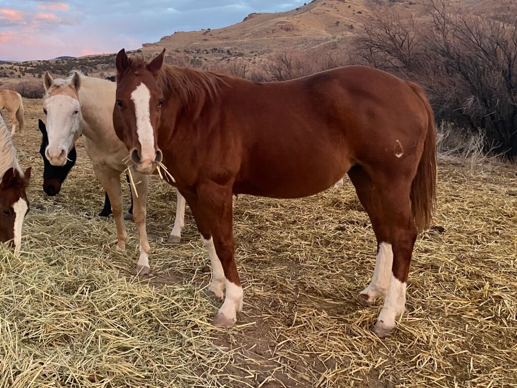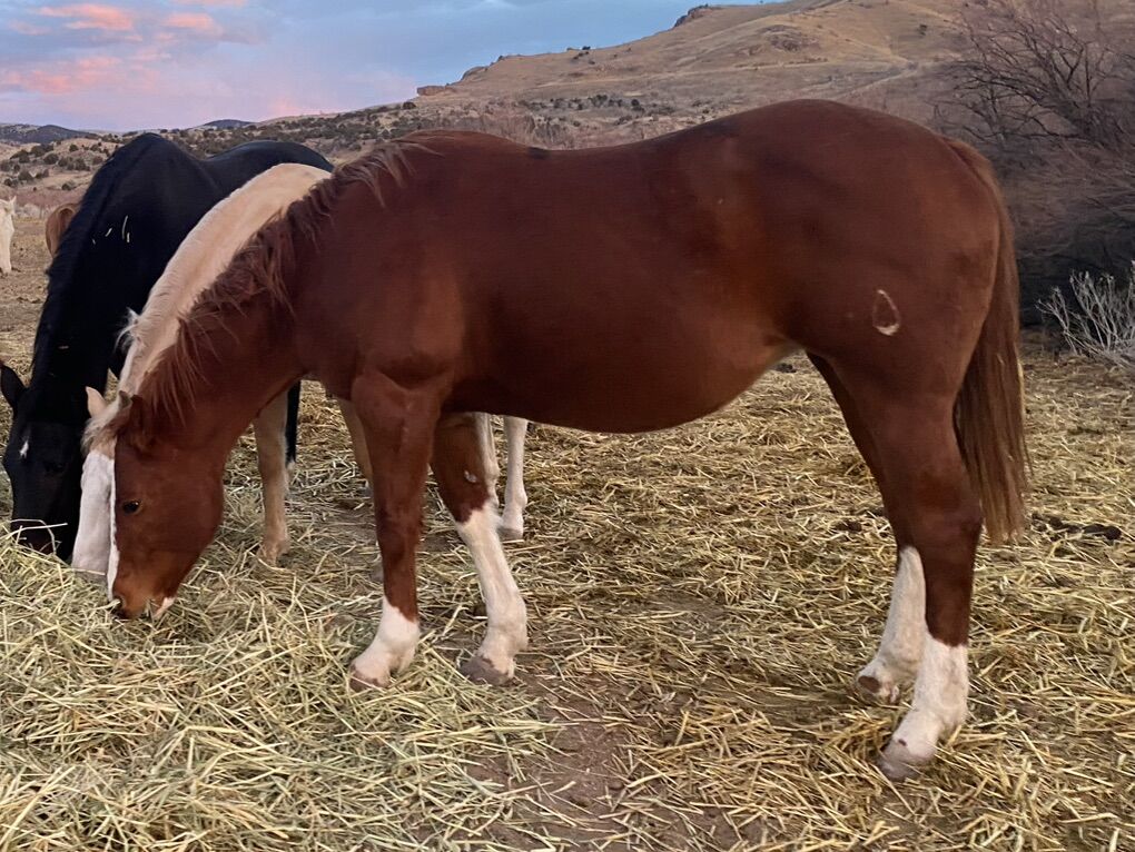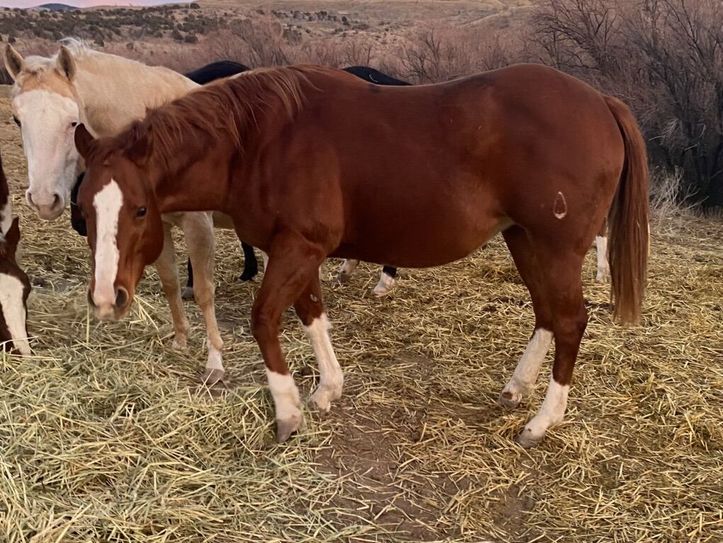 We are only selling her because we need to make more time for our kids and their horses. She is an excellent mare. We are selling her broodmare sound. She could potentially be broke to ride. Initially, I was going to keep her for my personal riding horse, but when she was three, she pulled her hock. It was sore and swelled up, so I laid her off for a year and never got back to her. The swelling is now gone and she moves around great.