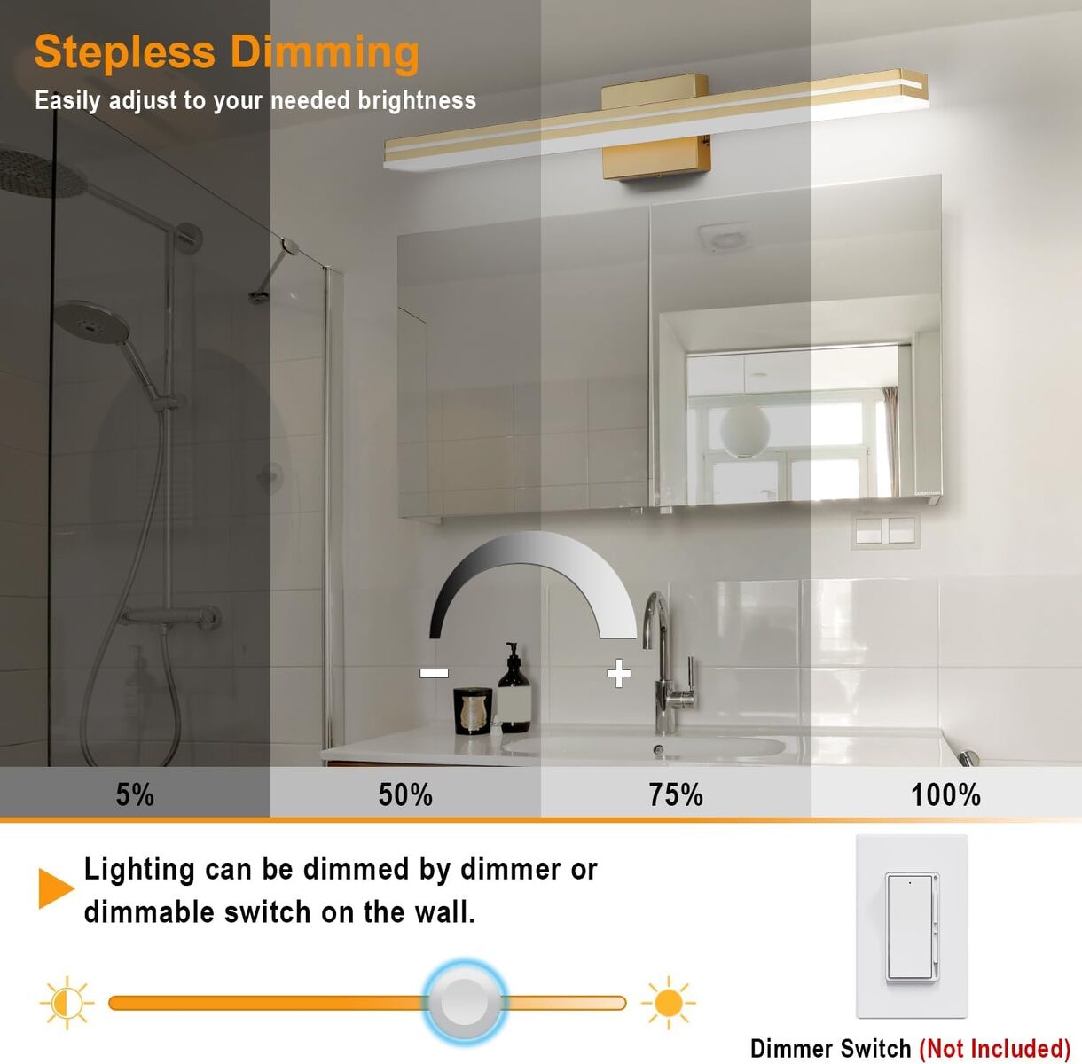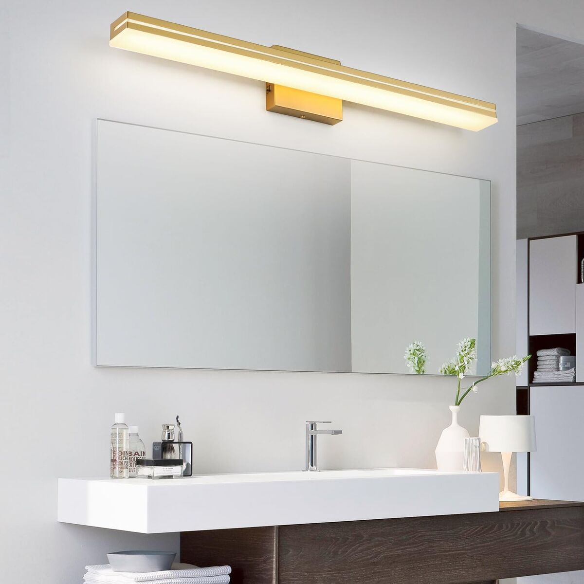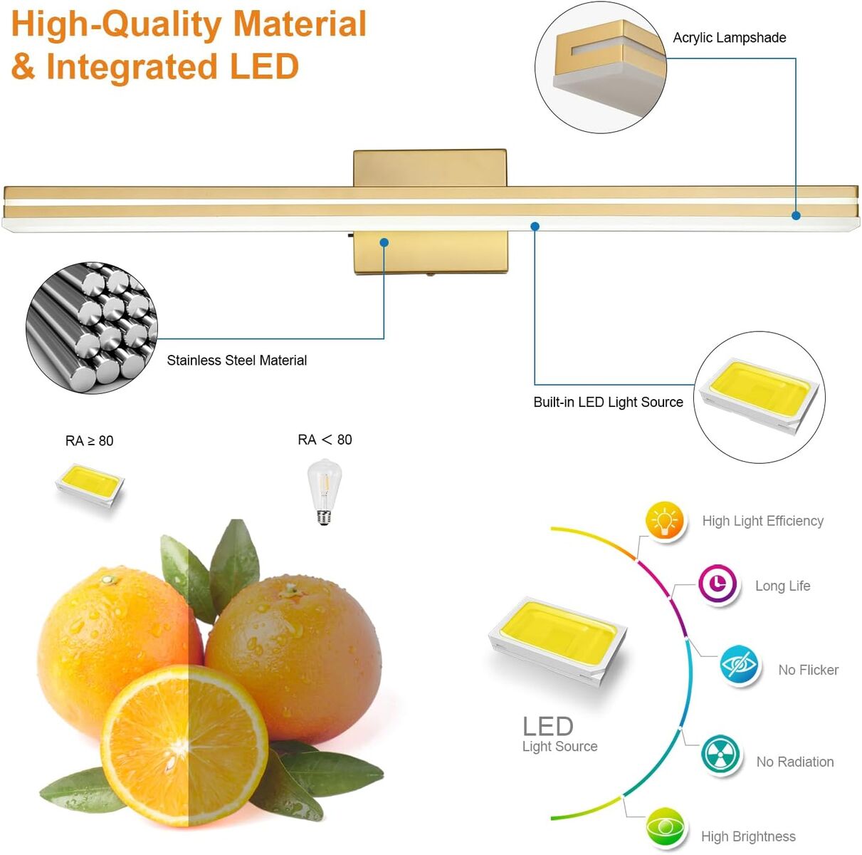 About this item - MaterialMetal Gold Frame with advanced electroplate craft and sealing technology, dust-proof, fog-proof, anti-corrosion and moisture-proof, suitable for humid environment. Frosted White Solid Acrylic Lampshade is rugged, durable and unbreakable, provides excellent down lighting without glare. Gives a great contemporary look to your master bathroom.