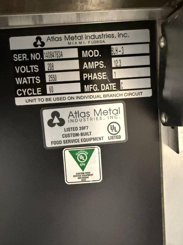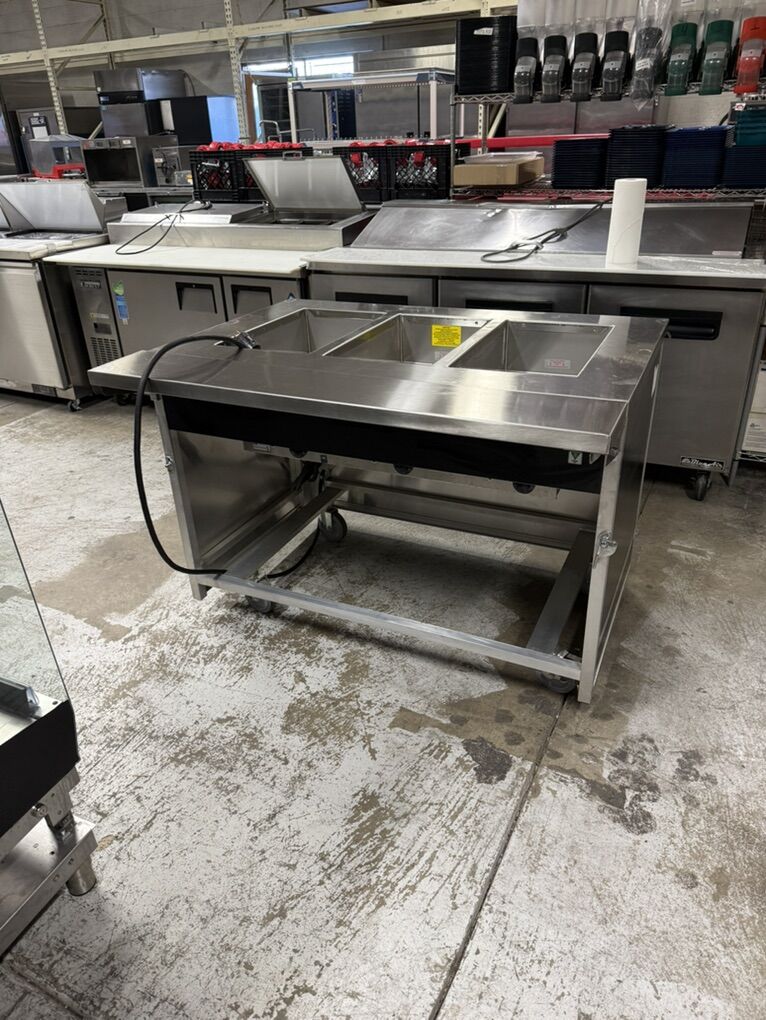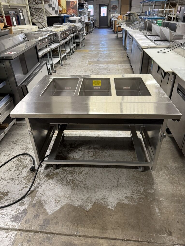 Electric 3 wells Atlas Metal Steam table with prep shelf next to new Stainless steel with wheels for easy moving Model#BLH3 208 volts single phase 2550 Watts 50”WX 30” D X 35” H with 8” prep shelf Stainless steel