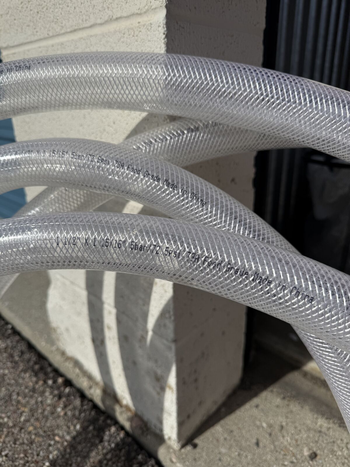1 1/2" x 1 15/16". 5bar/72.5psi. 73A Food Grade PVC. Extra that we haven't used. Not sure how much exactly.
