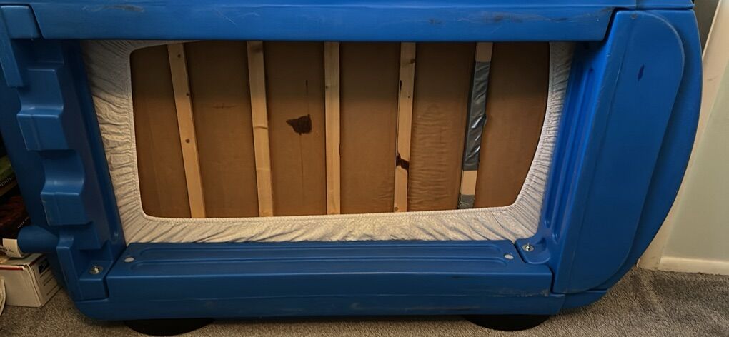 VenmoLittle tykes car bed with toddler mattress. I bought this for my son but he never used it and it’s just taking up space. The board underneath is a little beat up but it still holds. Just asking what I paid for it!