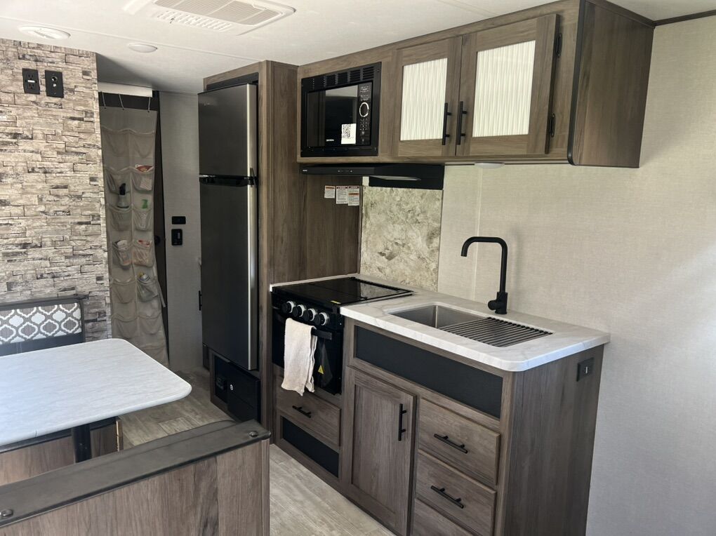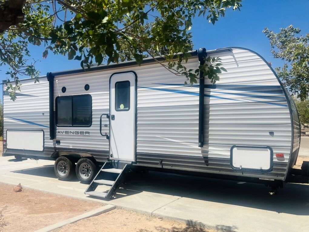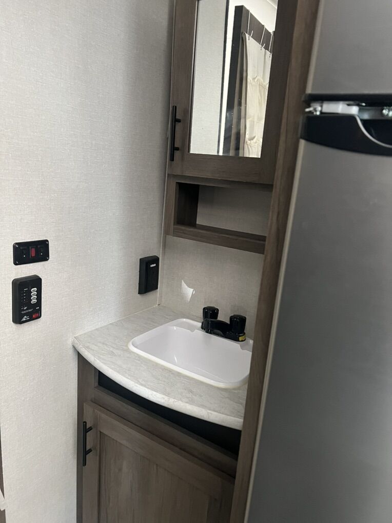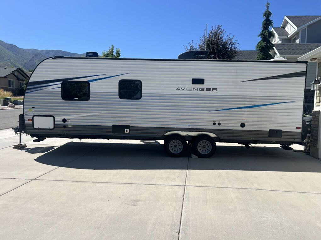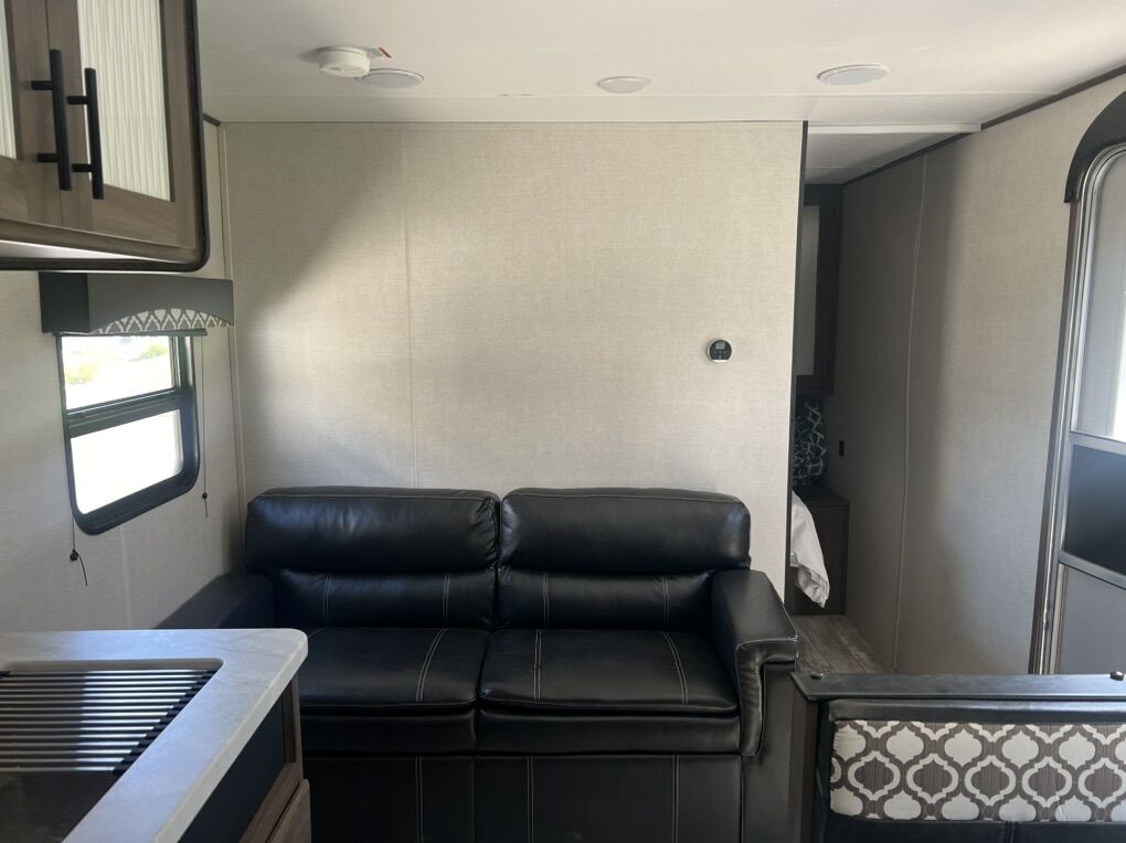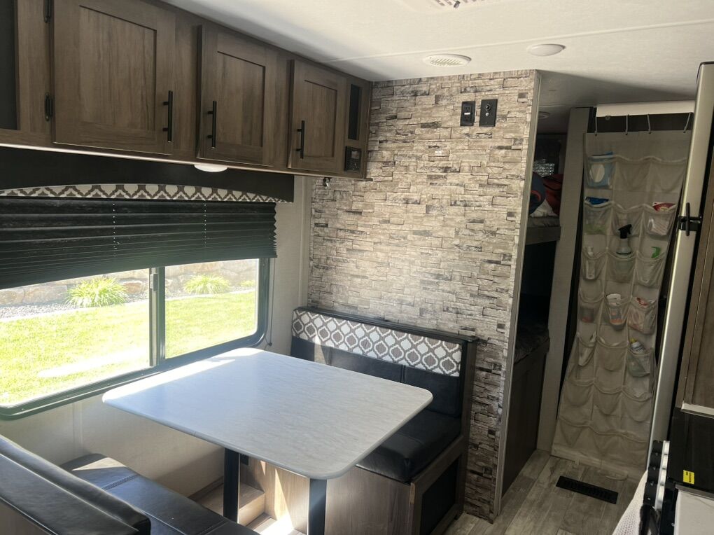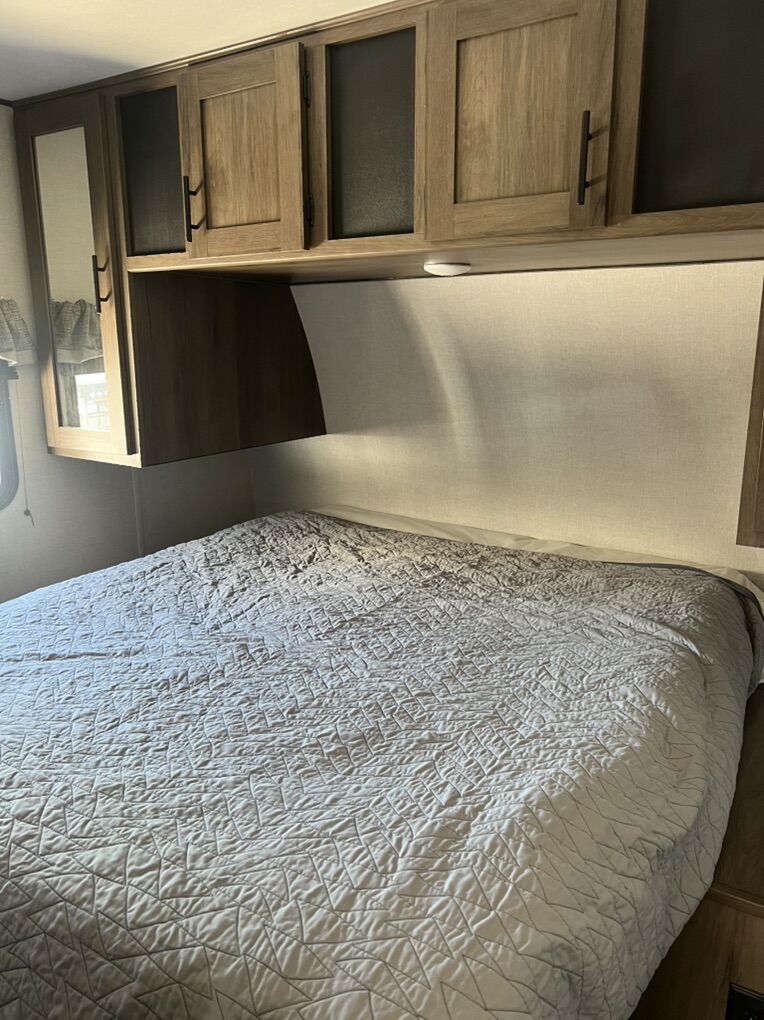 You will love this amazing trailer! It is in excellent condition and perfectly clean. We have only used it a handful of times since we have had it. We have loved this trailer, but are looking to sell as we are too busy to find time for camping trips at the moment. Highlights include double size bunks, sleeper sofa, private bathroom, booth dinette that converts to a bed, a private bedroom, outdoor kitchen, exterior speakers, good amount of storage space. Room to sleep 8 people. The exterior includes an aerodynamic smooth front metal, a diamond plate from rock guard for protection on the road, and 4 stabilizer jacks to keep your unit secure. The interior offers a 15,000 BTU air conditioner for the perfect climate inside, in-floor ducted heat.