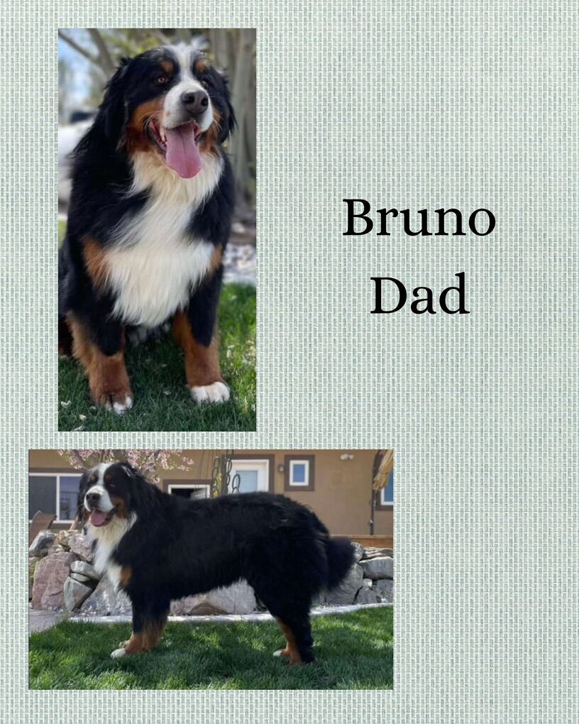 Bruno (sire) is a healthy, sturdy 105-lb AKC-registered Bernese Mountain Dog and is the best stud dog I have ever used. He was imported directly from the Czech Republic and represents everything a male Bernese Mountain Dog should be. He is strikingly handsome and comes from championship lines—truly a show-quality dog. Bruno has completed DNA, OFAS and PennHip testing, with all results clear and no known diseases. He is intelligent, loyal, gentle, and affectionate, enjoys outdoor play, and is wonderful with children and family.