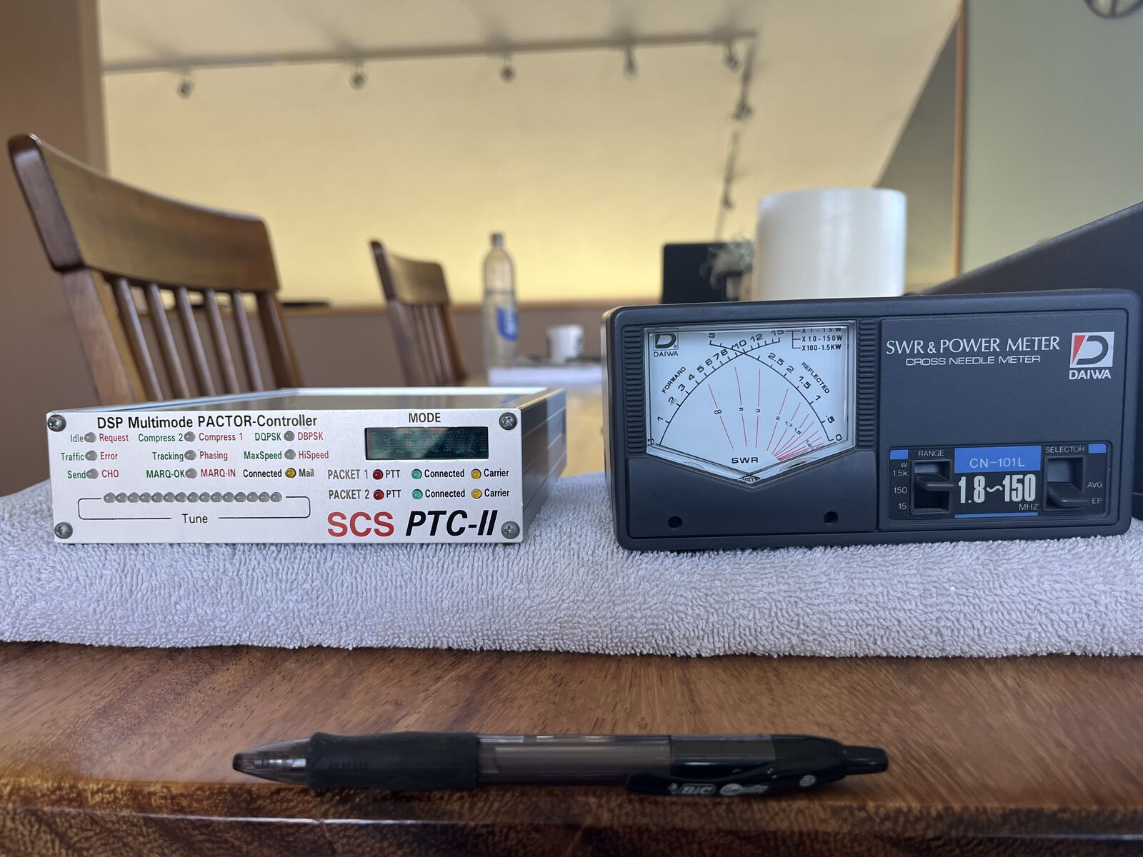 ICOM IC-M710 marine single side band (SSB) radio with ICOM AT-130 Automatic Antenna Tuner, Daiwa SWR+ Cross Needle Power Meter (CN-101L) and Pactor PTC II modem