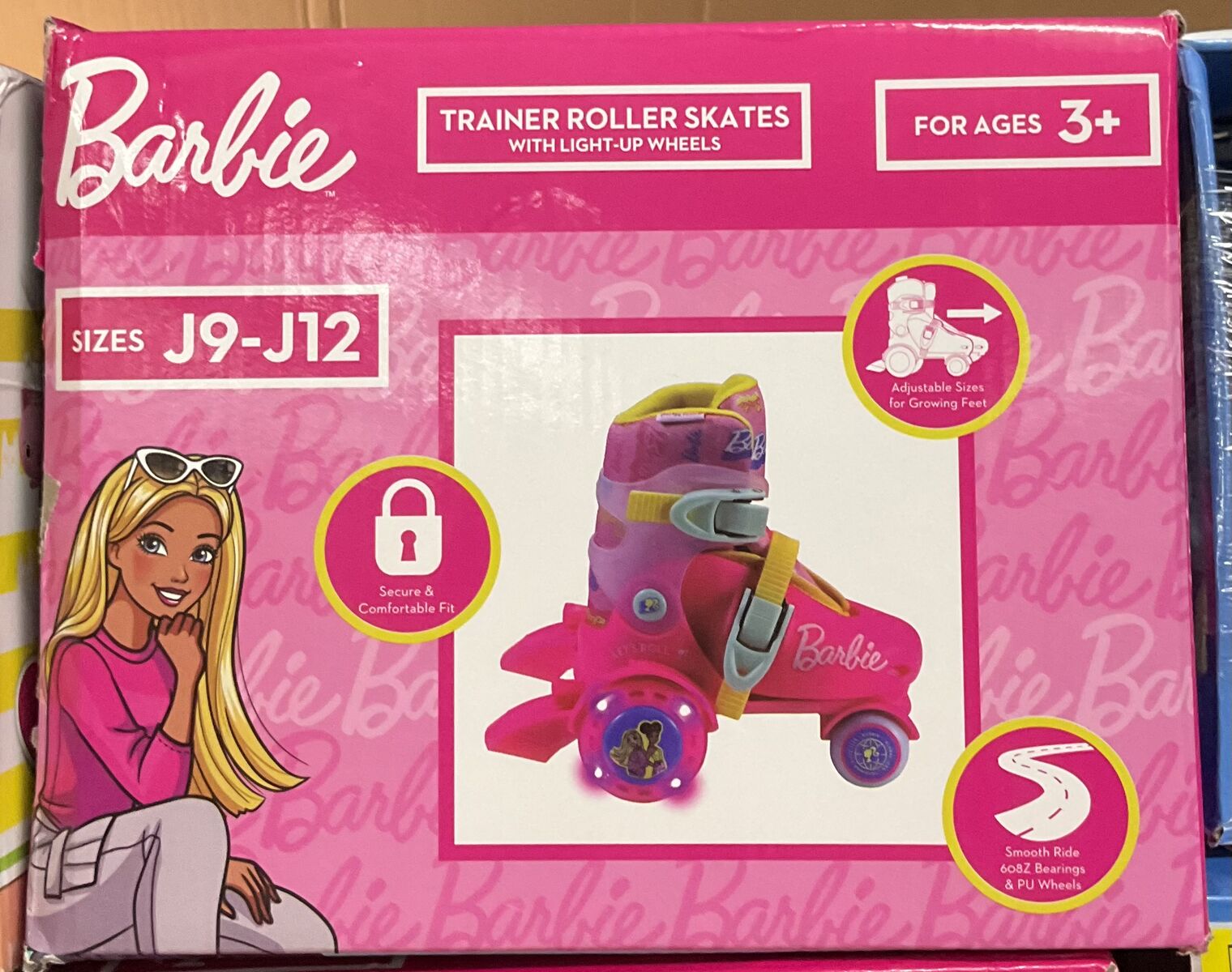 Barbie-themed trainer roller skates sized for kids ages 9–12. Designed to help young skaters build confidence and balance with extra support. Fun and stylish for outdoor play, easy to adjust, and perfect for beginners.