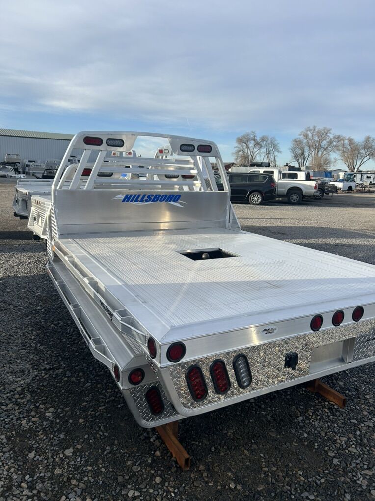 Hillsboro 2000 series flatbed 7X8.6 for single wheel longbed Extruded aluminum floor Rub rail and pockets on sides LED lights Gooseneck hitch