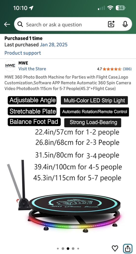 ZelleHi! I am selling my 360 Photo Booth with its platform cover, flight case + extras. If you want to start or expand a 360 Photo Booth business this is great option! This is the 45.3” inch version that can fit 5-7 people. I bought it Jan 2025 and only used it 3 times. Feel free to ask me any questions and/or if you’d like to come check it out in person before making a decision! Thanks!