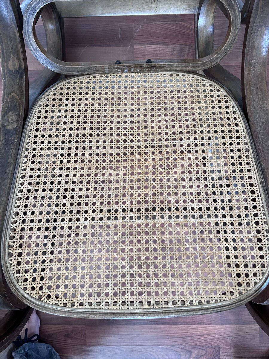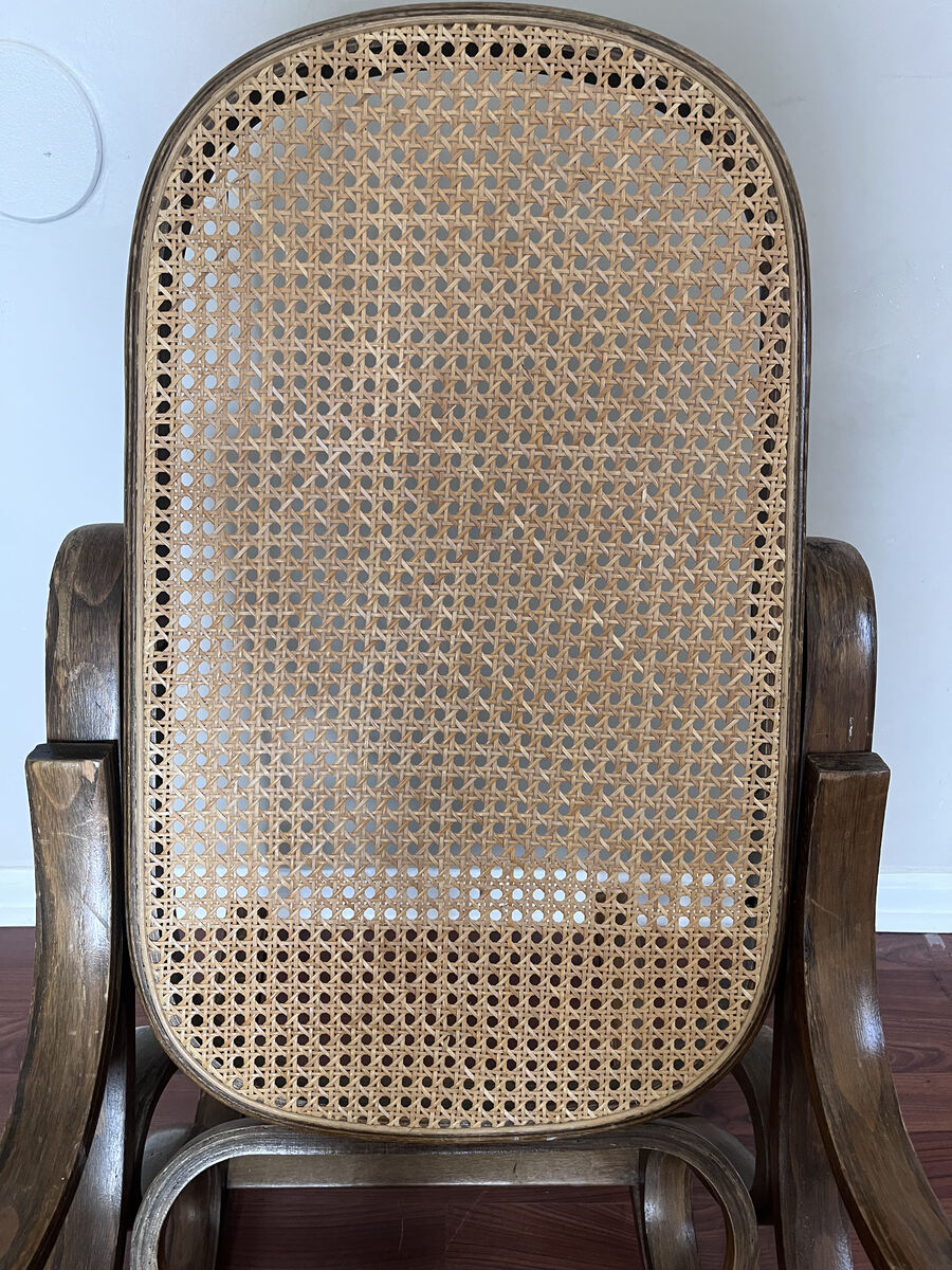 VenmoBeautiful thonet style vintage wood rocking chair with spiral design. Love this chair so much but don't have enough room to enjoy it. Wood could use a refinish, and there is some light wear on the rattan (see pictures). Similar styles msrp $1500-2000, ebay $300-500. Please msg with any questions!
