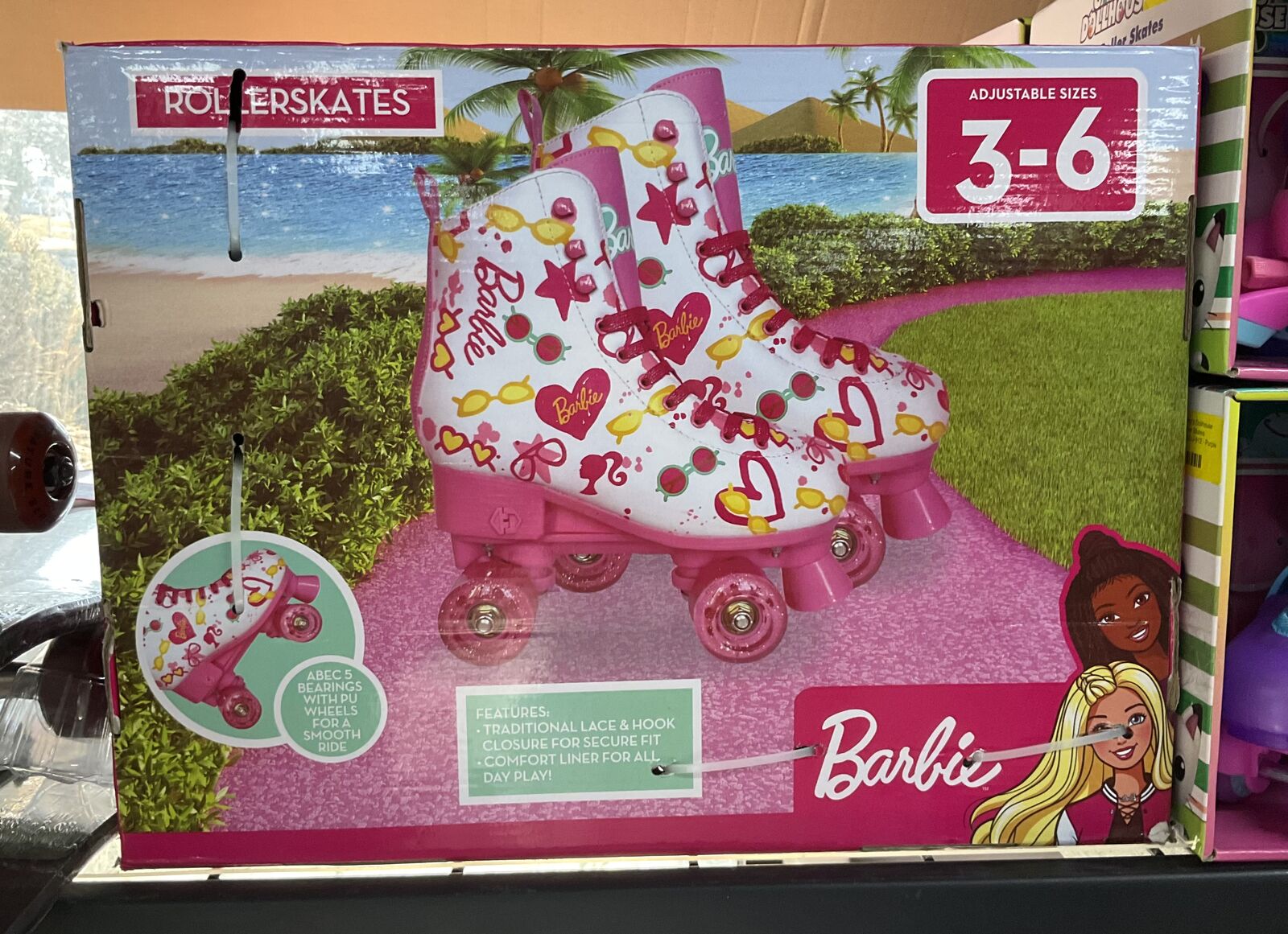 Barbie-themed roller skates in size 3–6, perfect for young kids ready to roll! Stylish design and supportive build make them great for outdoor play and beginner skating fun.