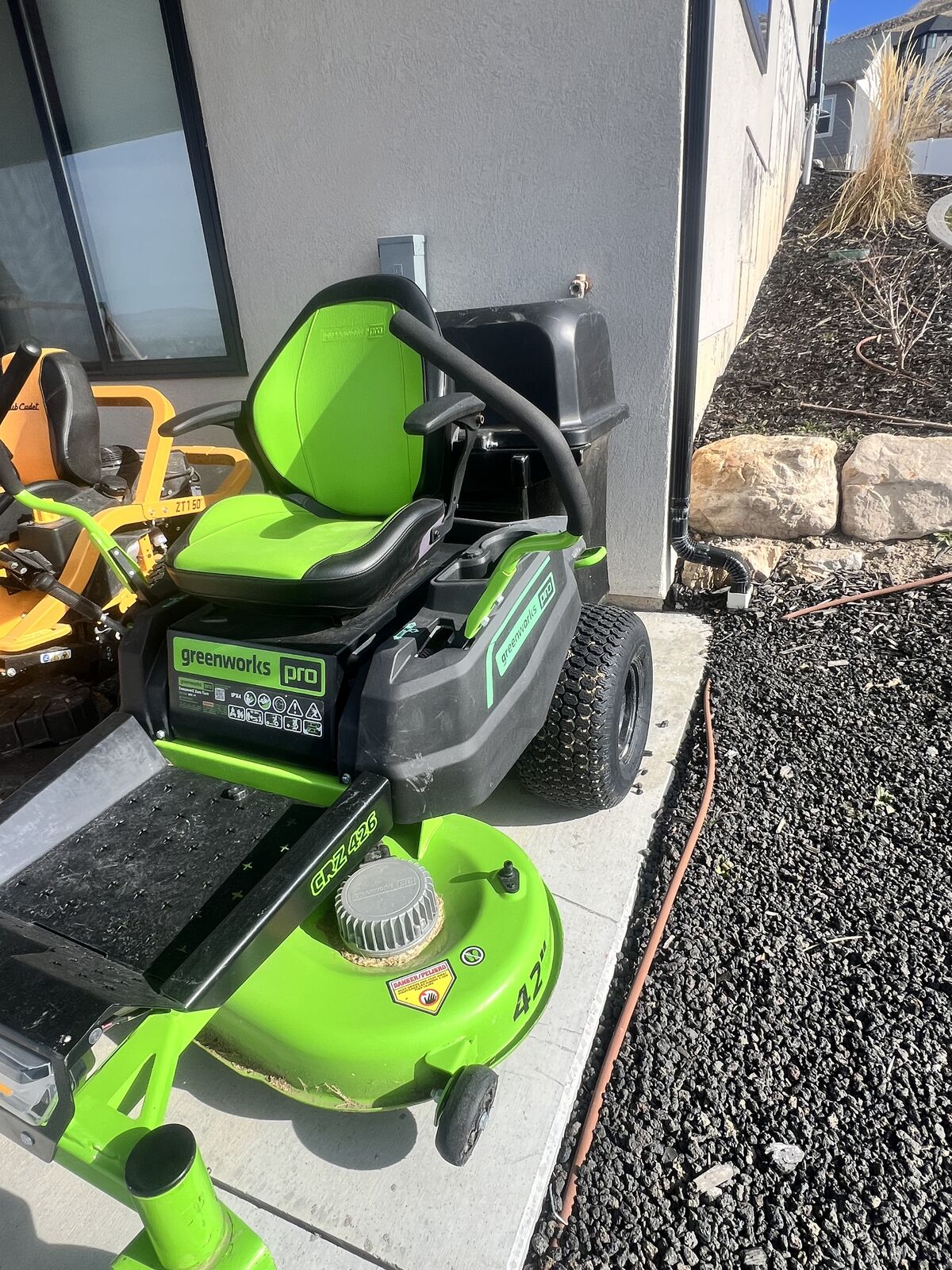 Greenworks zero turn mower with bagger attachment and 6 batteries and charger