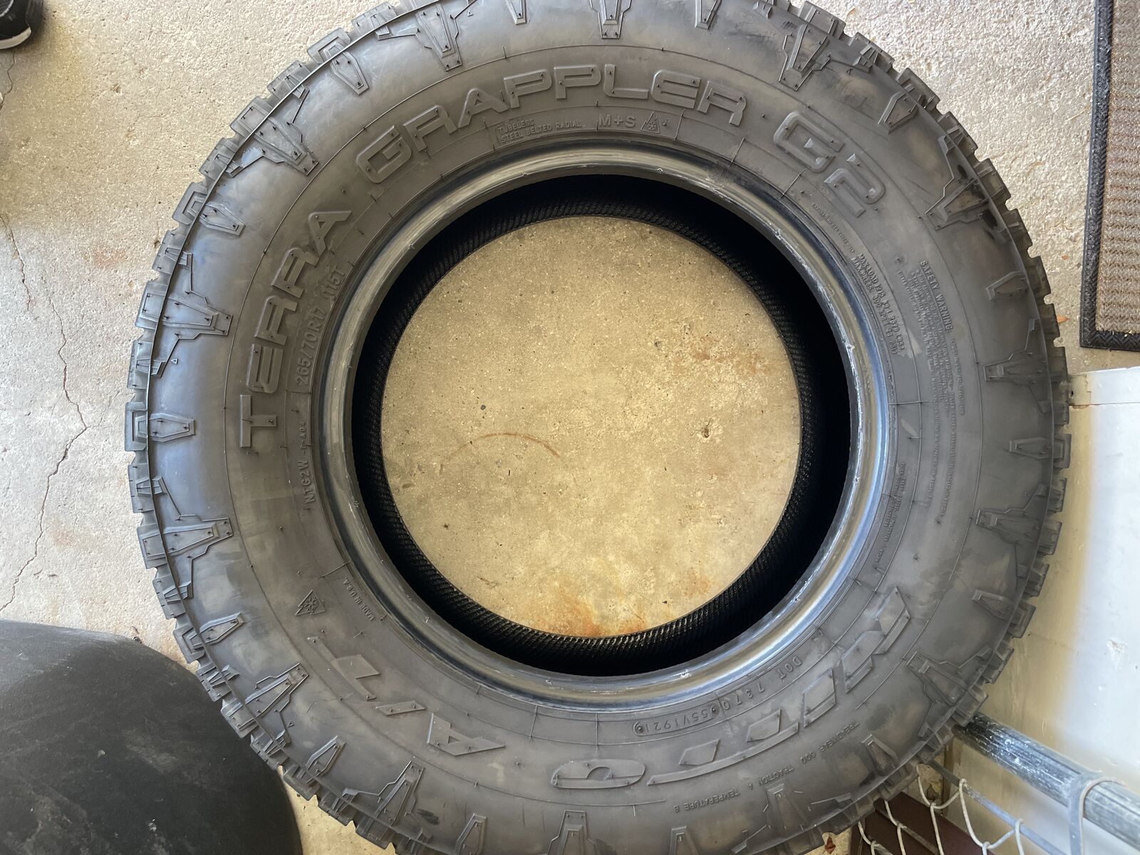 All weather tires in excellent condition. Nitto Terra Grappler, Size: 265/70R17. Tubless Steel Belted Radial Tires. $60.00 each . $240.00 for all 4 tires or BEST reasonable offer. Cash only. 801-913-9744 via text or call.