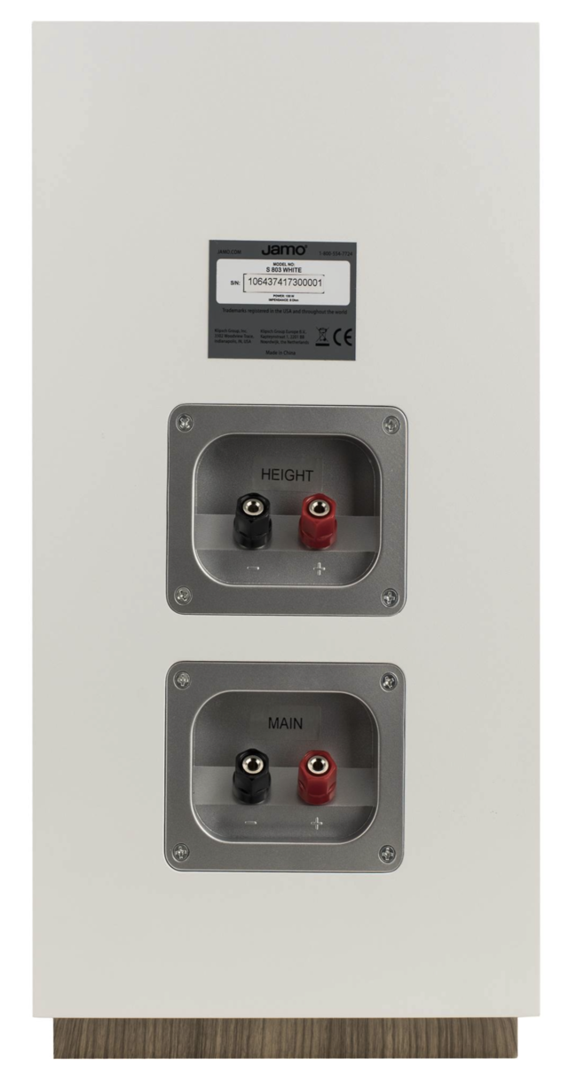 5.0 home theater speaker system system frequency response 57-26,000 Hz (±3dB) removable magnetic grilles bass-reflex (ported) enclosures binding post speaker terminals (2x) Jamo S 803 bookshelf speakers: frequency response: 57-26,000 Hz (±3dB) recommended amplifier power: 80 watts sensitivity: 87 dB impedance: 8 ohms 1" soft dome tweeter with an integrated waveguide for focused high frequencies 5" polyfiber woofer for punchy midrange and bass metal fasteners on top of each speaker serve as a connection point for optional Jamo S 8 ATM Dolby Atmos® upward-firing speakers this allows for a neat, clean install since no speaker wire needs to be run to the speaker "toppers" binding post speaker terminals for main and Atmos channels 6-9/16"W x 13-15/16"H x 9-15/16"D (2x) Jamo S 801 bookshelf speakers: frequency response: 76-26,000 Hz (±3dB) recommended amplifier power: 60 watts sensitivity: 85 dB impedance: 8 ohms 1" soft dome tweeter with an integrated waveguide for focused high frequencies 4" polyfiber woofer for punchy midrange and bass 5-9/16"W x 11-5/16"H x 6-7/16"D Jamo S 81 CEN center channel speaker: frequency response: 71-26,000 Hz (±3dB) recommended amplifier power: 60 watts sensitivity: 86 dB impedance: 8 ohms 1" soft dome tweeter with an integrated waveguide for focused high frequencies dual 4" polyfiber woofers for punchy bass and midrange 17-13/16"W x 7-1/4"H x 8-11/16"D