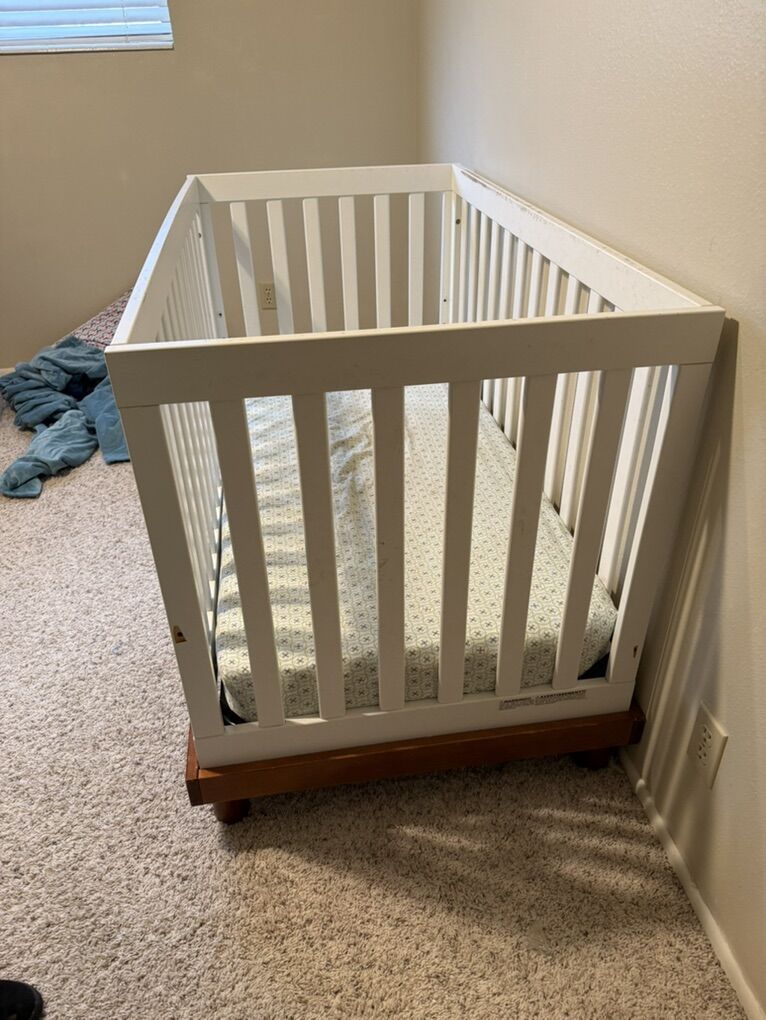 Can convert to a toddler bed. It’s been through a few kids and could use a good clean but it’s solid wood and cute. Crib only, no mattress