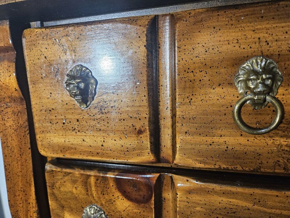 VenmoThis furniture set appears to be a vintage bedroom collection in a colonial revival style, blending elements of Chippendale and Hepplewhite influences from the 18th century, but as a modern reproduction. It's constructed from solid wood (likely pine or a similar softwood, given the visible knotty grain and warm, reddish-brown stain with a glossy varnish finish), featuring ornate brass hardware including bail handles (swinging drop pulls with decorative backplates) and lion head ring pulls. The overall design includes raised panel drawers, dentil molding along the top edges, serpentine or shaped fronts on some pieces, and ogee bracket feet for a traditional, elegant look. These pieces show signs of use, such as minor surface scratches and patina on the hardware, but is well-maintained. One dresser pull is missing a pull ring.