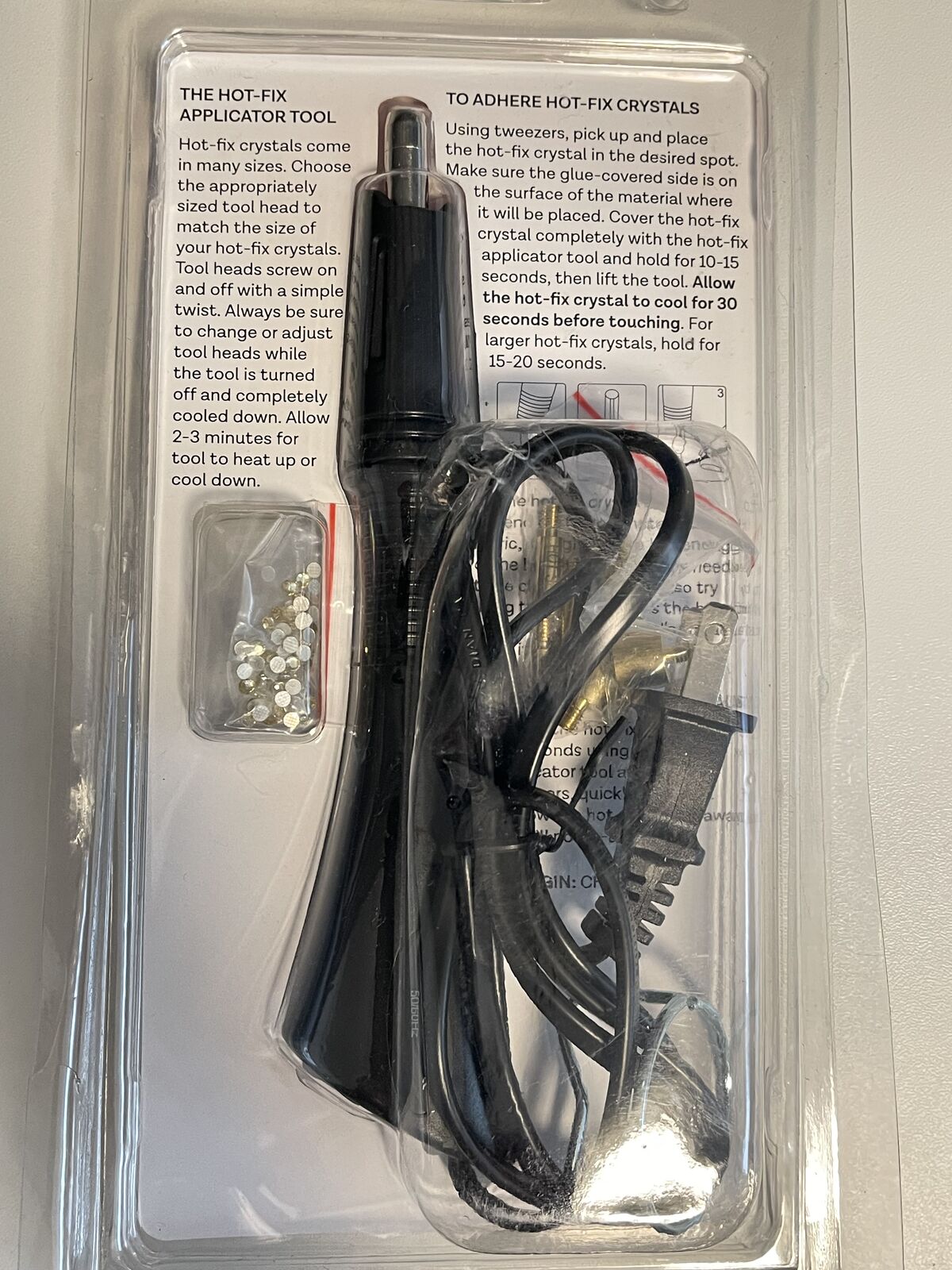 7 different temovable tips, package of crystals, adheres to fabric, felt, chiffon, Mylar, wood, velveteen, embroidery, leather, etc. Priced to sell.