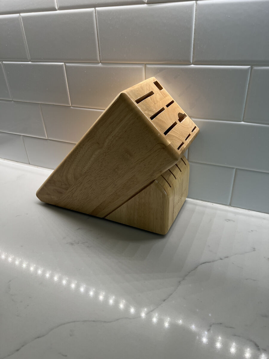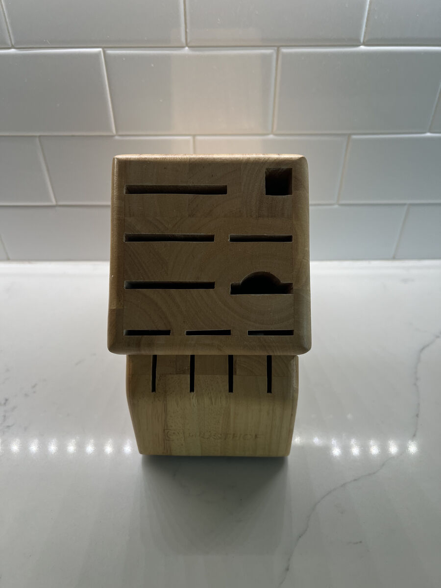 VenmoBrand new solid wood Wusthof knife block with a total of 13 slots including room for kitchen shears, a knife sharpener, chef's knife, utility knife, carving knife, bread knife, 3 paring knives, and 4 steak knives. Retails for $70