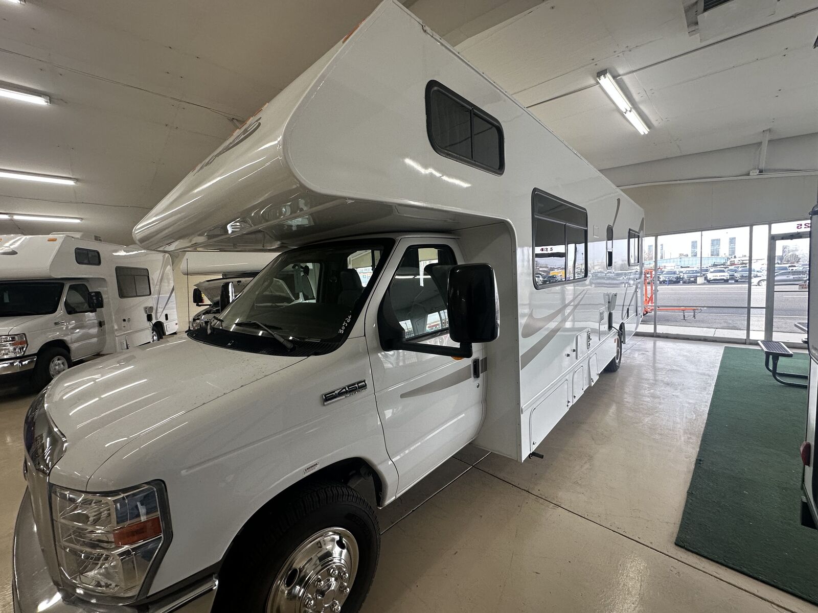 SPECIFICATIONS • Ford Chassis E450, Triton 6.8 V10 engine • Generator: 4000 KW Onan Microquiet • Fuel Tank Capacity: 55 gal. • Fresh Water Capacity: 40 gal. • LPG Capacity: 12.2 gal. • Grey/Black Tank Capacity: 24.5 gallons each • Hot Water Capacity: 6 gal. • Gross Vehicle Weight Rating (GVWR): 14,000 lbs. • Exterior Length/Height/Width: 30’/8.5'/10.7' CHASSIS FEATURES • 4-Wheel ABS Brakes • Cruise Control • Air Conditioning • Power Steering • Tilt Steering Column • Full Size Spare • Power Windows • Power Door Locks • Power Exterior Mirrors • Emergency Start Switch • Trailer hitch • Velvac Electric Side view Mirrors • Tow-Haul Mode • 12 Volt Auxiliary Dash Plugs • Auxiliary Input • AM/FM/CD Player COACH FEATURES - Built by Thor Motor Coach • Majestic Graphics Package • Microwave Oven • 3-Burner Gas Range • LP Gas Hot Water Heater DSI • 25,000 BTU Furnace • Commercial Grade Upholstery • Stainless Steel Kitchen & Bath Sinks • Refrigerator/Freezer (Propane/Electric) • Central Vehicle Monitor Panel • Integrated Entry Door Steps • LED Interior Lighting • Massive Exterior "Basement" Storage • 13.5 BTU Rooftop Air Conditioner COACH CONSTRUCTION • Laminated Rubber Roof • All Water-Resistant Composite Roofing (Prevents Water Damage) • High Density Insulated Wall • Gel-Coat Exterior Sidewalls (Prevents delamination) SAFETY FEATURES • Driver & Passenger Front and Side Air Bags • Fire Extinguisher • Carbon Monoxide Detector • Smoke Detector • Propane Detector
