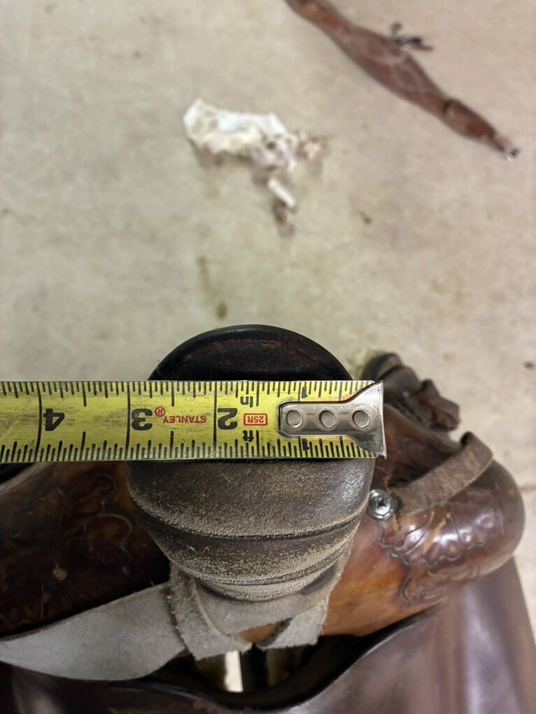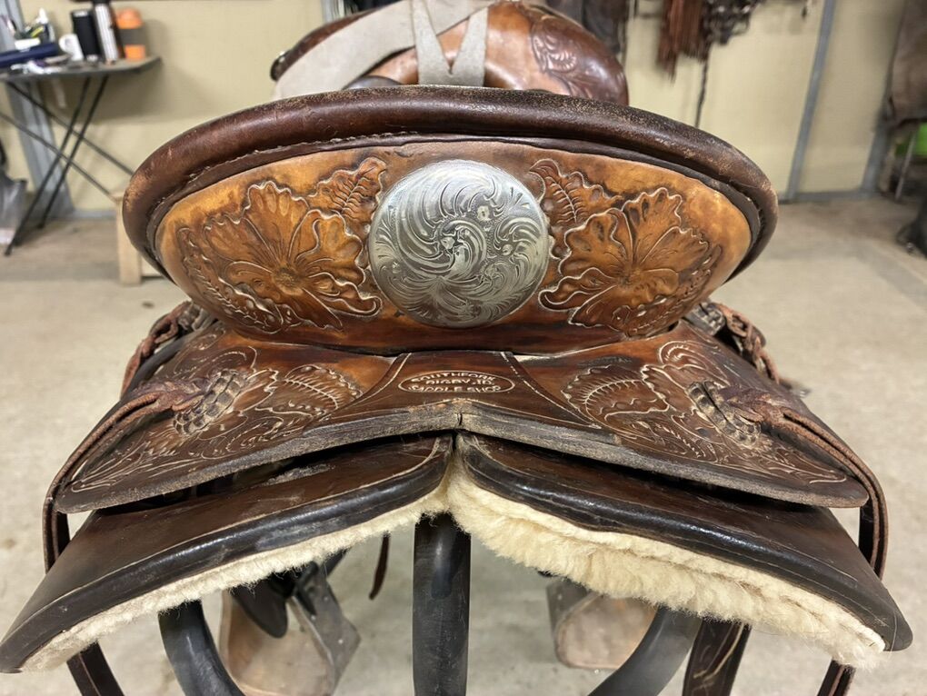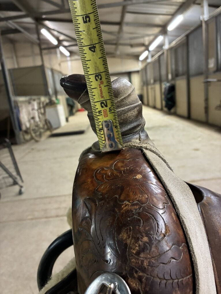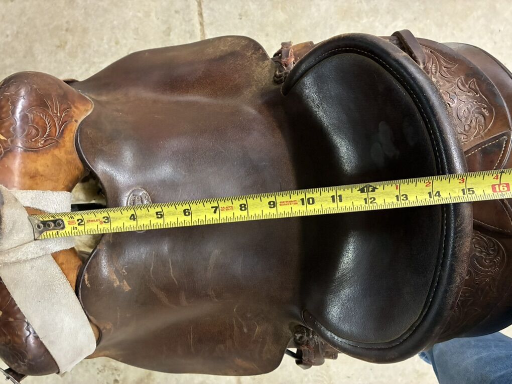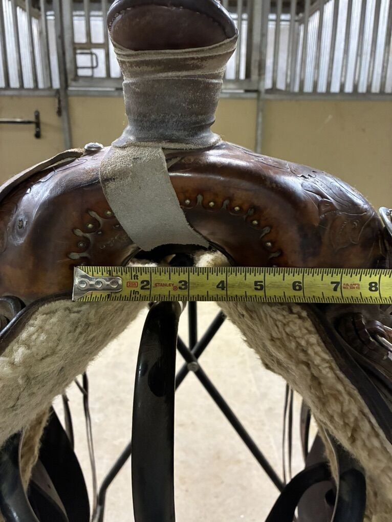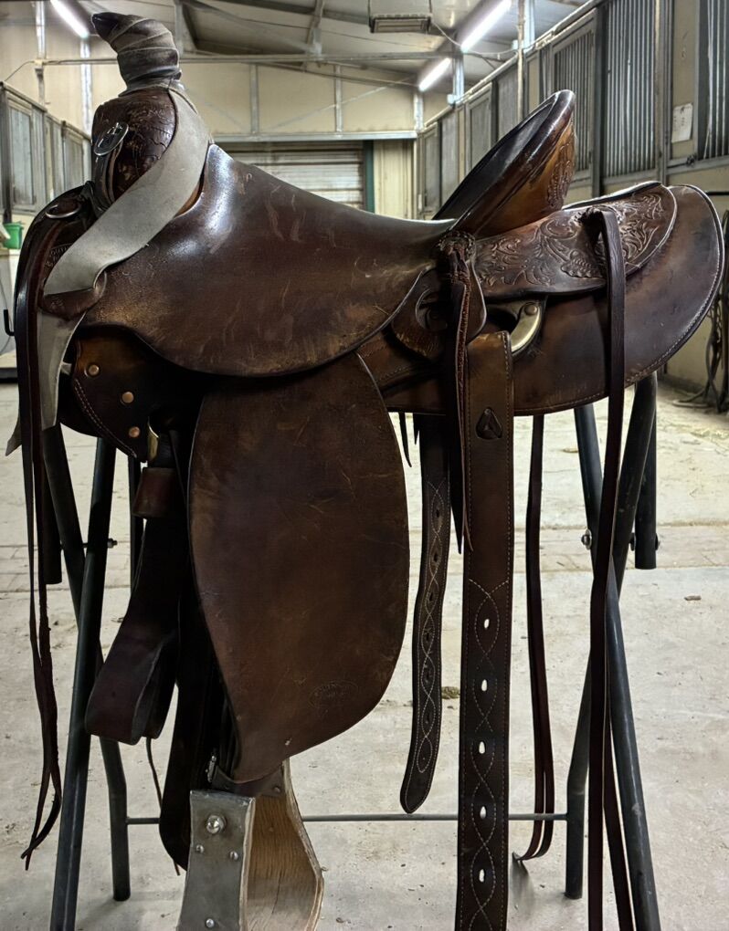 Zelle14 1/2” Stamped SouthFork Saddle Shop, built by Dustin Henderson in Rigby, ID. Solid tree and super comfortable. Fits narrower horses best. Stirrups not included Buyer pays shipping $1800