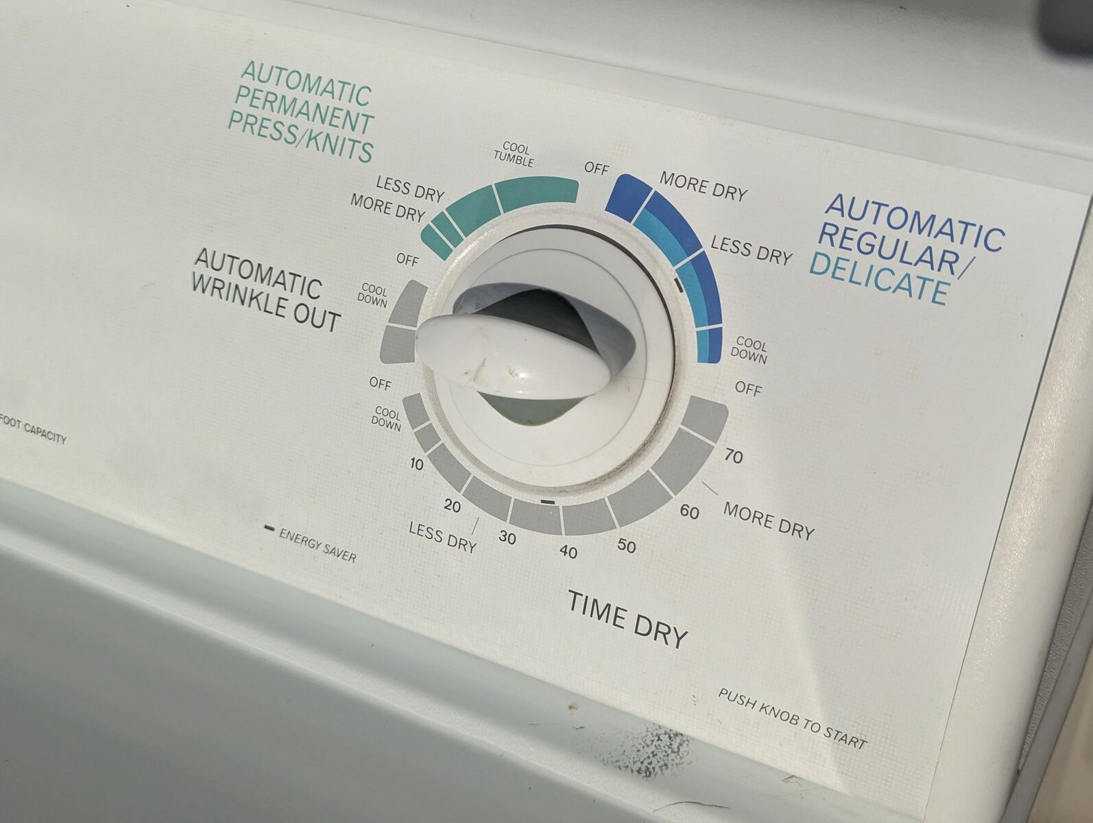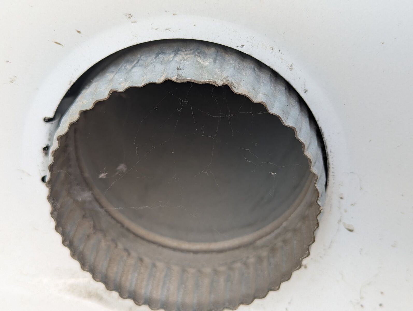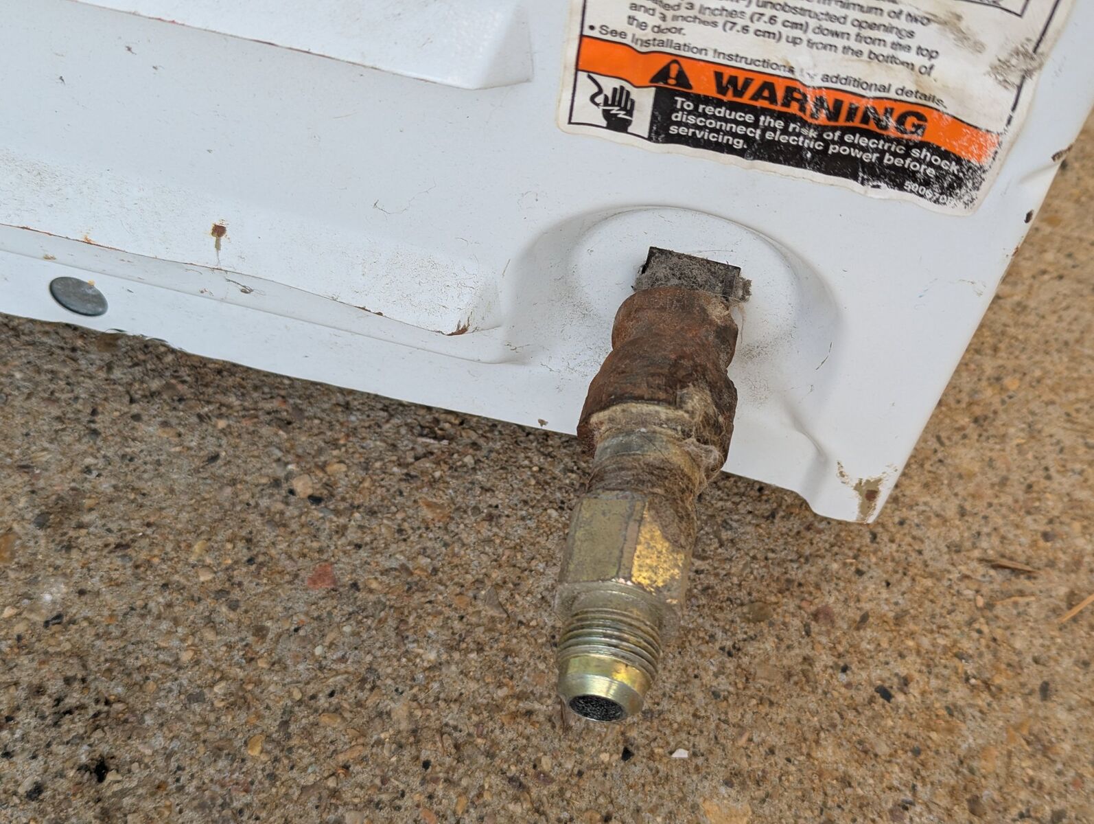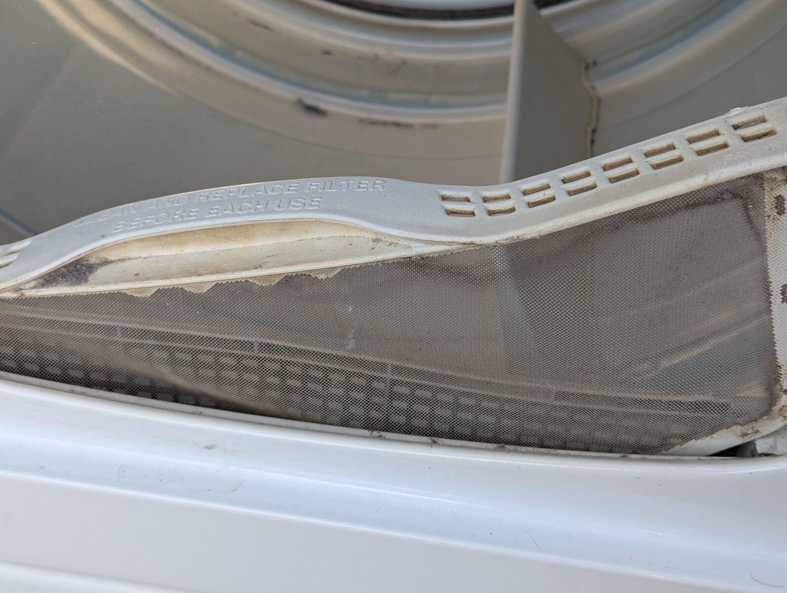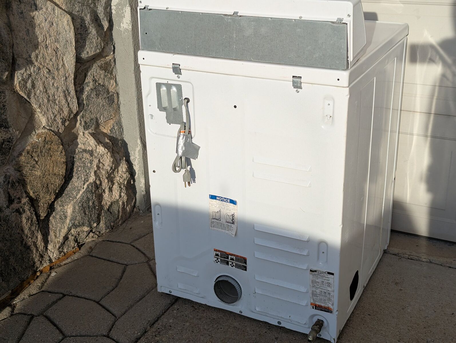Overall, the dryer is in good condition with minor marks and signs of normal use and wear. The gas connection shows some rust. The lint trap appears to be dirty.
