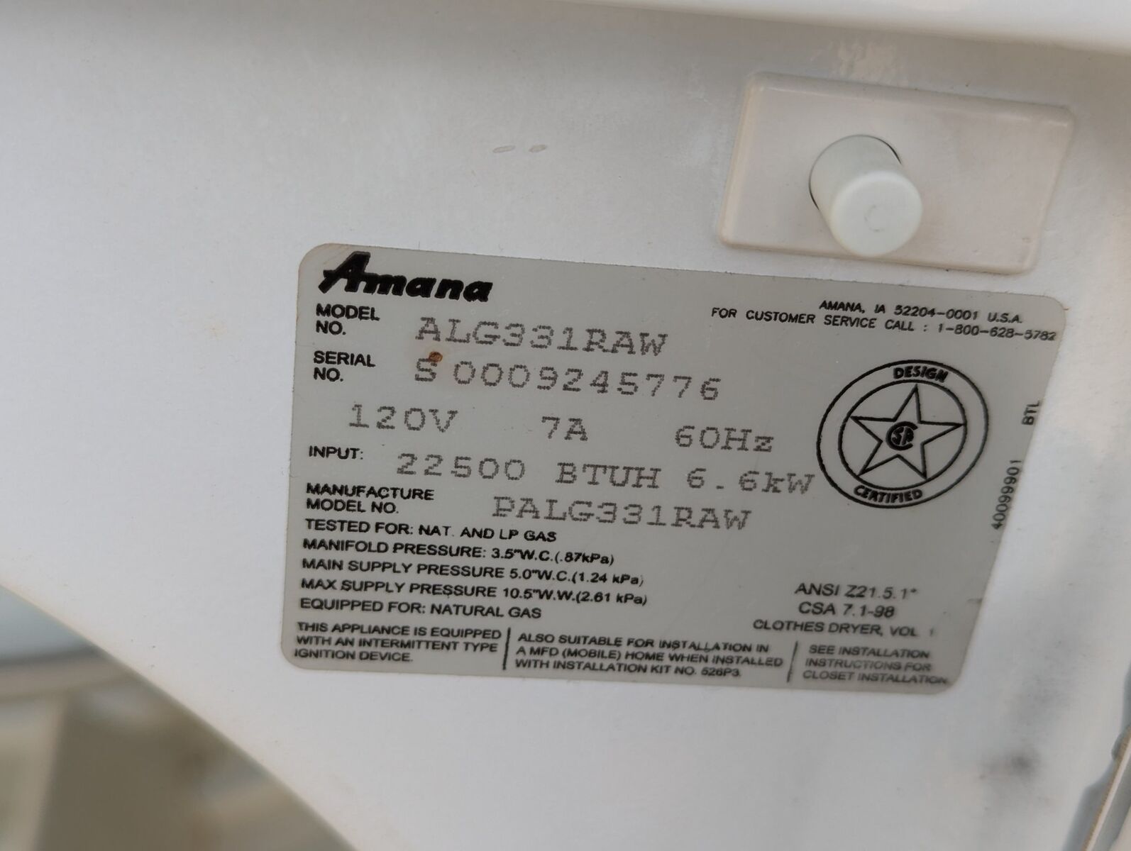 • Brand: Amana • Model: ALG331RAW • Requires both gas and electric hookup • Requires 110v house power