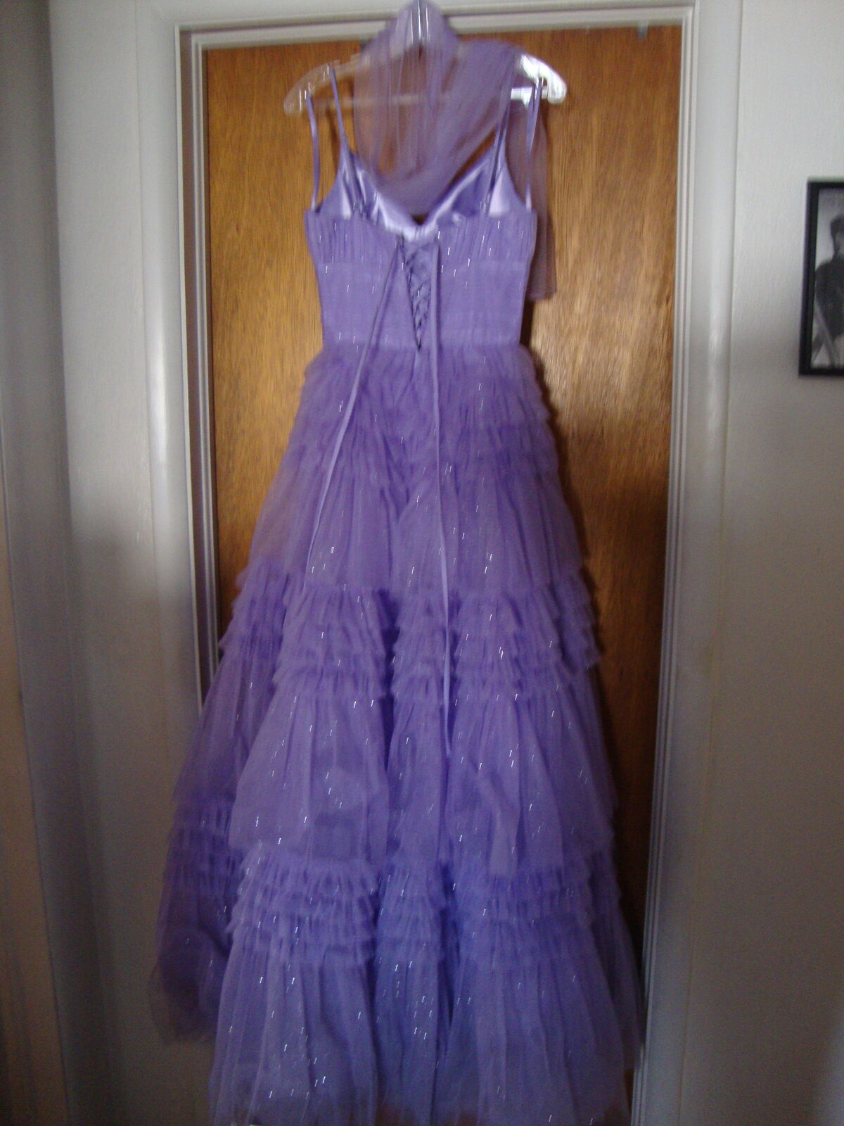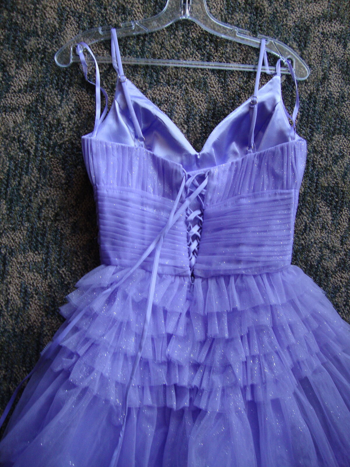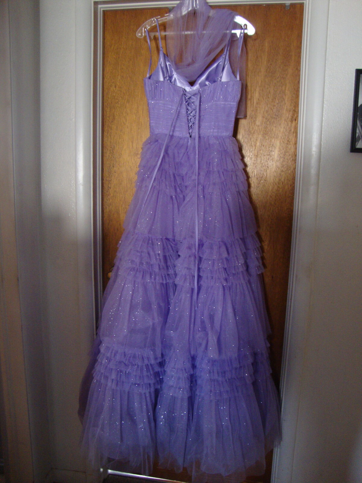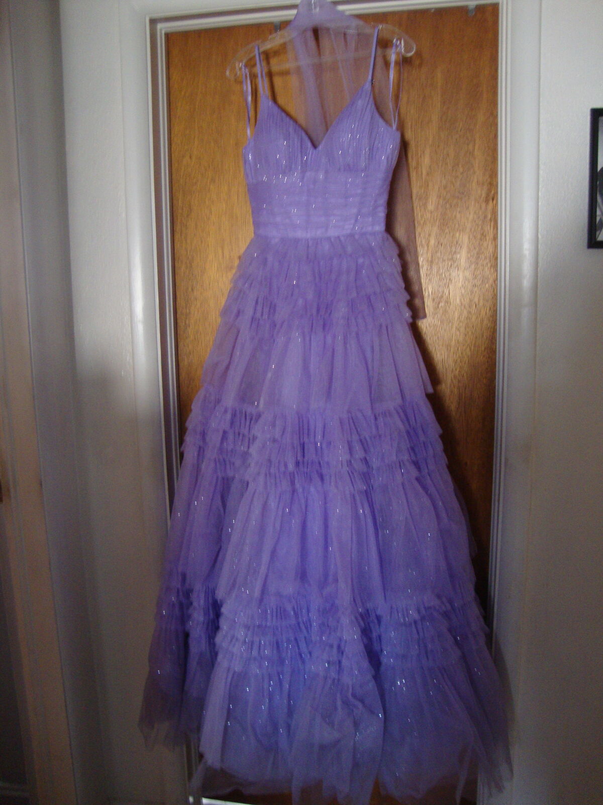 VenmoFormal GOWN Small by Eureka, Los Angeles Quinceanera Prom Dress Lavender Purple Layers of Tulle, spaghetti straps, V neck, laces up the back. Full floor length skirt. With hoops underneath It really stands out! Soft lavender Purple color. Formal occasions such as sweet 16, Quinceanera, or prom. 100% polyester, dry clean only.