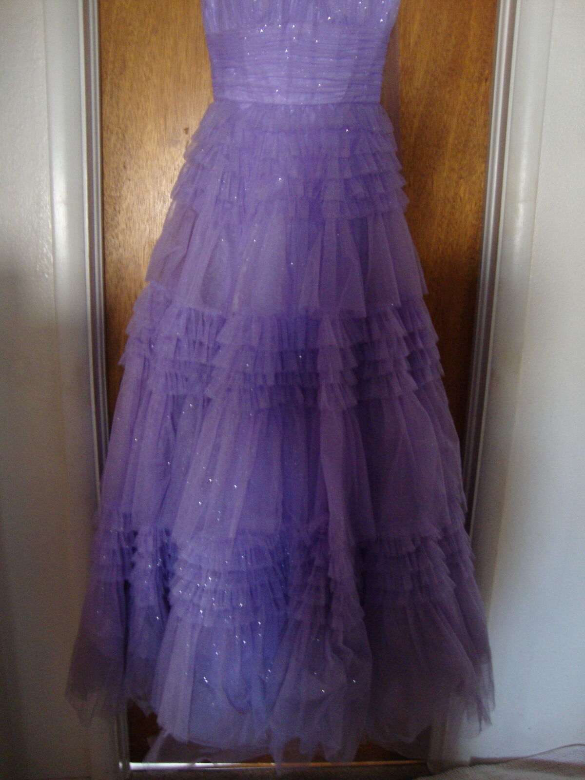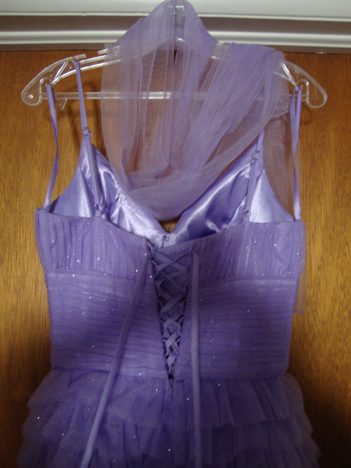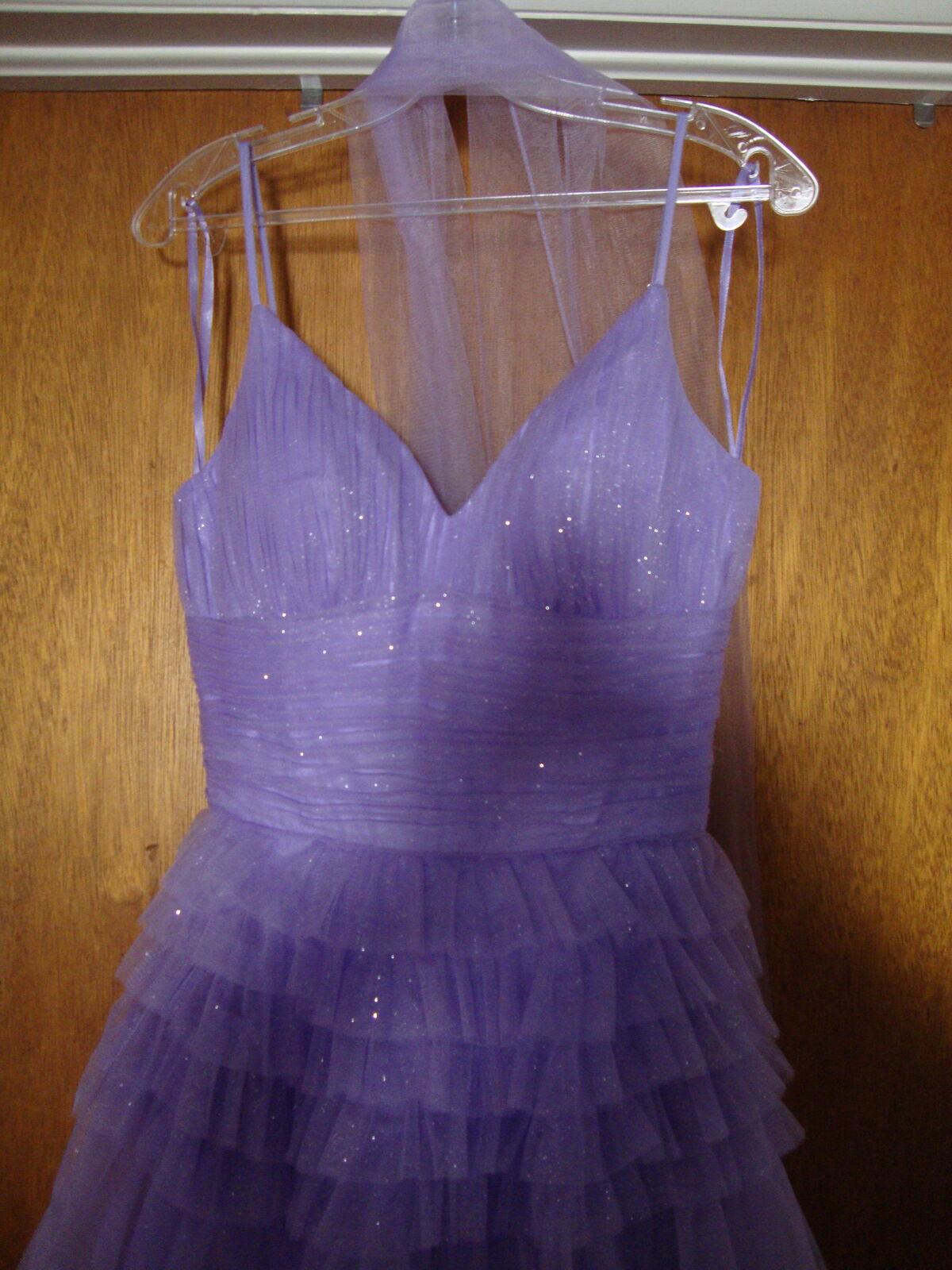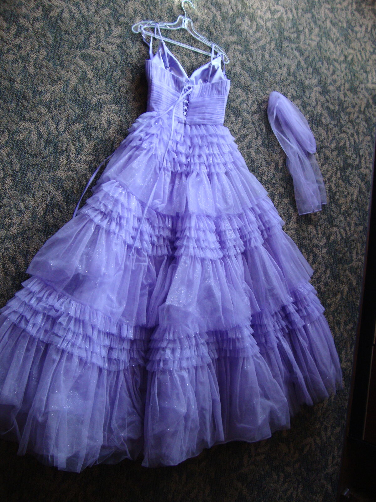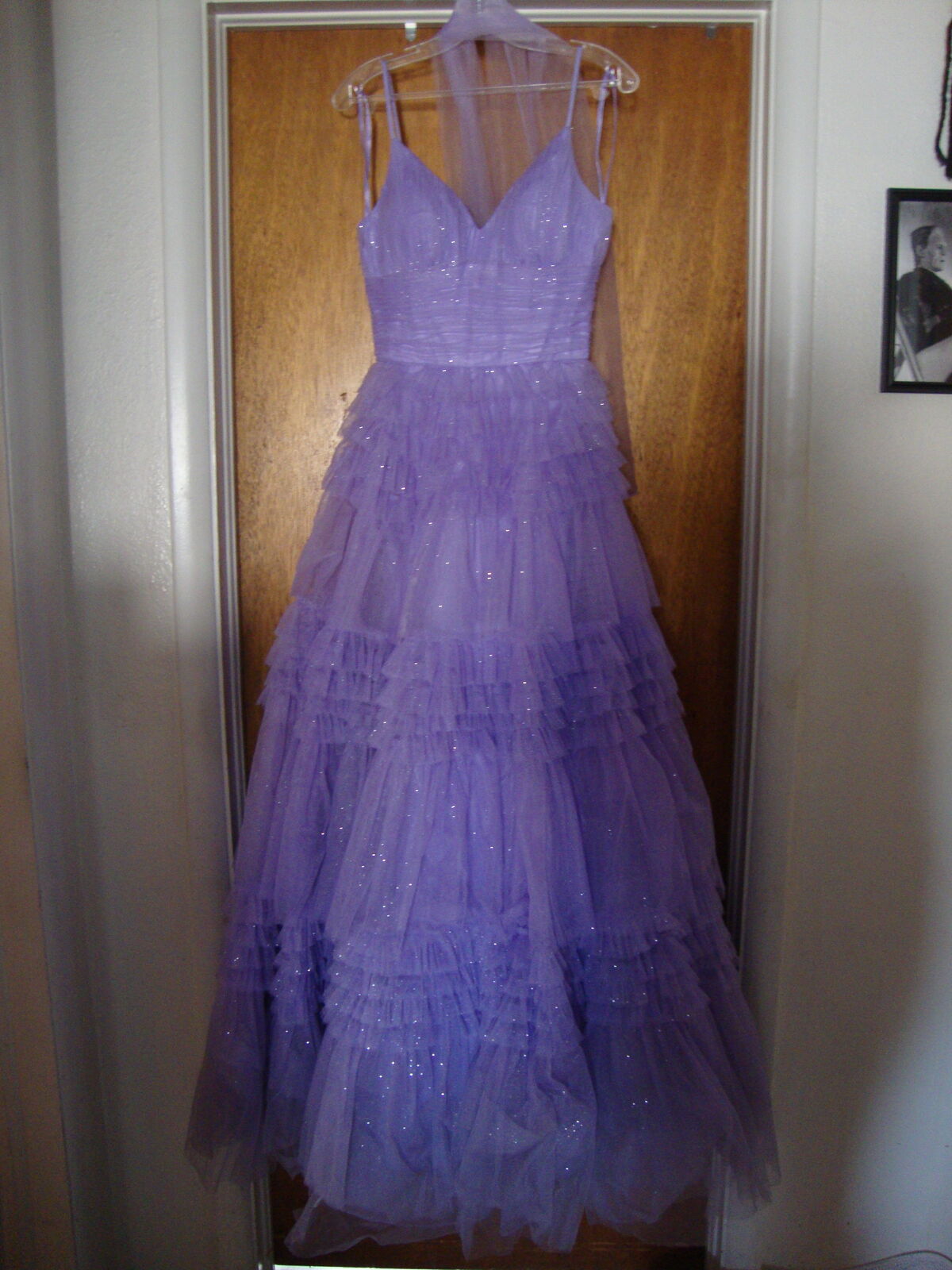 VenmoFormal GOWN Small by Eureka, Los Angeles Quinceanera Prom Dress Lavender Purple Layers of Tulle, spaghetti straps, V neck, laces up the back. Full floor length skirt. With hoops underneath It really stands out! Soft lavender Purple color. Formal occasions such as sweet 16, Quinceanera, or prom. 100% polyester, dry clean only.