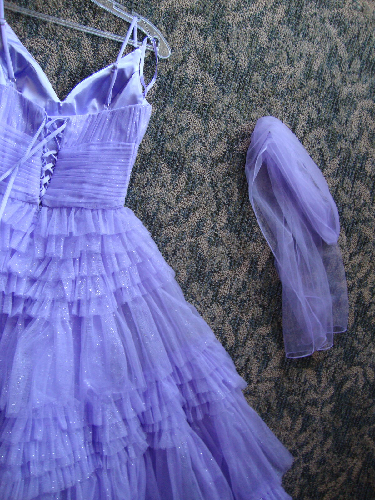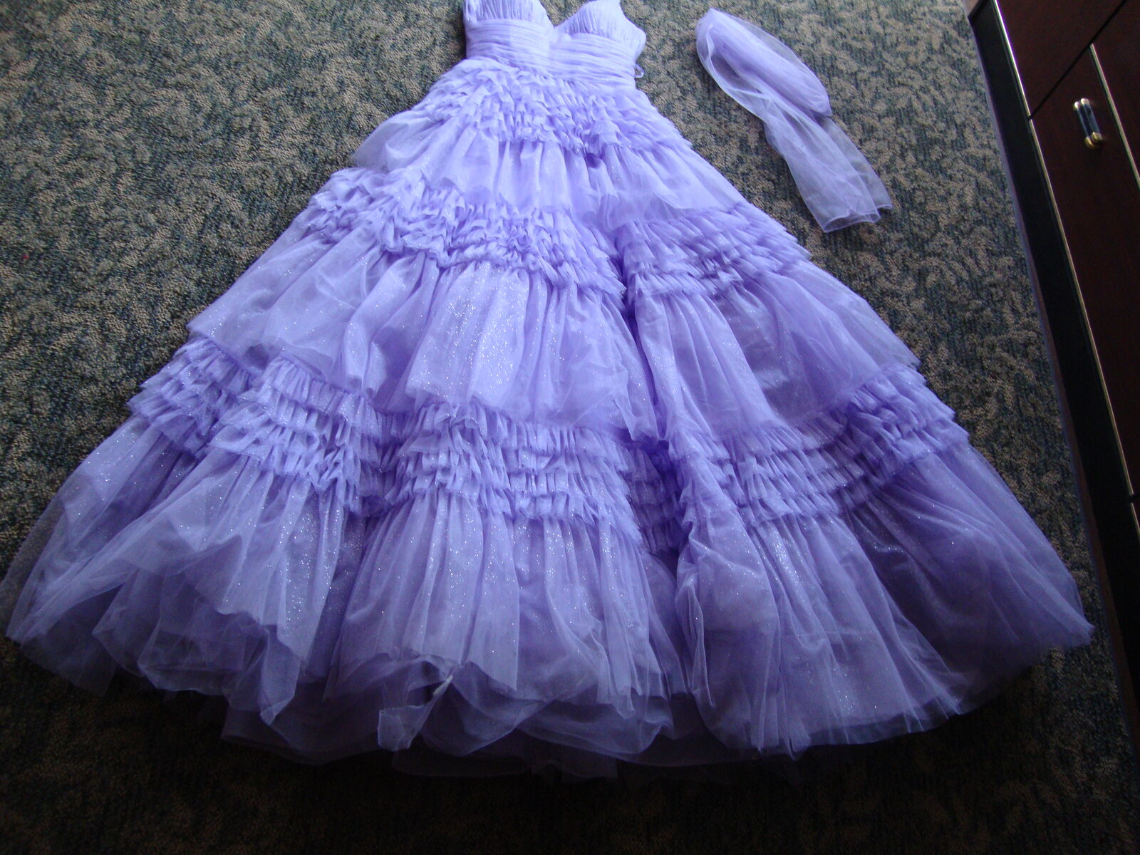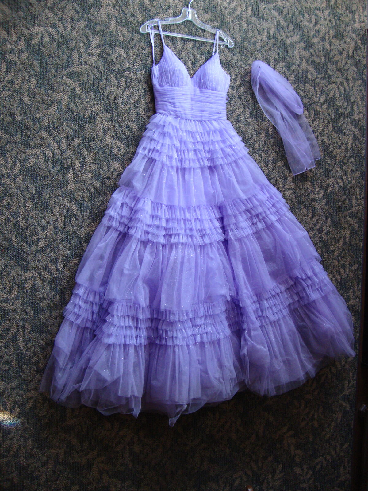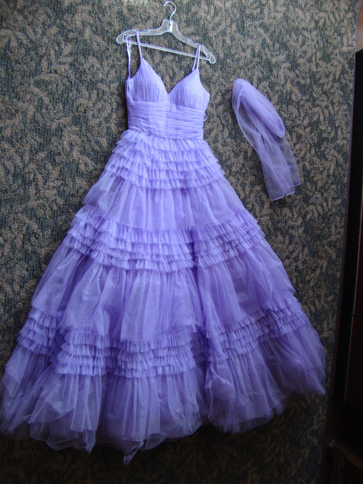 VenmoFormal GOWN Small by Eureka, Los Angeles Quinceanera Prom Dress Lavender Purple Layers of Tulle, spaghetti straps, V neck, laces up the back. Full floor length skirt. With hoops underneath It really stands out! Soft lavender Purple color. Formal occasions such as sweet 16, Quinceanera, or prom. 100% polyester, dry clean only.