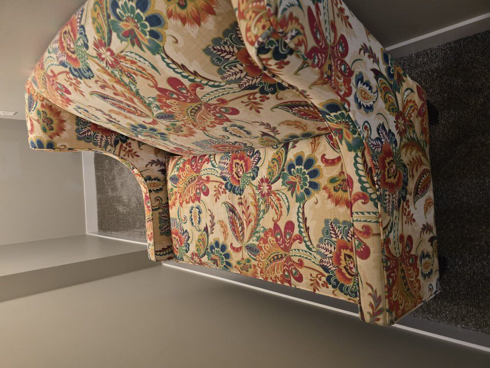 A nice flower design couch that comes with yellow rectangle throw pillow. no tears in the seat cushion. Willing to barter the price as well