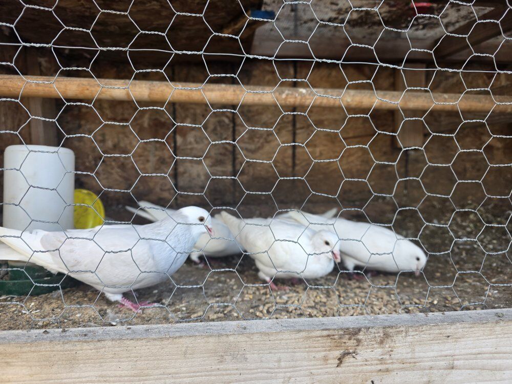 5 roller pigeons. One breeding pair that produced 7 nests this past year mostly white with a few light grey birds. The pair are great rollers but the young have only flown once or twice due to a hawk that hangs around. $10.00 per bird