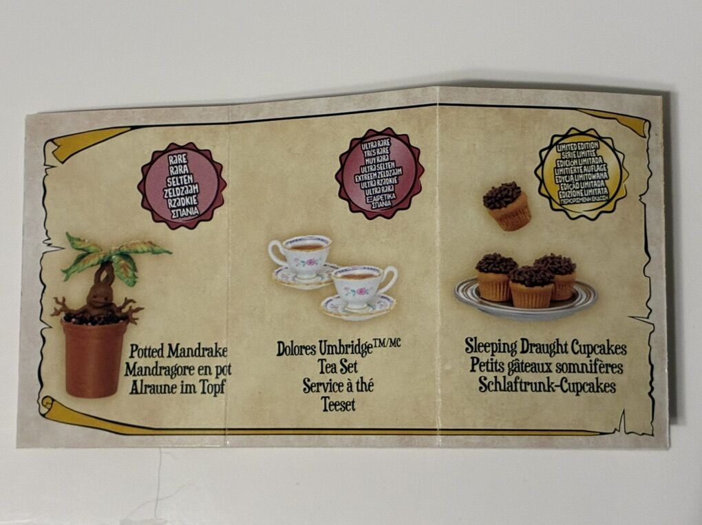 This set has been unsealed to verify that it’s the Sleeping Draught Cupcakes, but the bags have not been opened. Please note the one corner of the blue bag (which contains the potion bottle lid) tore during unboxing. All other bags are intact.