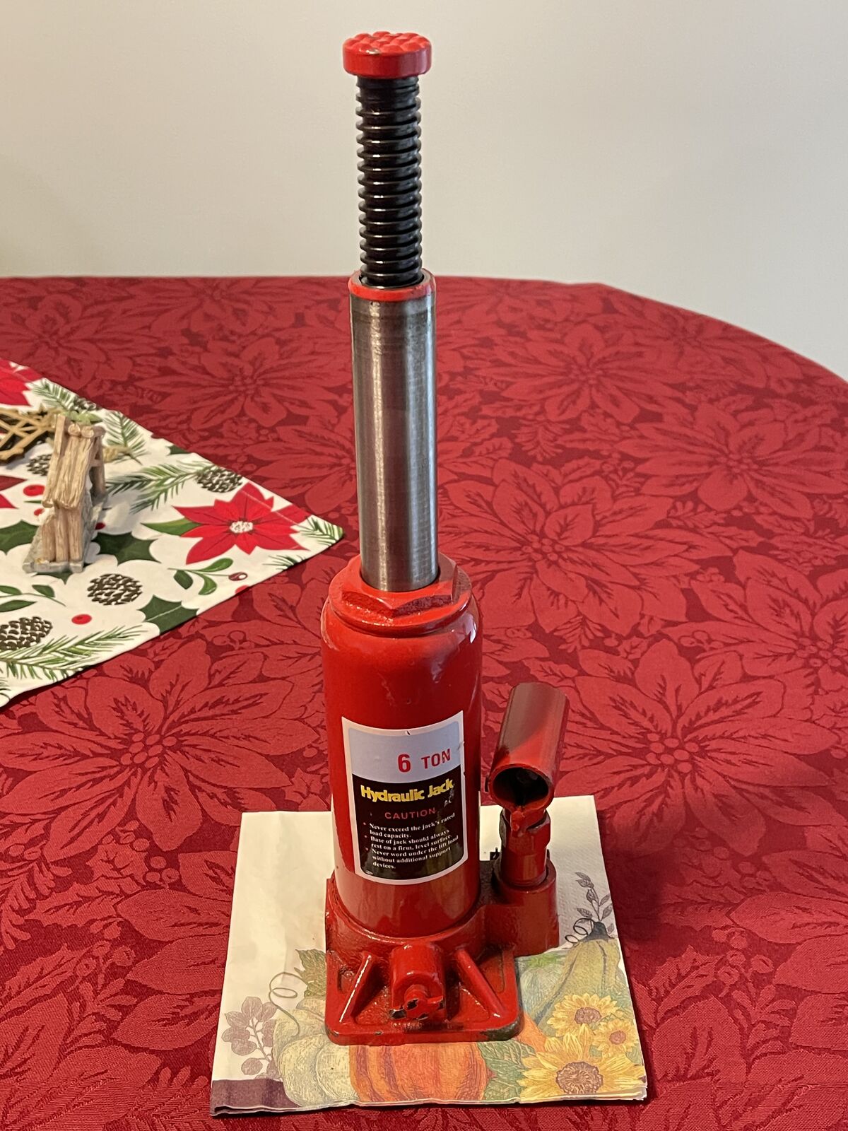 Red Jack with cosmetic chipped paint, 6 ton capacity, 3-stage 16" vertical lift, missing handle but one can be made from a strong small pipe