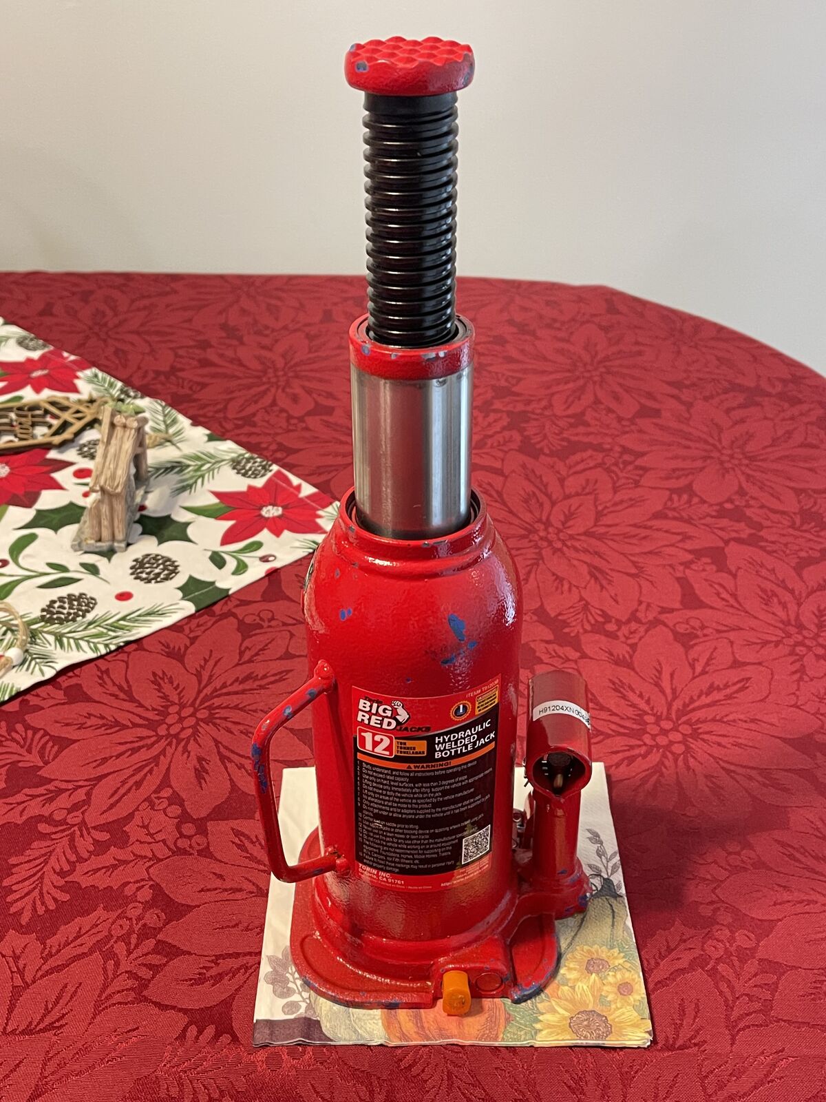 Red Jack with cosmetic chipped paint, has a solid welded base, with carry handle, 12-ton capacity, 3-stage 18" vertical lift, missing jack handle but one can be made from a small sturdy pipe