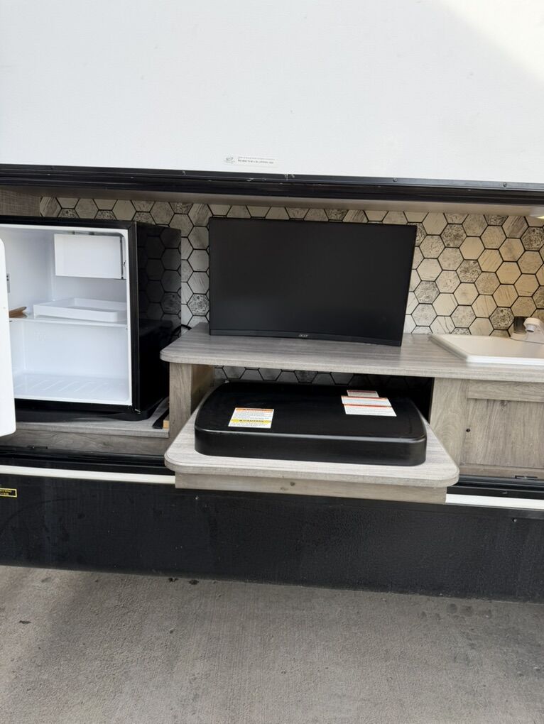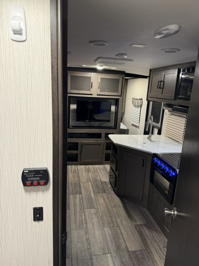 Outside features: • Power tongue jack • 4 power stabilizer jacks • 18-ft power awning • Outdoor kitchen • Outdoor shower • Outdoor speakers • Tinted windows • Aluminum wheels • Wide Trax suspension for added stability • Solar-ready • Pre-wired for backup camera