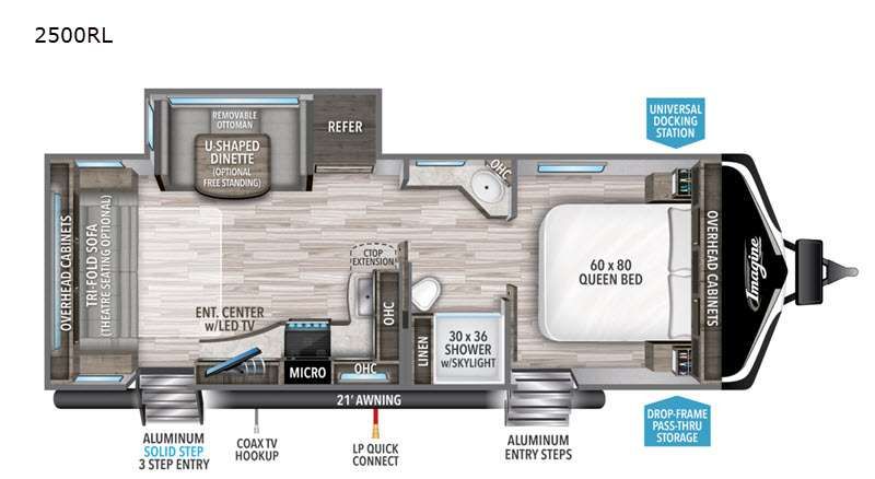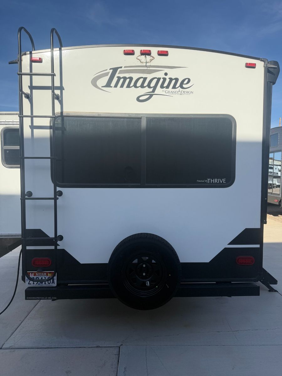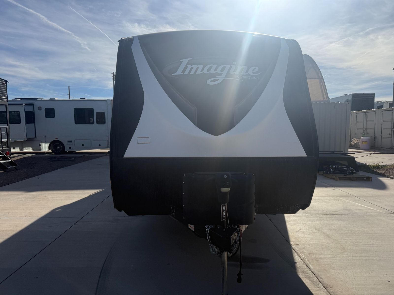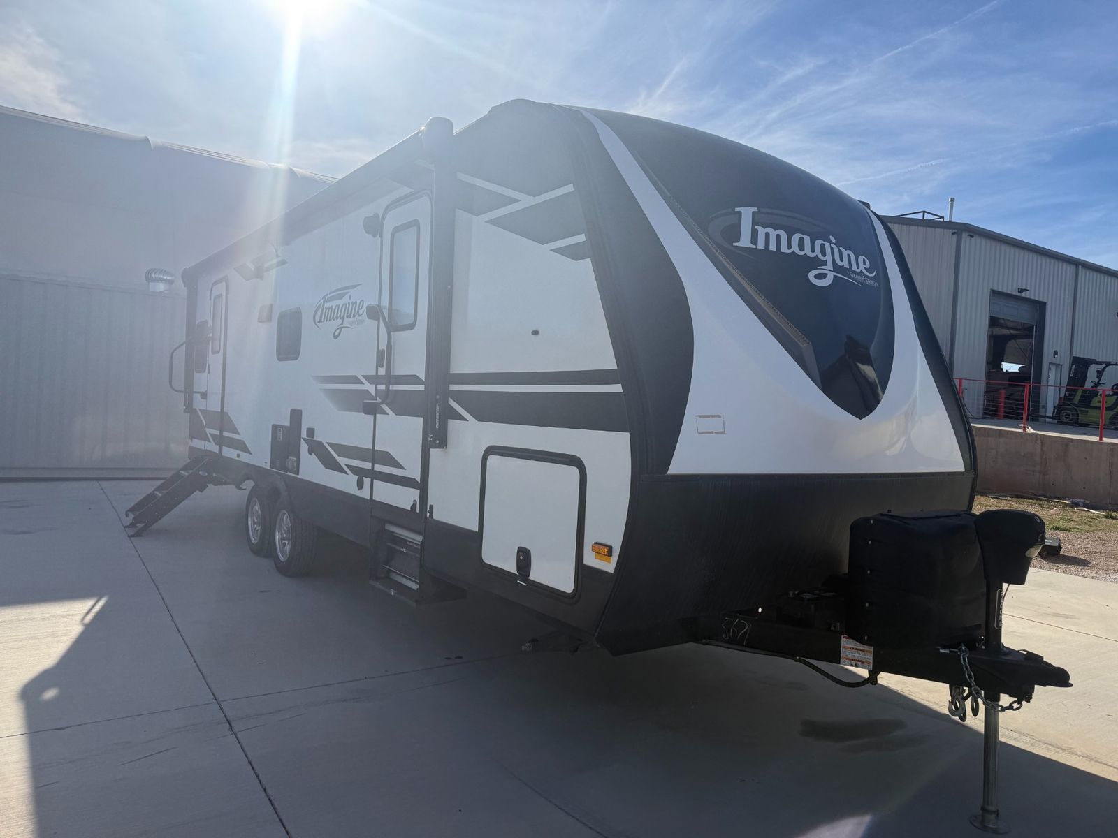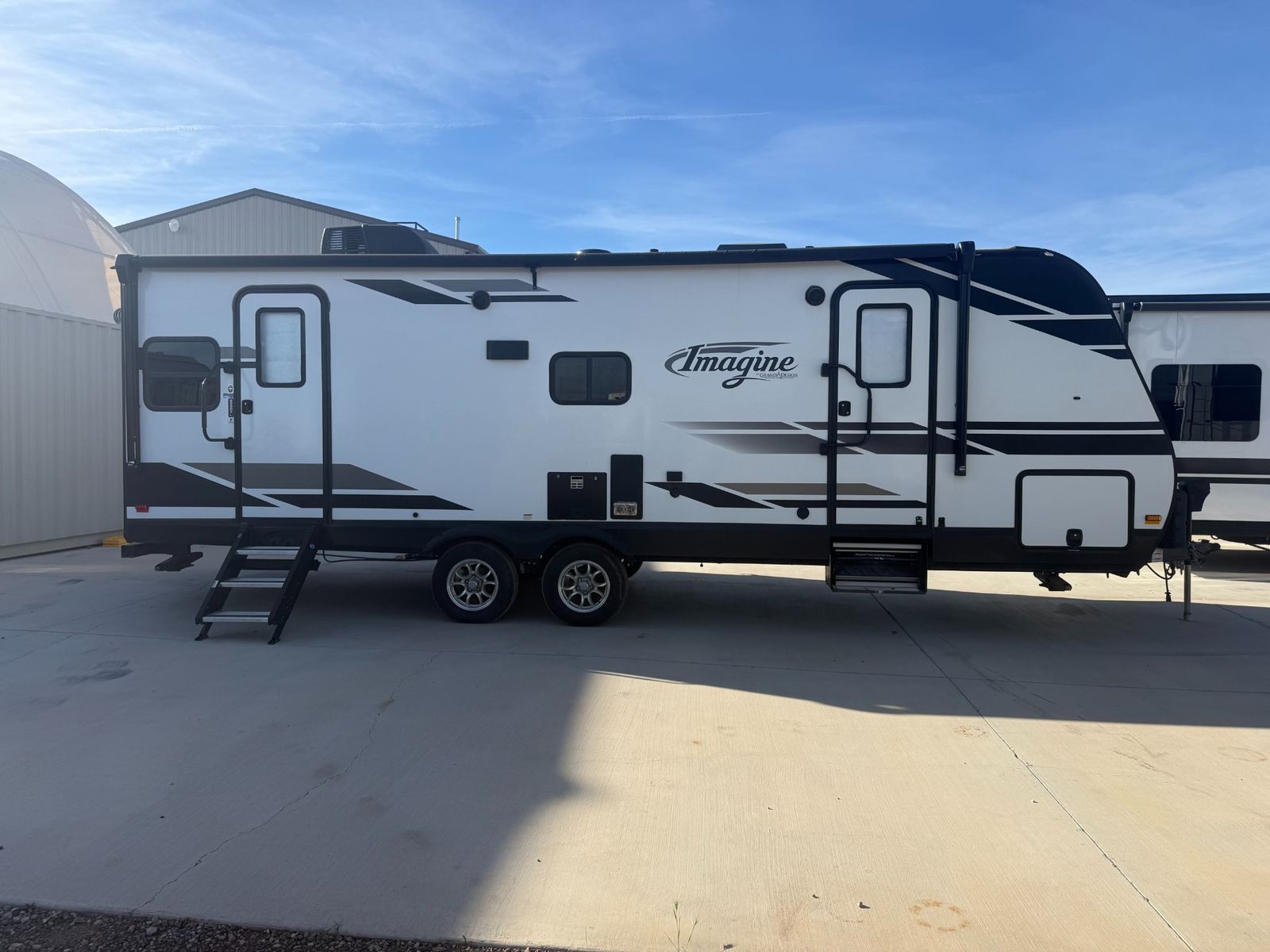 Grand Design Imagine travel trailer 2500RL highlights: Walk-Through Bath Dual Entry U-Shaped Dinette Removable Ottoman Solar Power Inlet Power Tongue Jack You and your spouse will love this trailer with its master suite in the front which includes the second exterior entry, and a space savings sliding interior door with quick access to the walk-through bathroom. You can dine at the U-shaped dinette with removable ottoman to relax your legs or choose the optional free standing dinette in its place. The rear tri-fold sofa gives you a place to unwind after hiking the trials or making dinner in the L-shaped kitchen which includes a counter extension for extra space to dry dishes or serve food. And the LED TV provides inside entertainment with a pantry behind it to hold all your snacks. With any Imagine by Grand Design the construction includes a laminated aluminum framed main floor, rear wall, side walls, roof and end walls in the slide rooms and floors, plus a one-piece roof membrane giving you years of lightweight towing to your favorite destinations. Best in class storage is found in the exclusive drop frameunobstructed pass through storage, and the Universal Docking station offers an all-in-one location for utilities and hookups, plus you will find industry leading tank capacities and extended season camping with the mandatory four-season protection package. Inside you will experience residential cabinetry and a pull-down sprayer kitchen faucet, upgraded residential furniture and countertops, plus much more with an 81" radius ceiling for a spacious interior. Choose your favorite Imagine today, and start adventuring in a lightweight and comfortable trailer!