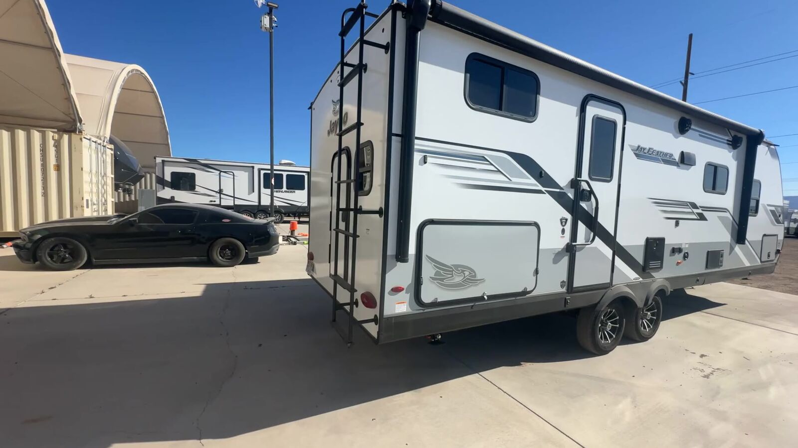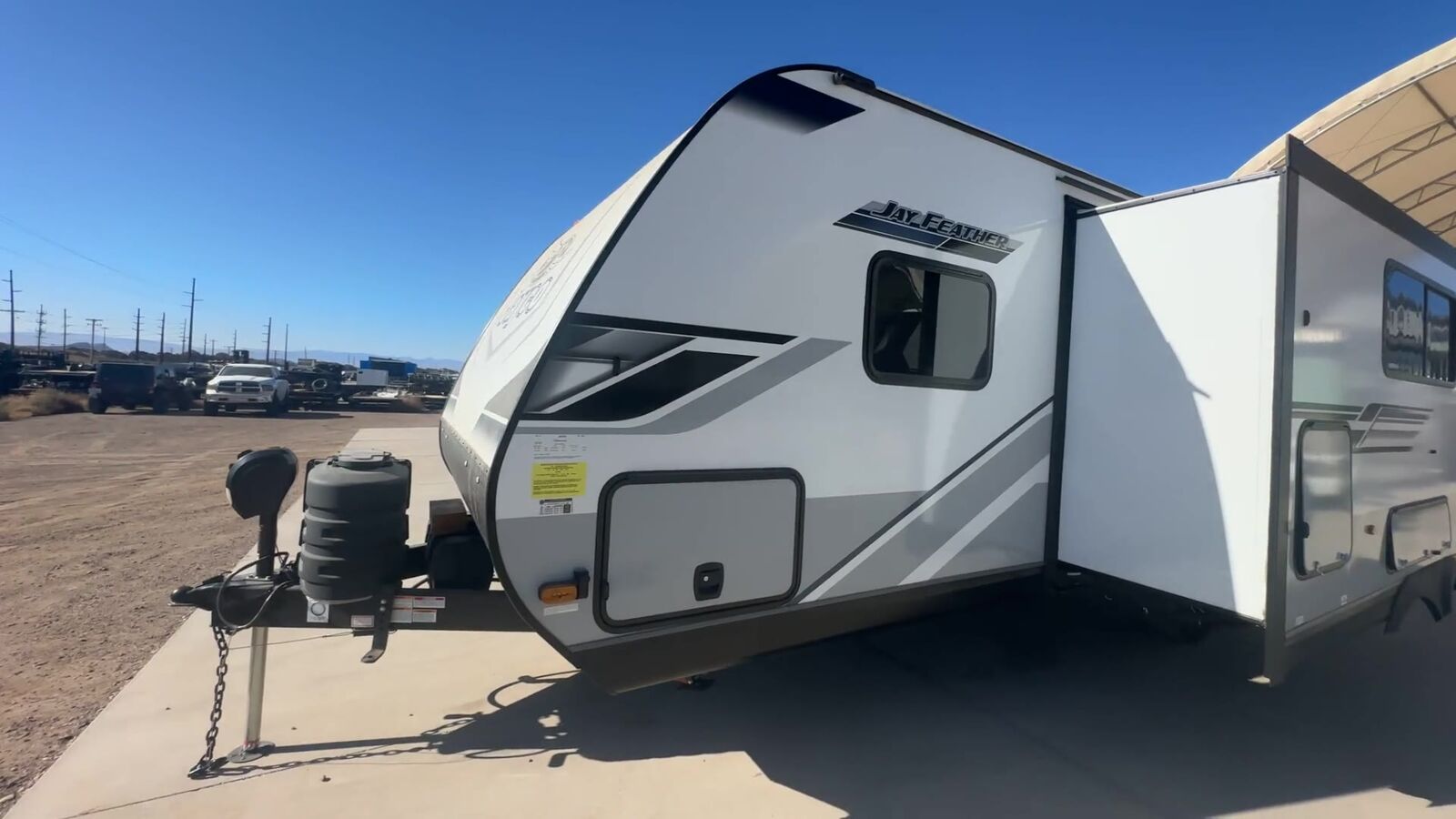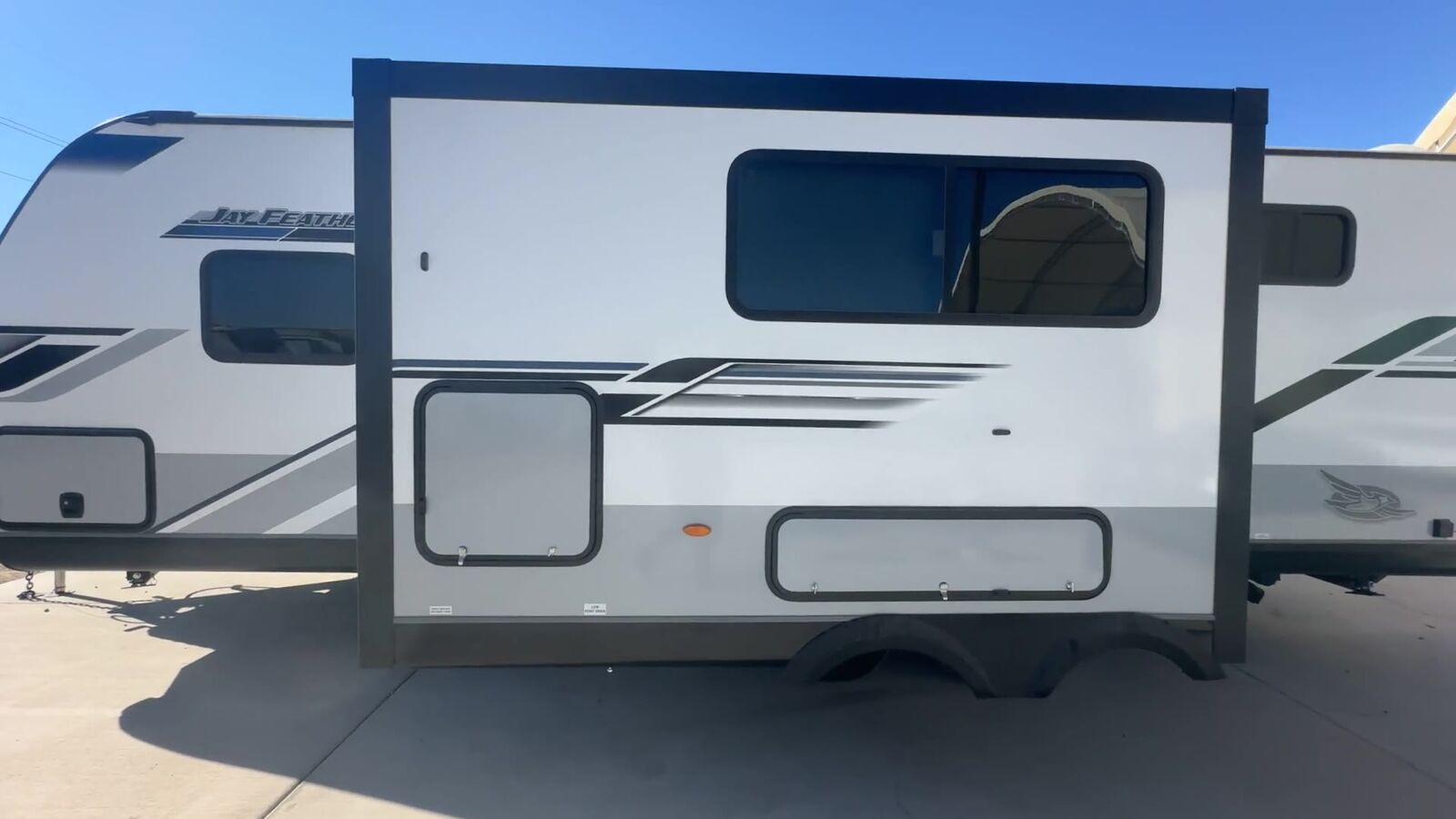 Jayco Jay Feather travel trailer 24BH highlights: Double-Size Bunks U-Shaped Dinette Outside Kitchen Cargo Door There is so much to love about this trailer from the double-size bunks in the rear with a ladder for easy access, plus the cargo door that allows you to stow larger items from the exterior to the interior underneath the bunks. You also have exterior storage compartments for outdoor gear. And the cook can choose to make meals using the outside kitchen including a refrigerator to store some cold items or the inside kitchen with full amenities including an 11 cu. ft. 12V refrigerator and ample counter space. The walk-in pantry is a nice feature as well especially when you have a big crew. There is a private bedroom up front witha queen bed and dual wardrobes for your things, and any other guests can sleep on the U-shaped dinette in the main living area! With any Jay Feather travel trailer by Jayco, you will enjoy lightweight towing, convenient exterior amenities, and at-home comforts inside! The Overlander 1 Solar Package included within the Jay Sport Package comes with a 200W solar panel and a 30-amp digital controller so you can enjoy some off-grid camping. There is also a modern graphics package with a dual-colored sidewall, LCI Solid Step fold-down aluminum tread steps on the main entry door, and Climate Shield 0 -100° F tested weather insulation package that will allow you to camp in all sorts of climates. The Customer Value Package will make time outdoors easier than ever with a power tongue jack and a Rock Solid stabilizer system. More exterior features include a Keyed-Alike locking system, marine grade exterior speakers, a Magnum Truss roof system, and the list goes on! And we haven't even touched on the interior comforts, like the residential style seamless countertops and vinyl flooring throughout, decorative backsplash, handcrafted hardwood door/drawer fronts, and multiple USB charging ports to keep you going!