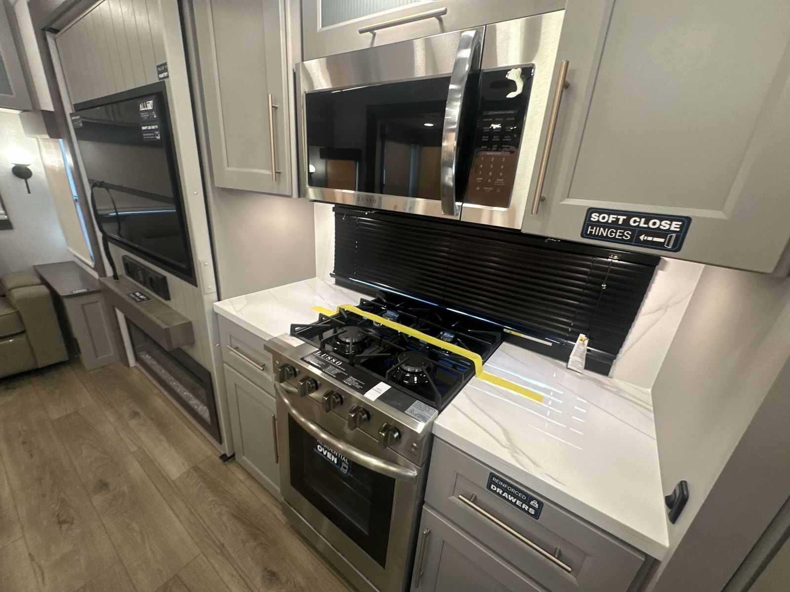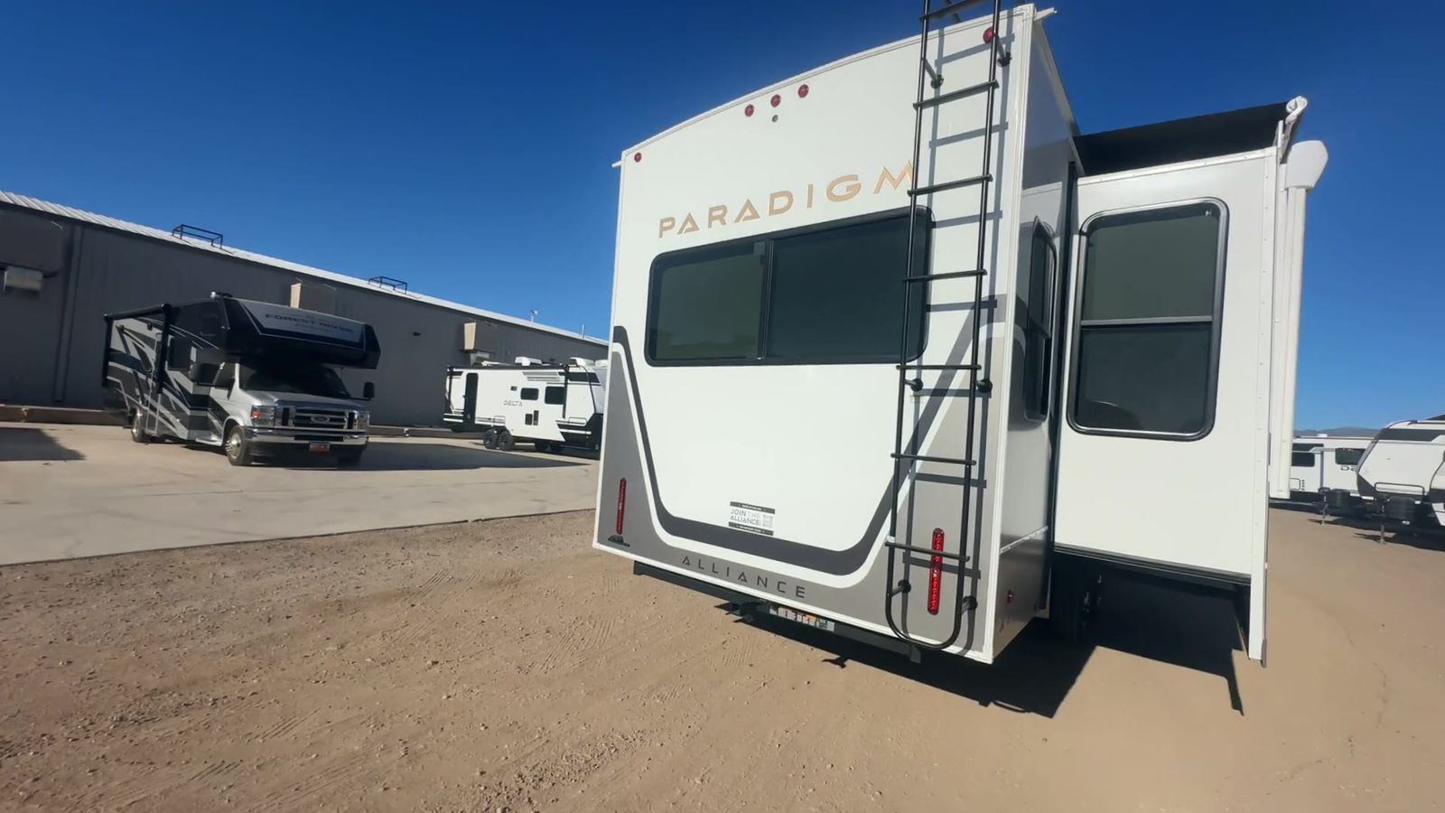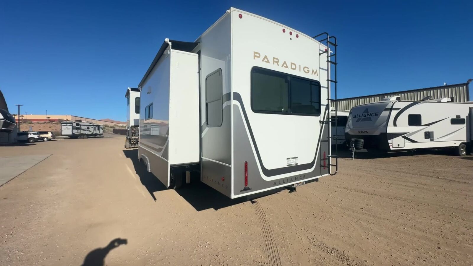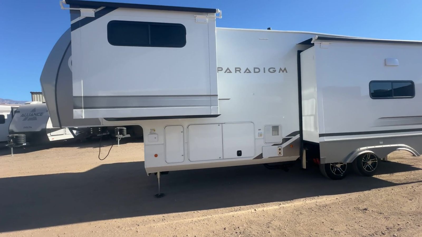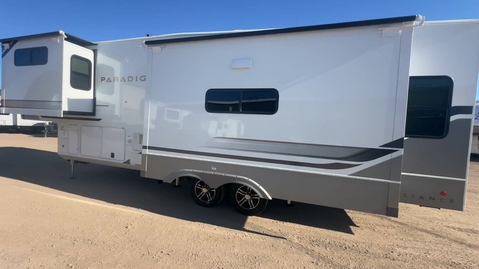 Alliance RV Paradigm fifth wheel 310RL highlights: Rear Living Area Kitchen Island Flush-Floor Kitchen Slide Swivel Table and Desk Hidden Pantry Behind Fireplace Search for the best views, the nicest RV park, or a place you haven't seen for years with this Paradigm in tow! There is a king bed slide in the master bedroom, a Smart TV, and a dresser with flip-up hidden storagefor your belongings. The full bathroom offers a large residential shower, a porcelain toilet with a soft close seat, and storage for your linens, while the kitchen gives you two pantries, an island with a large undermount single basinsink anddishwasher prep if you want the option for easy clean up.You will also have a residential microwave and range, plus a 3.73 cu. ft. oven to make meals. When you're ready to relax for the evening, head to the rear living area to enjoy the dual recliner love seat across from the 50" Smart TV and fireplace! The Paradigm fifth wheels by Alliance RV are functional, high-quality, and luxurious for an unforgettable camping experience. There arethree A/C unitsand a 40K BTU furnace to keep you comfortable year around, and you'll appreciate additional convenient amenities, like the all-in-one enclosed/heated utility center and the color coded and numbered wiring. AHelux Series coil spring pin boxcomes standard for hassle-free towing, along with Curt 8,000 lb. axles. You'll love the kitchen with itsLG solid surface countertopsand Lusso range, plus there is LED motion lighting in the pantry and a Maxx fan with a rain sensor to keep everything fresh when making dinner. Each model also includes anHD Smart TVin the living room and bedroom.And of course there are a variety of options you can choose from to further customize your fifth wheel; dual pane windows, Super Solar Plus, slide out awning toppers, and generator prep or a generator to name a few!