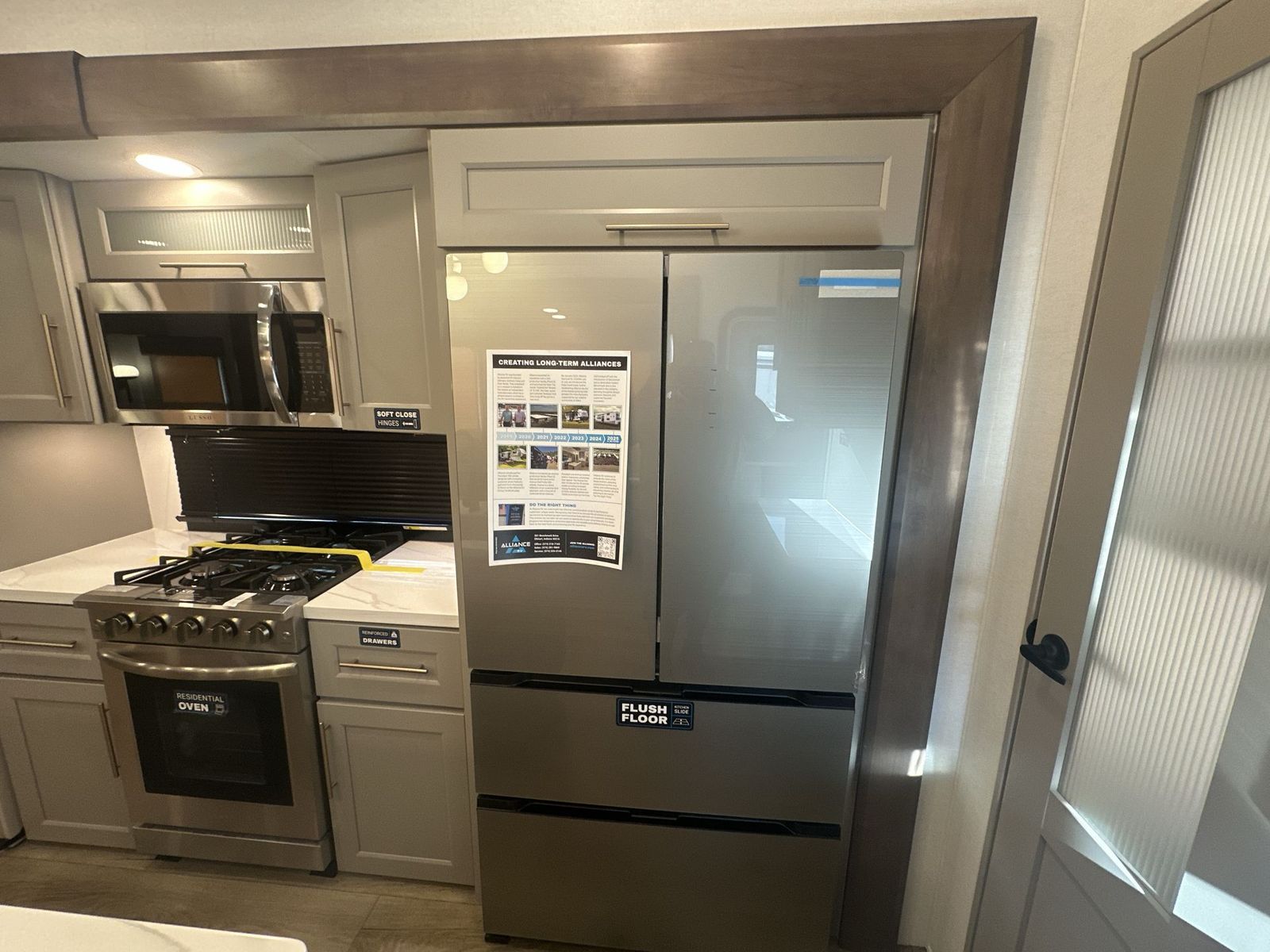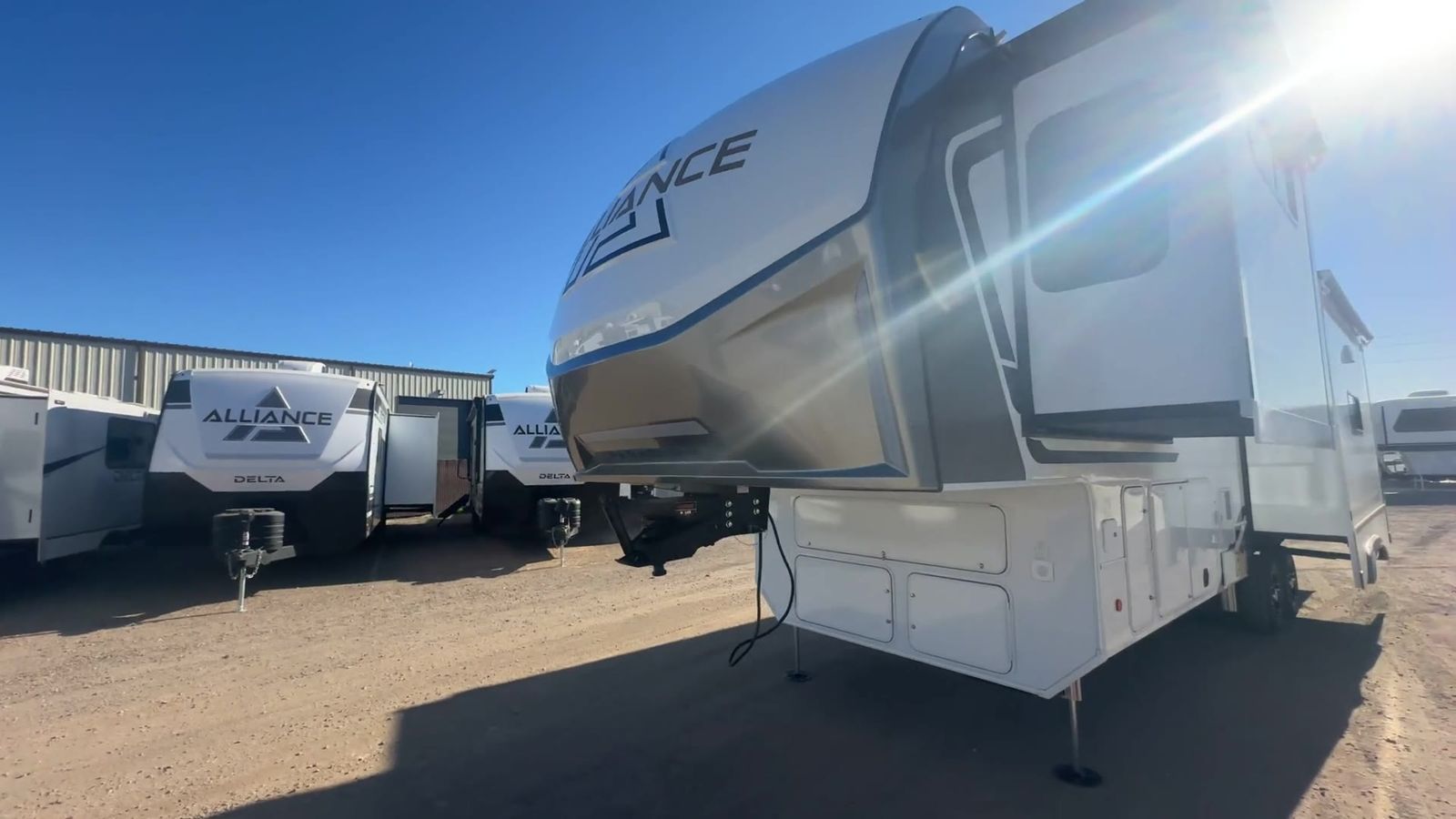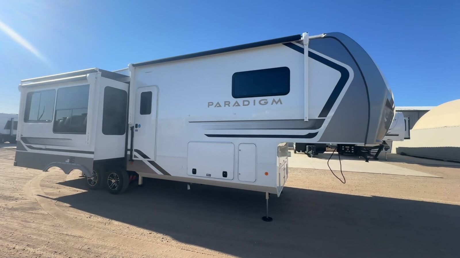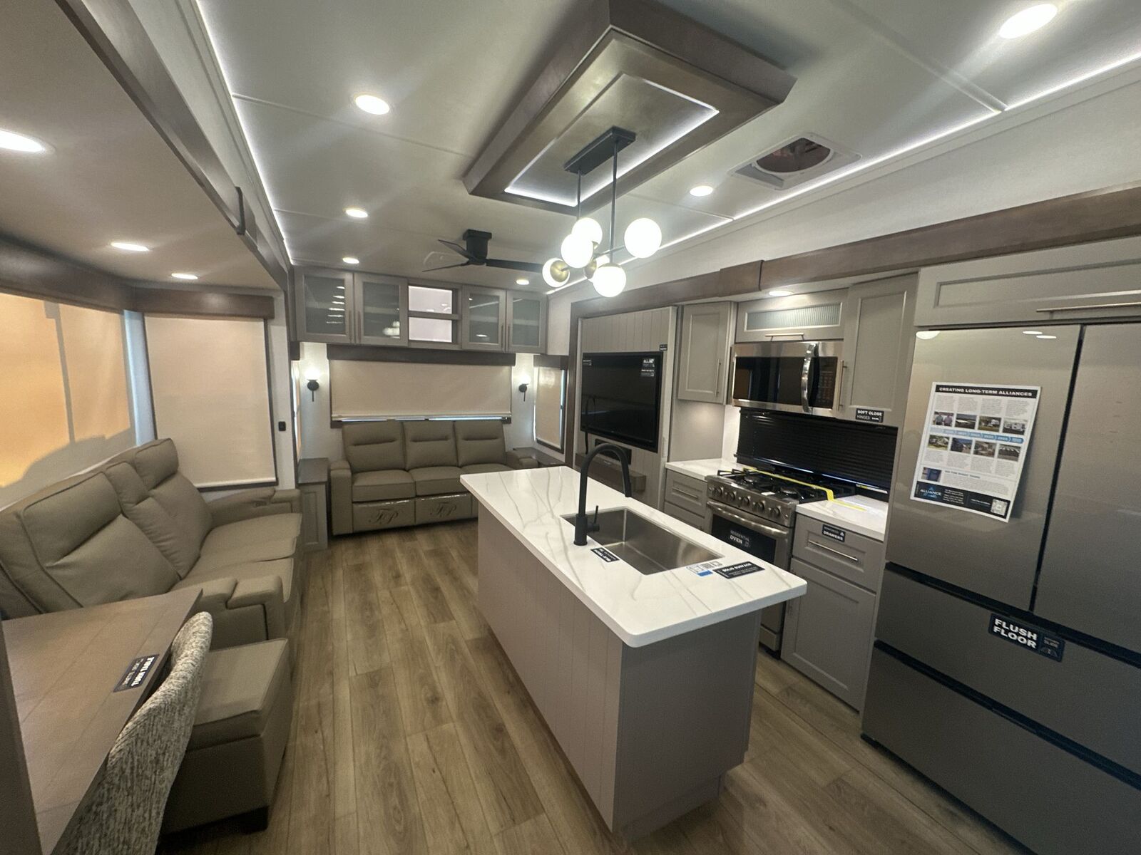 Alliance RV Paradigm fifth wheel 310RL highlights: Rear Living Area Kitchen Island Flush-Floor Kitchen Slide Swivel Table and Desk Hidden Pantry Behind Fireplace Search for the best views, the nicest RV park, or a place you haven't seen for years with this Paradigm in tow! There is a king bed slide in the master bedroom, a Smart TV, and a dresser with flip-up hidden storagefor your belongings. The full bathroom offers a large residential shower, a porcelain toilet with a soft close seat, and storage for your linens, while the kitchen gives you two pantries, an island with a large undermount single basinsink anddishwasher prep if you want the option for easy clean up.You will also have a residential microwave and range, plus a 3.73 cu. ft. oven to make meals. When you're ready to relax for the evening, head to the rear living area to enjoy the dual recliner love seat across from the 50" Smart TV and fireplace! The Paradigm fifth wheels by Alliance RV are functional, high-quality, and luxurious for an unforgettable camping experience. There arethree A/C unitsand a 40K BTU furnace to keep you comfortable year around, and you'll appreciate additional convenient amenities, like the all-in-one enclosed/heated utility center and the color coded and numbered wiring. AHelux Series coil spring pin boxcomes standard for hassle-free towing, along with Curt 8,000 lb. axles. You'll love the kitchen with itsLG solid surface countertopsand Lusso range, plus there is LED motion lighting in the pantry and a Maxx fan with a rain sensor to keep everything fresh when making dinner. Each model also includes anHD Smart TVin the living room and bedroom.And of course there are a variety of options you can choose from to further customize your fifth wheel; dual pane windows, Super Solar Plus, slide out awning toppers, and generator prep or a generator to name a few!