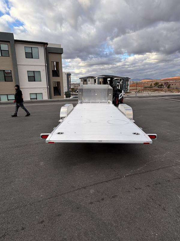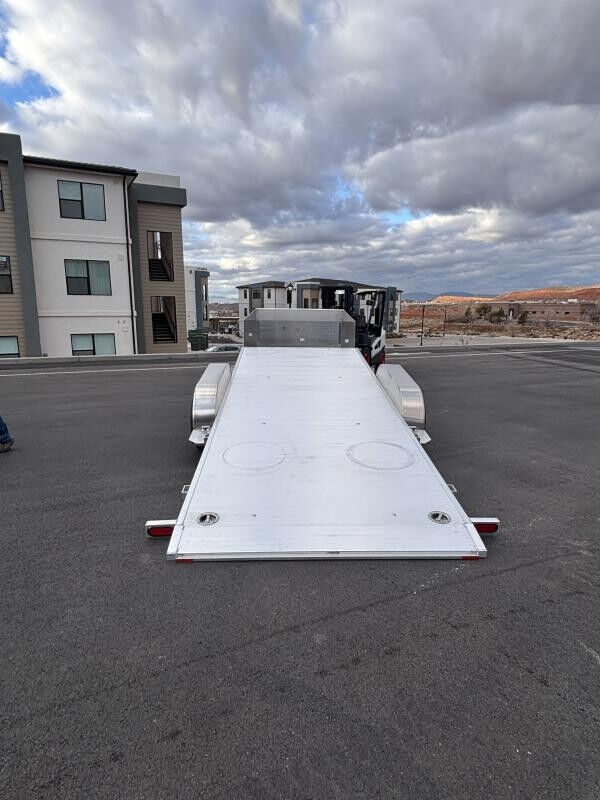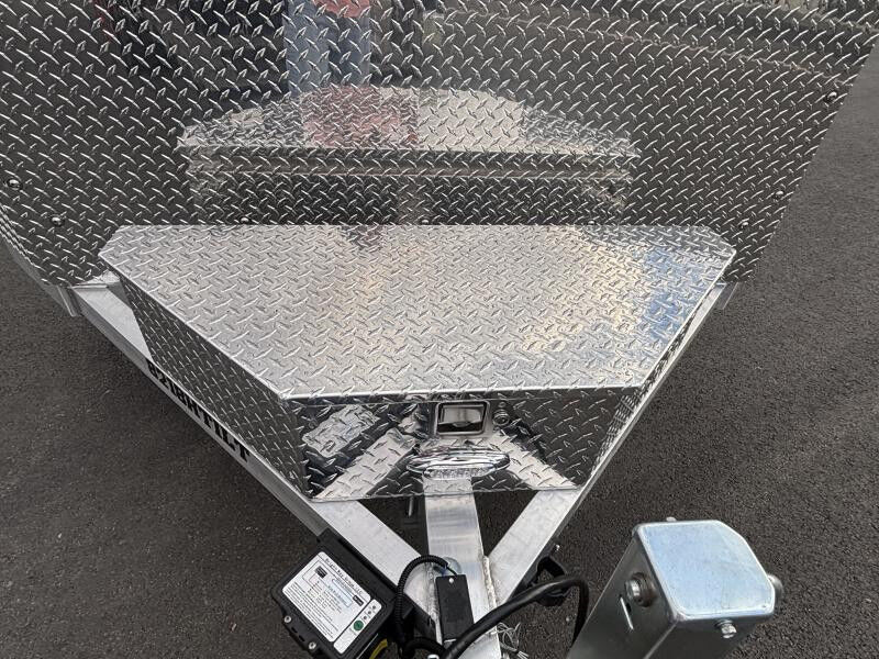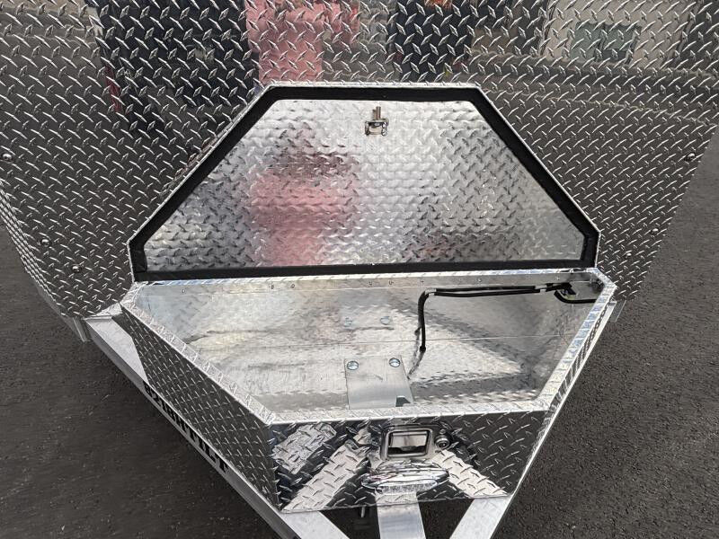 2-3500# Rubber torsion axles - Easy lube hubs Electric brakes, breakaway kit ST205/75R14 LRC radial tires (1760# cap/tire) Aluminum wheels, 5-4.5 BHP Control valve to adjust rate of descent Bed locks for travel and for locking bed in up position Removable aluminum teardrop fenders Extruded aluminum floor Front Rockguard Front Toolbox A-Framed aluminum tongue, 44.5" long with 2-5/16" coupler 8) stake pockets (4 per side); 4) Recessed tie rings, SS 5000# Padded tongue jack, 2500# capacity LED Lighting package, safety chains