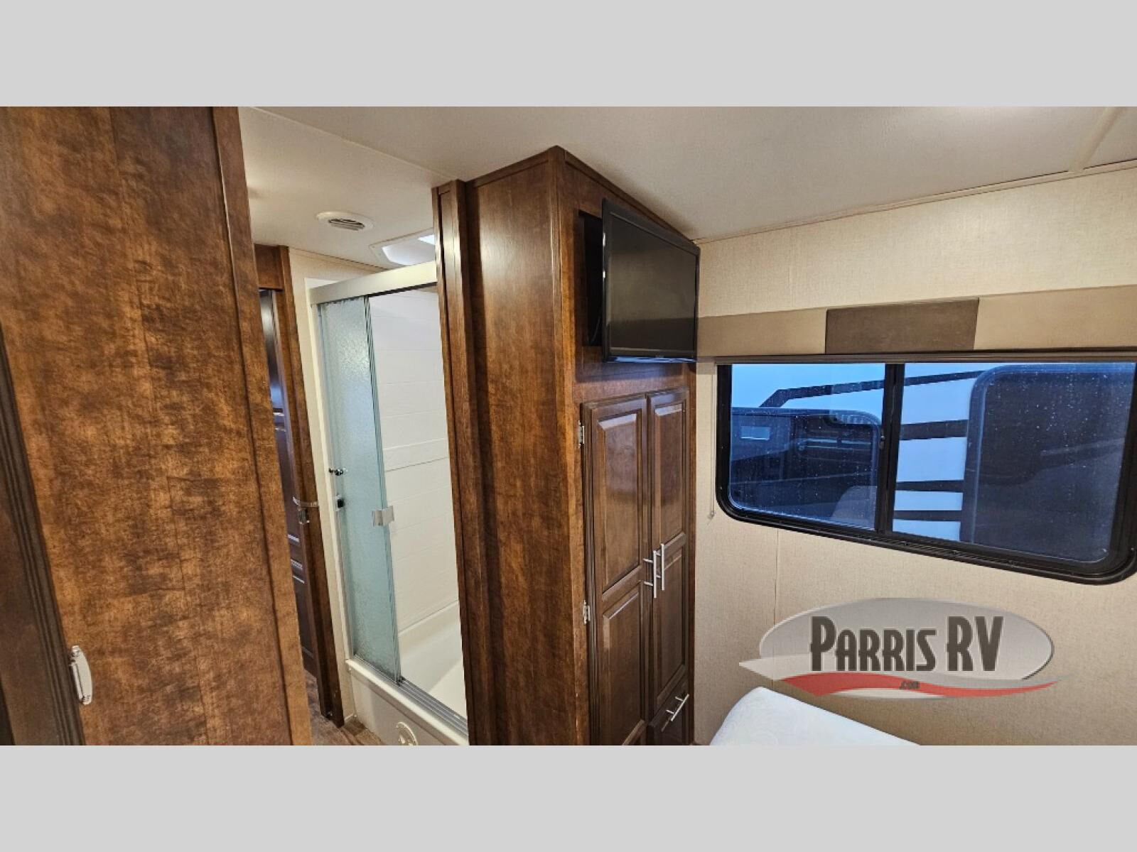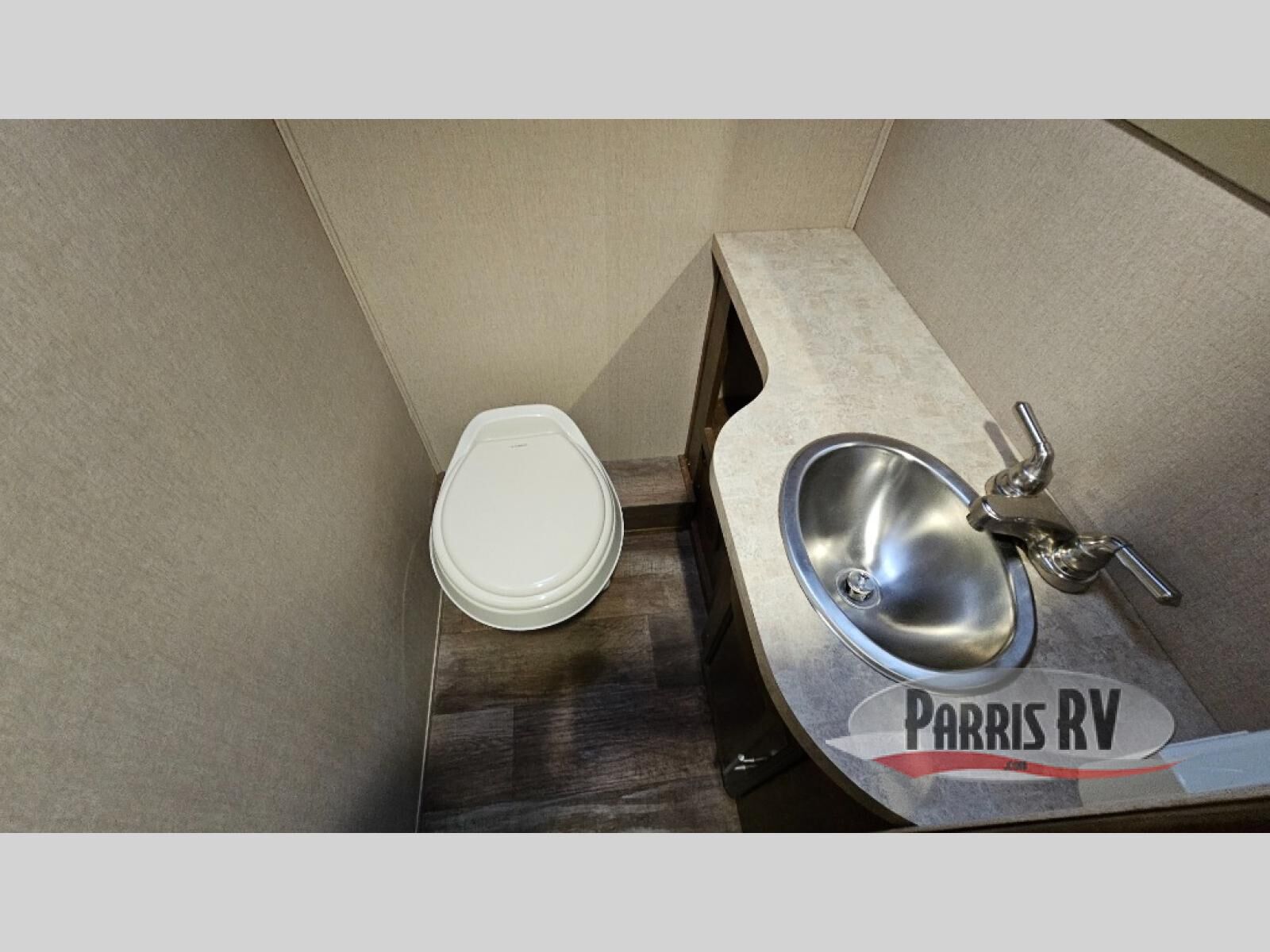 The bathroom has a private toilet area with a sink on one side of the motor home and a shower on the other side.