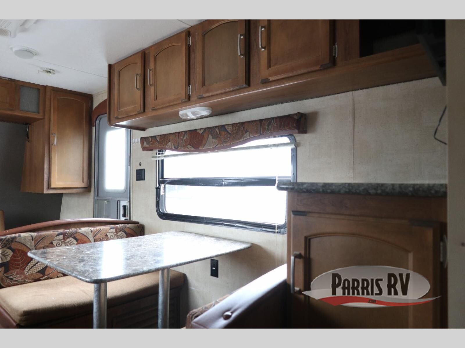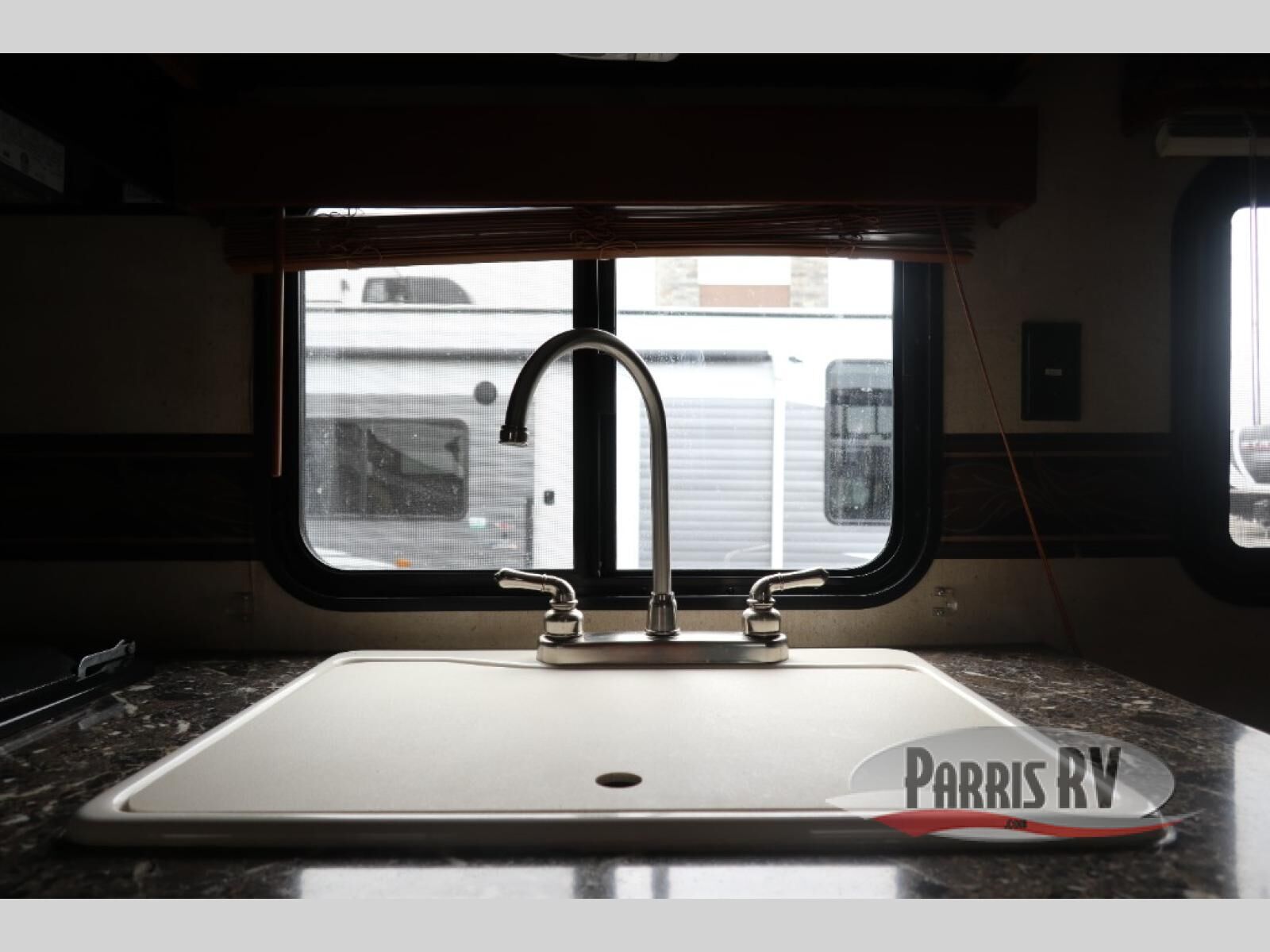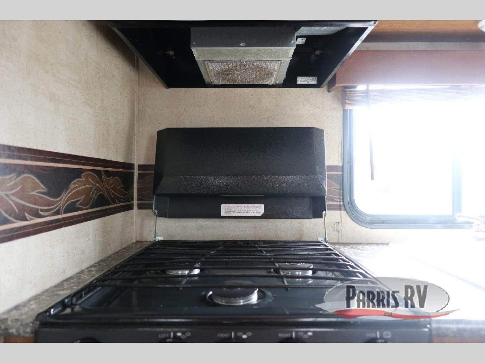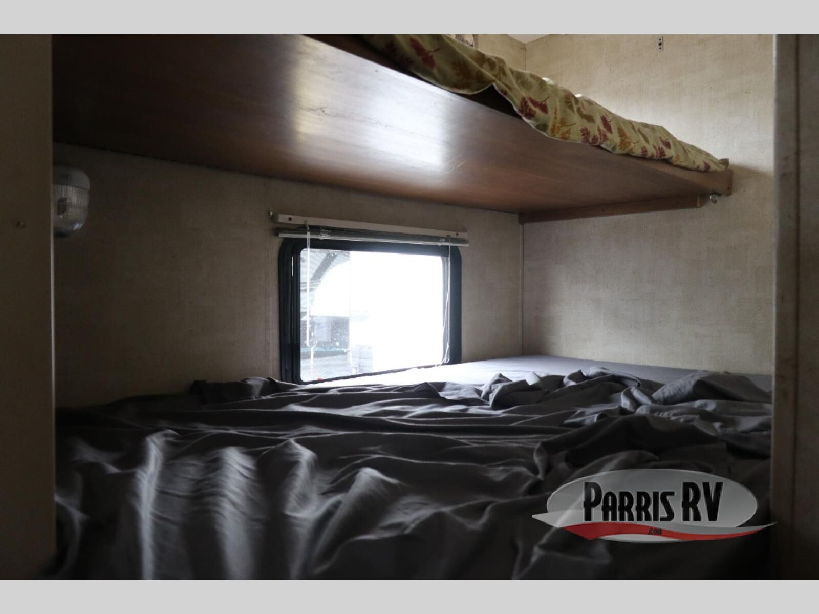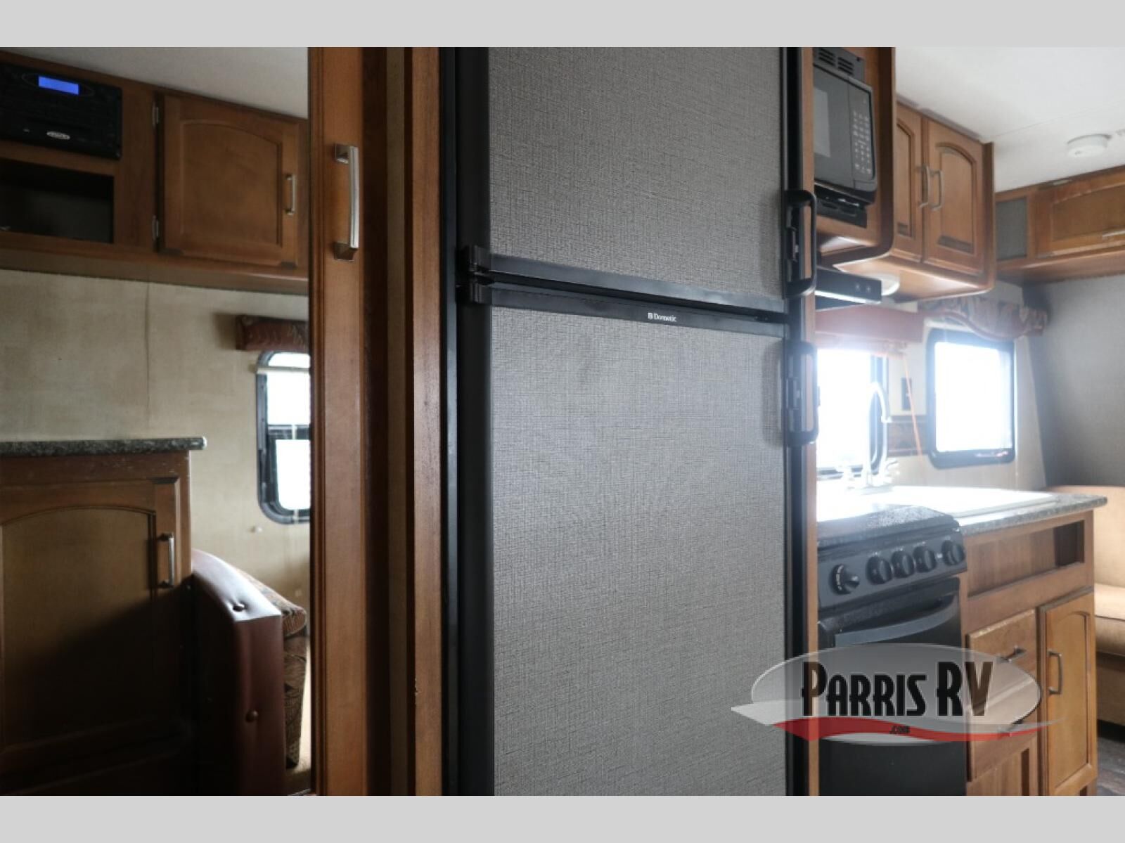 The booth dinette to the left of the entry door provides seating for meal time and also features an overhead cabinet for storing things. Across from the dinette there is a refrigerator, pantry, three burner range, double kitchen sink and counter extension making food prep and cooking a breeze.