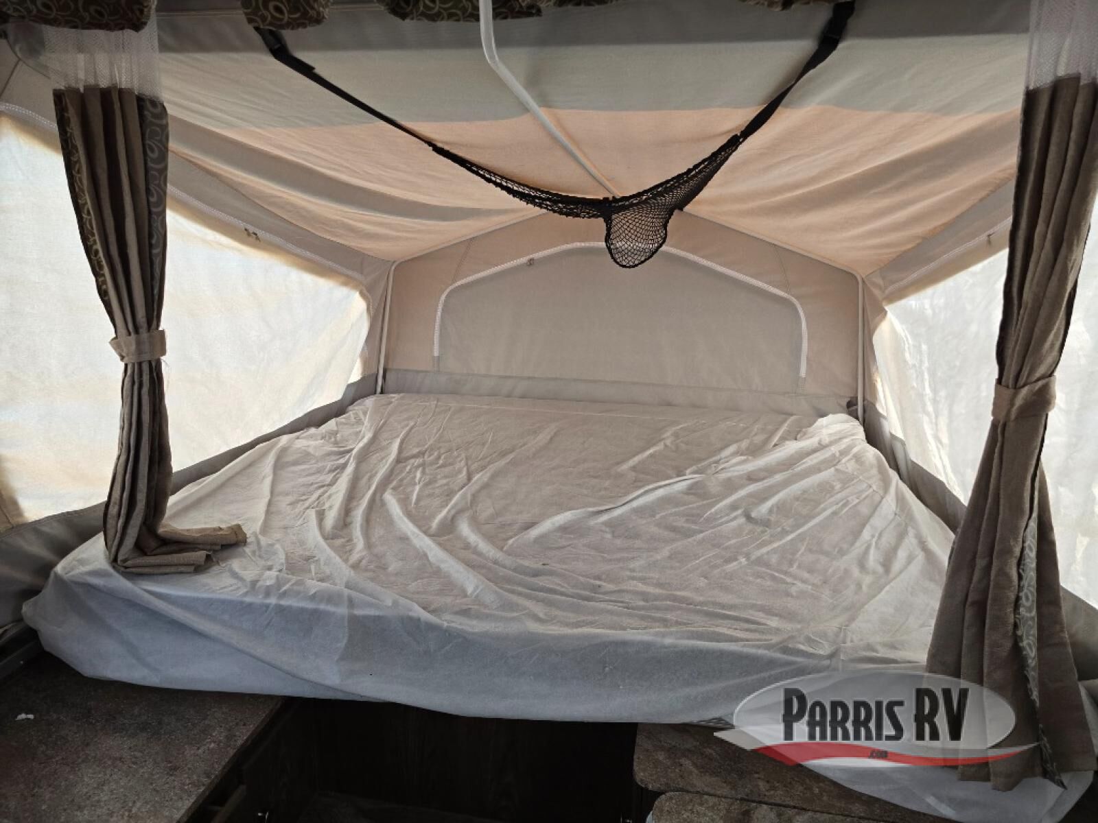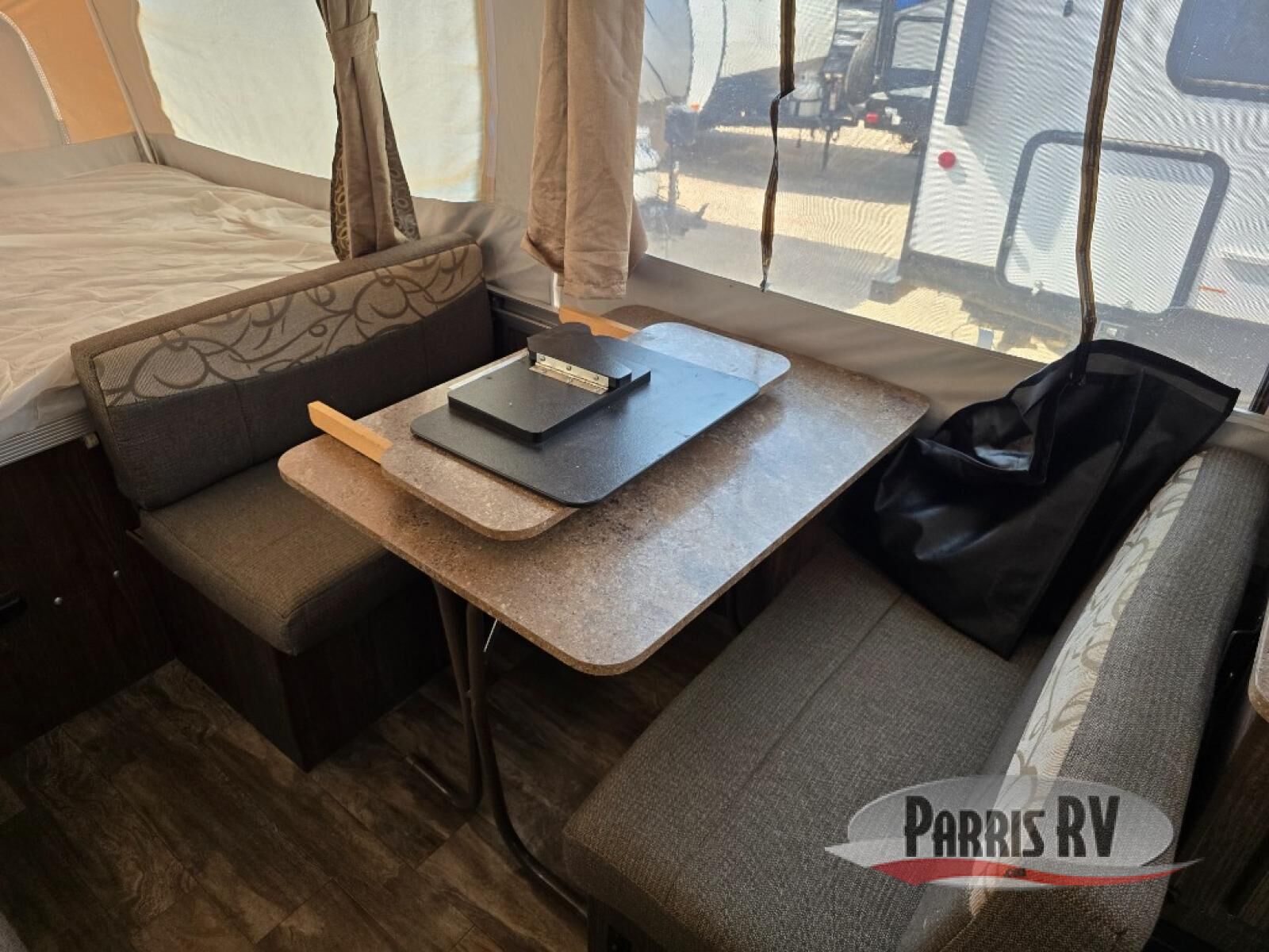 The front king and rear queen tent end beds offer comfortable sleeping. Inside you will find a gaucho/bed to the left. Along the opposite side, a booth dinette includes a table extension.