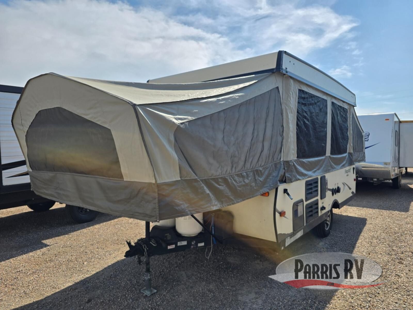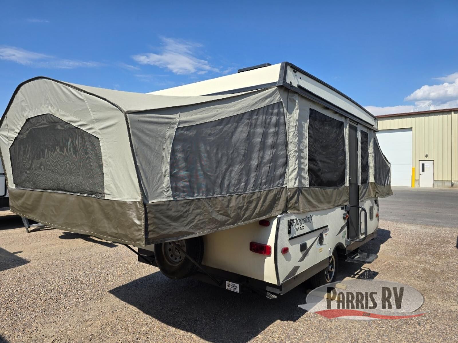 Forest River offers this Flagstaff MAC Series 228 folding pop-up camper with a guacho/bed, booth dinette, plus front and rear tent end beds.
