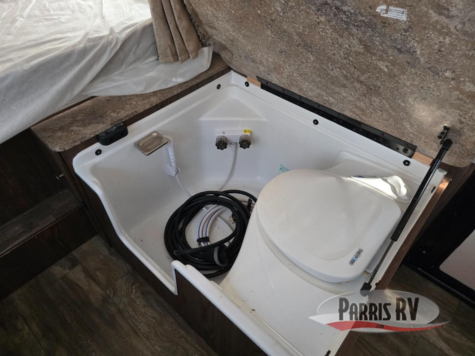 To the right of the entry, a cabinet is included. You may choose an optional shower and port-a-pottie with storage for even more of the conveniences of home.