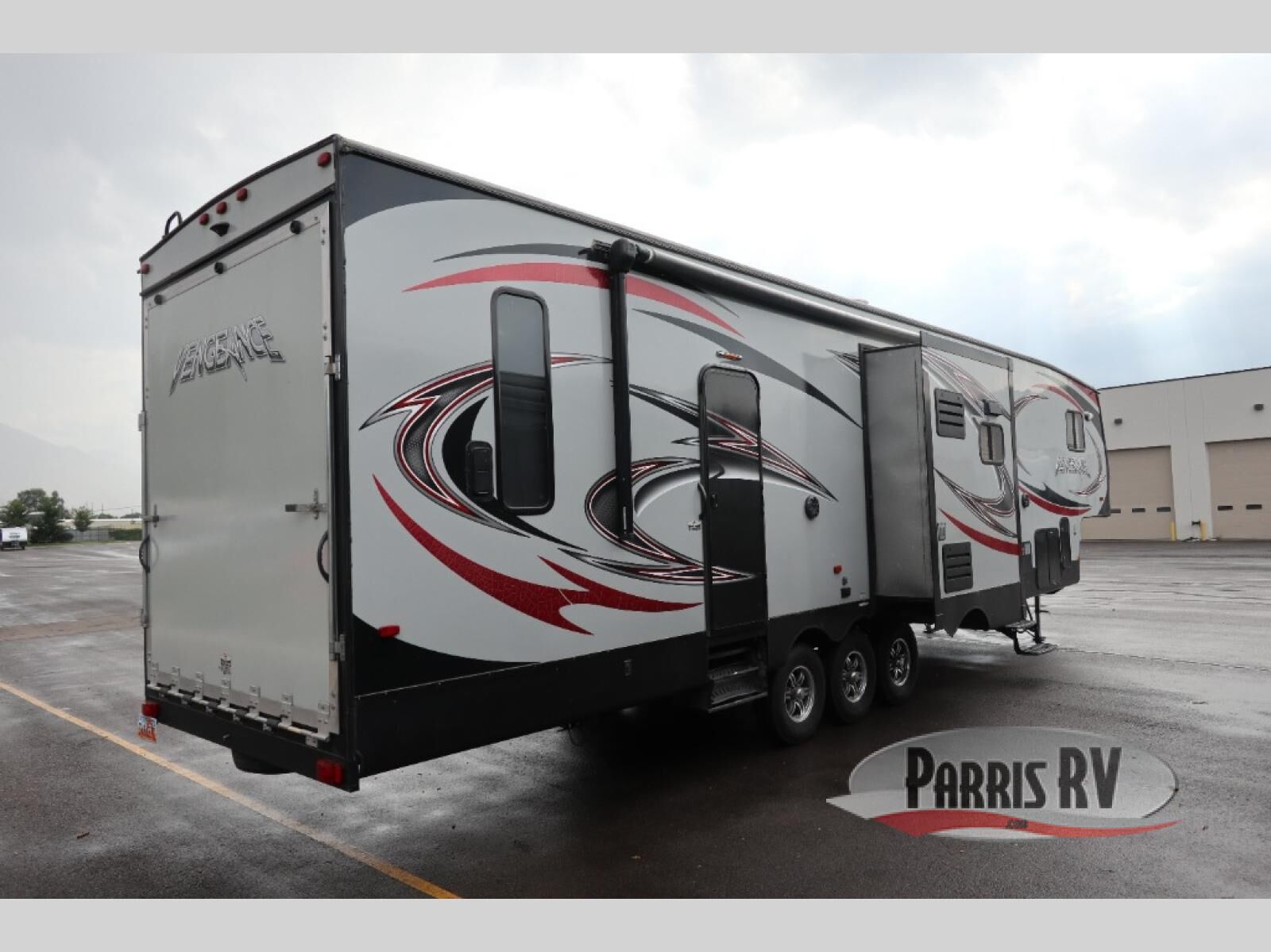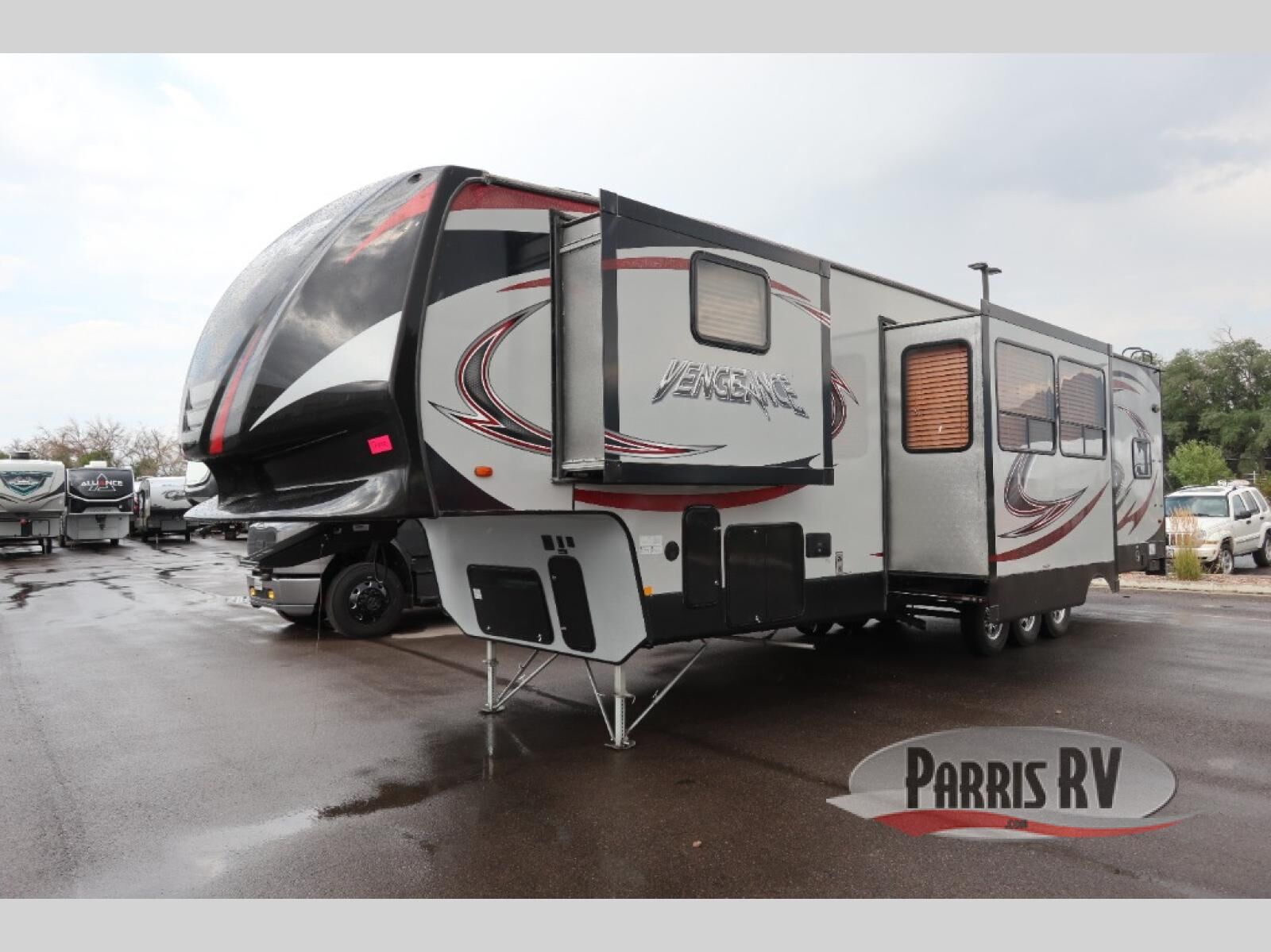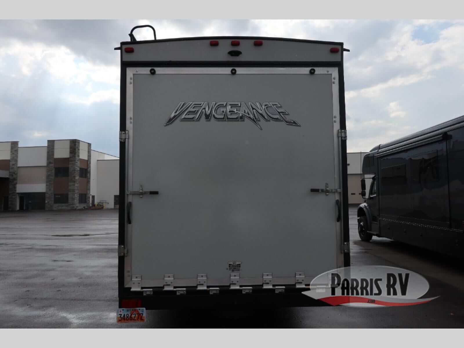The Vengeance 398V toy hauler fifth wheel by Forest River offers triple slides.