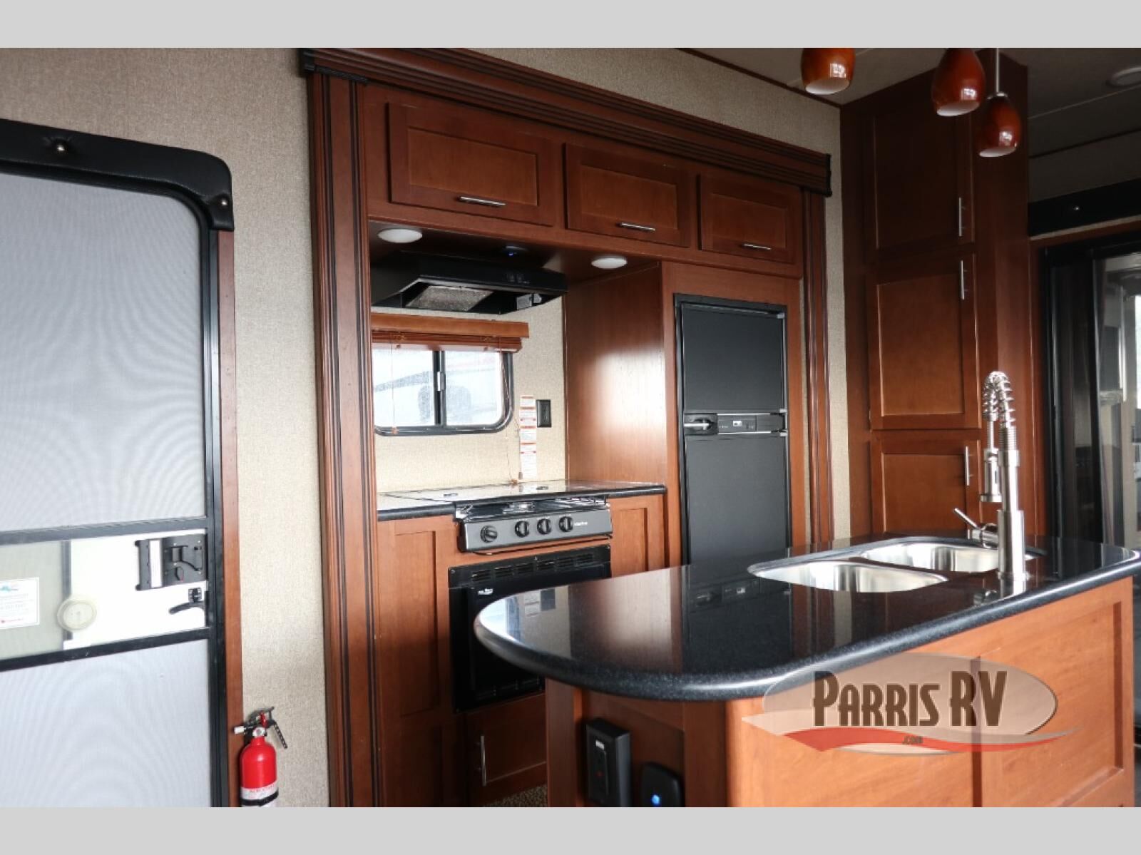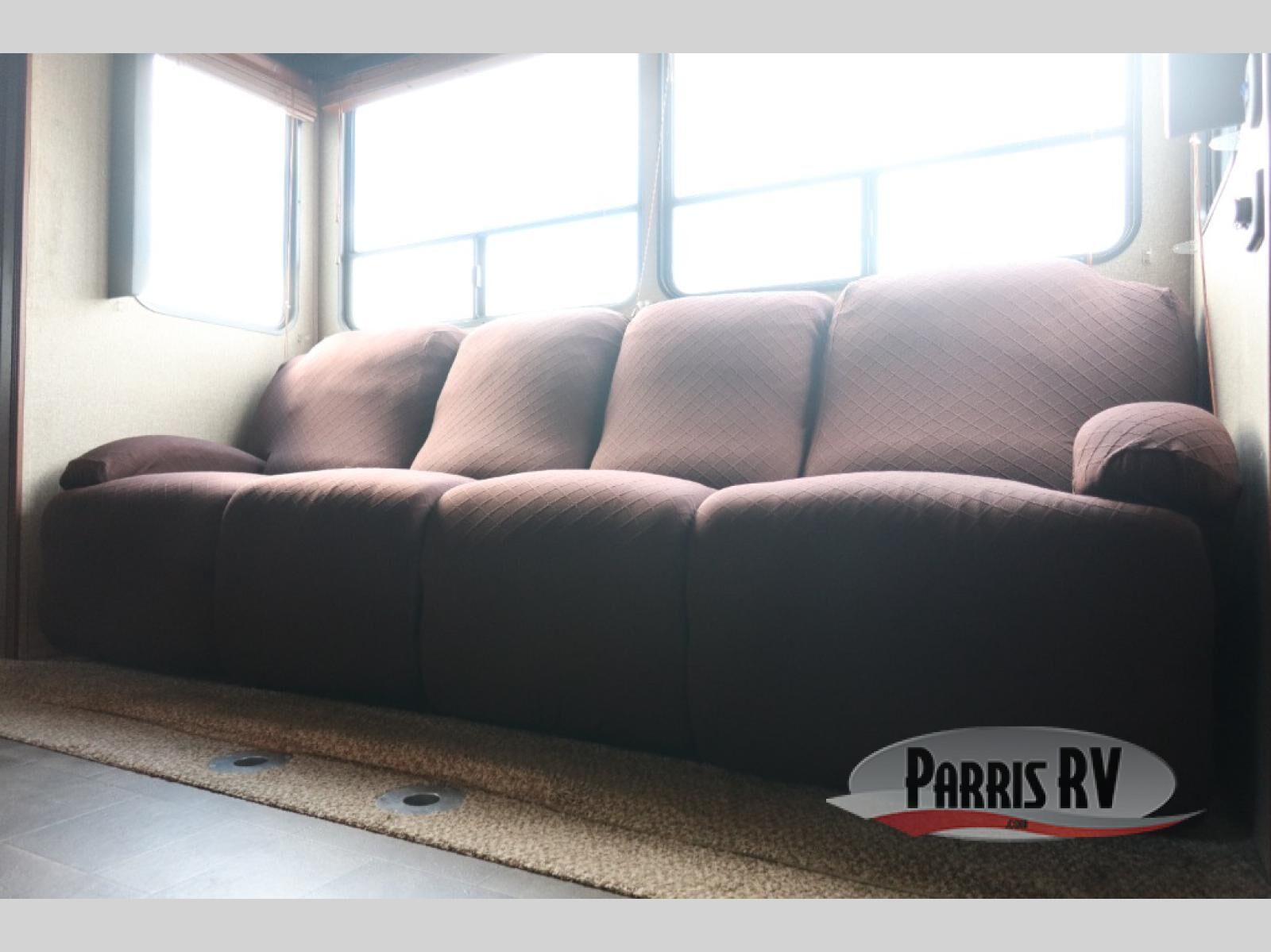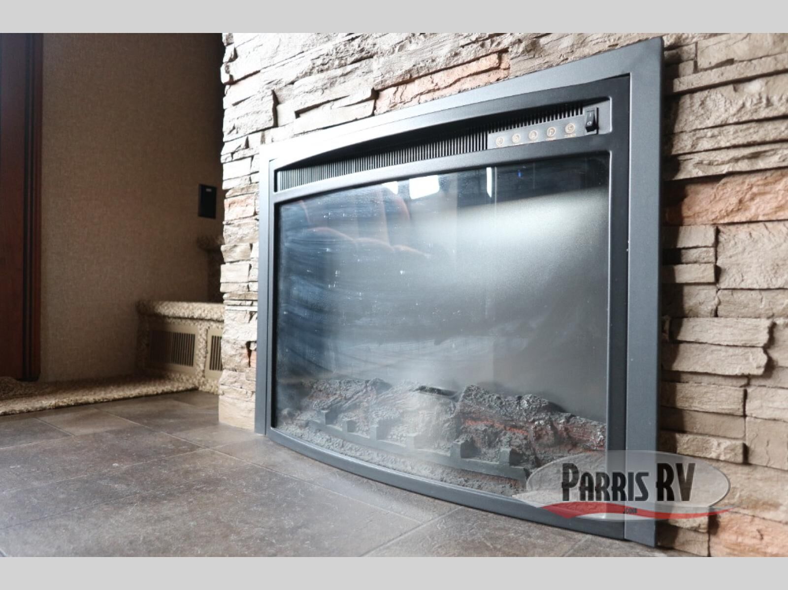 In the main living area there is a sofa slide with recliners. You will also find a pantry and another slide with a refrigerator, three burner range, and microwave. The kitchen island offers much counter space and a double kitchen sink. Along the front of the living area there is an entertainment center with a fireplace.